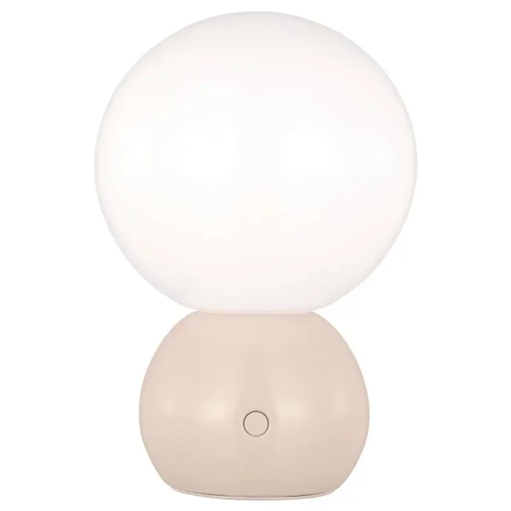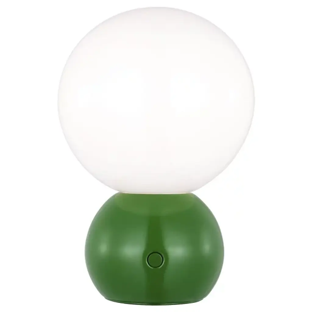 The Ovi table lamp artfully blends mid-century charm with contemporary elegance. An opal glass globe diffuses soft, ambient light, while sleek chrome accents add a touch of sophistication. The sculpted resin base, finished in lustrous color, offers striking contrast and visual intrigue.