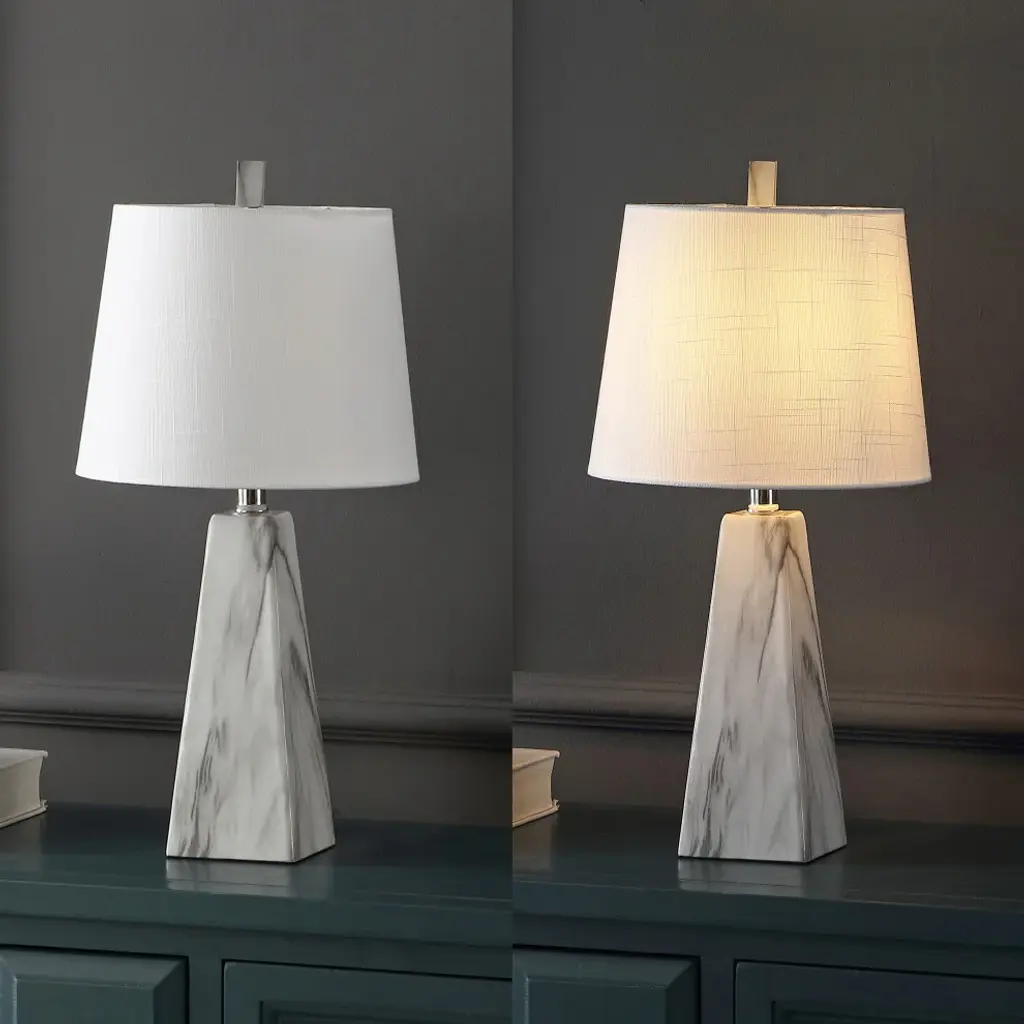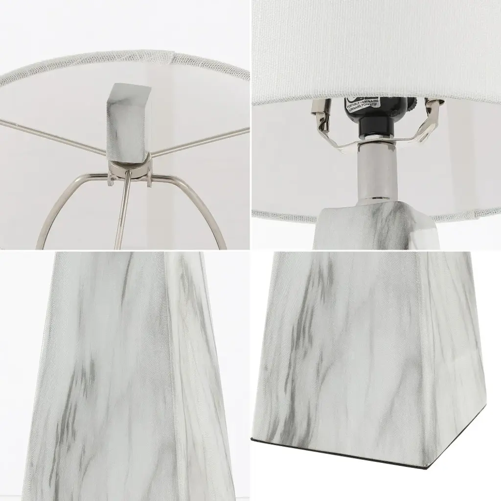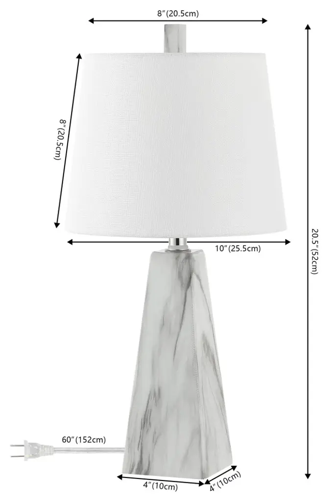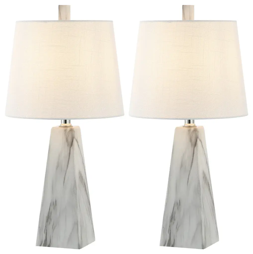Modern and eye catching, this chic table lamp features an elegant resin base in mixed shades of white and gray to create the effect of marble, but without the inconsistencies inherent in natural stone. This lux finish, coupled with the geometric faceted pyramid silhouette, evokes a modern interpretation of a neoclassical design. The white fabric shade diffuses soft light into any living space, in contrast to the geometric edges of the lower design and the lamp is topped with a matching marbleized resin finial.-Faceted sides are softened with the marble-effect of this resin lamp''s glaze details-The shade is made from 100% linen and is finished with a complementary finished finial -As found on classic antiques, the 60" cord is plastic-wrapped all the way to the plug-On-off rotary switch on socket-Eco-friendly 4W LED bulb included-Takes one bulb and compatible with any 9W LED or 40W TYPE "A" or 13W CFL-UL Listed -Color: White Marble Finish with White Shade-Body Material: Resin-Base Material: Resin-Finial Material: Resin-Finial Color: White Marble Finish-Harp Color: Silver-Includes: Two (2) lamps-Assembly Required-Lamp: 20.5 inches high x 10 inches wide x 10 inches deep-Shade: 8 inches high x 10 inches wide x 10 inches deepYou see a lamp.We see a decorative work of art.A perfectly curved shade casts a dramatic shadow on a floor. Compatible with LED lightbulbs: as easy on the environment as they are on the eyes. The JONATHAN Y Lighting collection considers every detail from impeccably sourced materials to designer styling. And our prices are so attractive, we''ve transformed a functional necessity into a fashion accessory.JONATHAN Y Lighting - a fashion revolution in home decor.