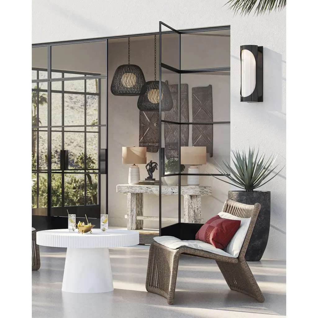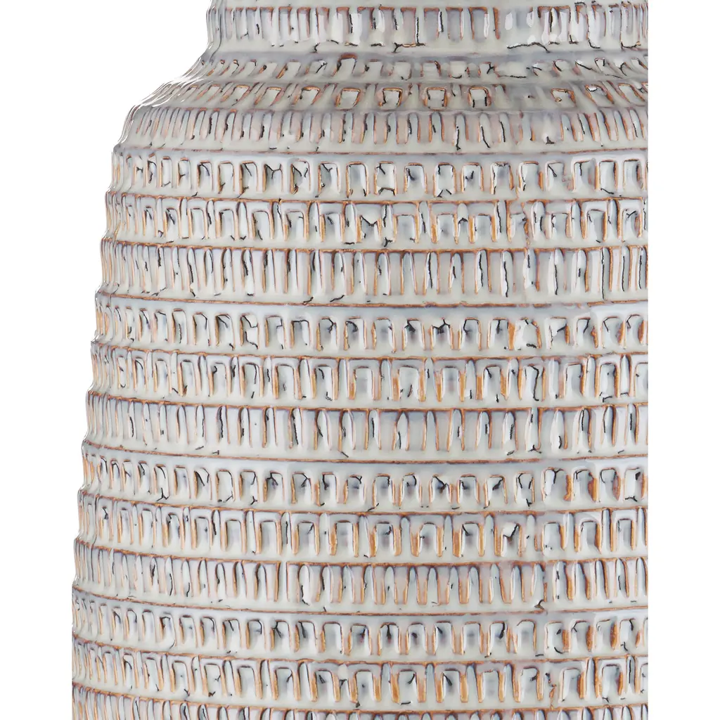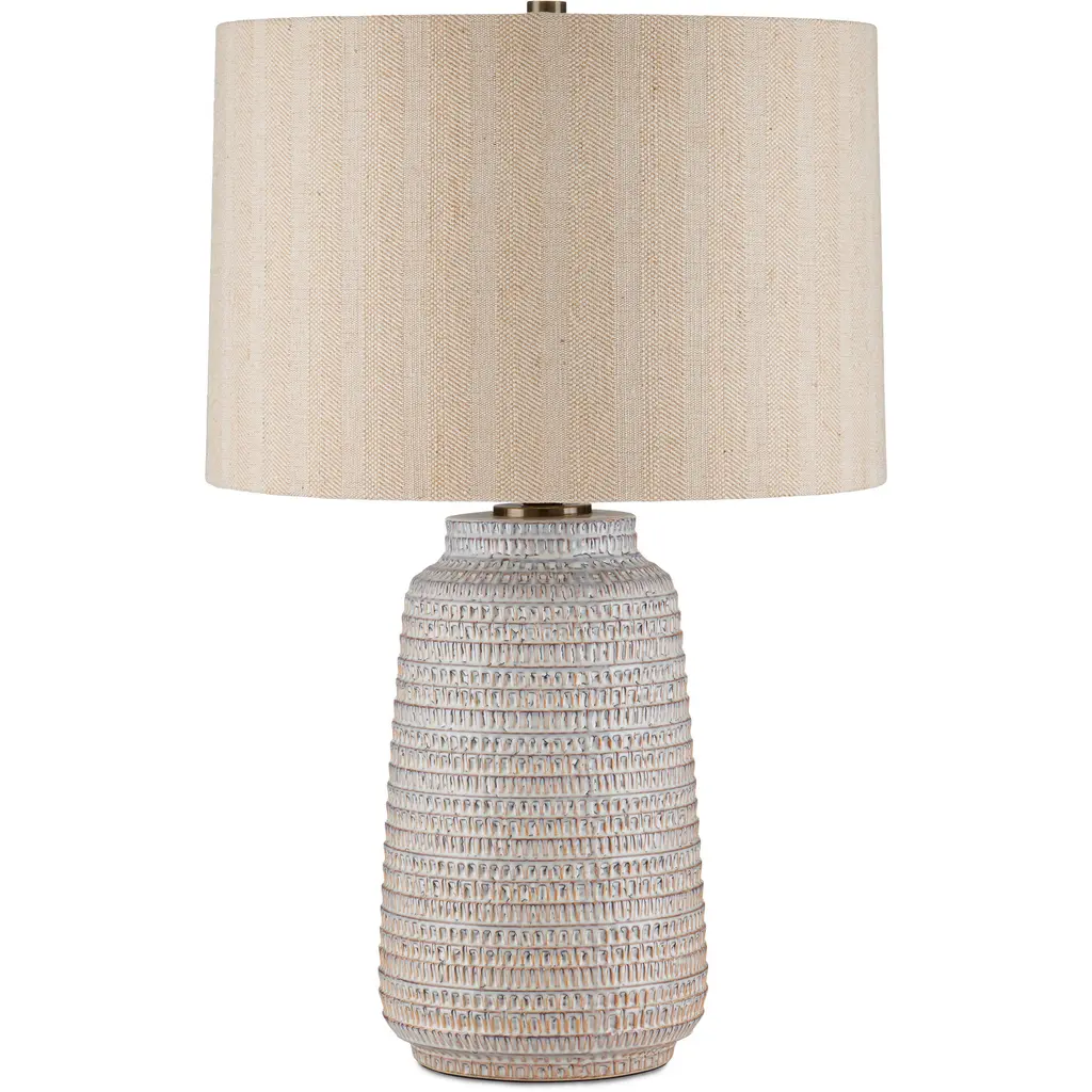 The Owen Table Lamp is made of ceramic with a tone-on-tone toothy pattern that is glazed in off-white and pale brown that creates a textural effect. Also contributing is the shade that has different patterns woven into it. The antique brass hardware and finial add to the warmth of this piece.