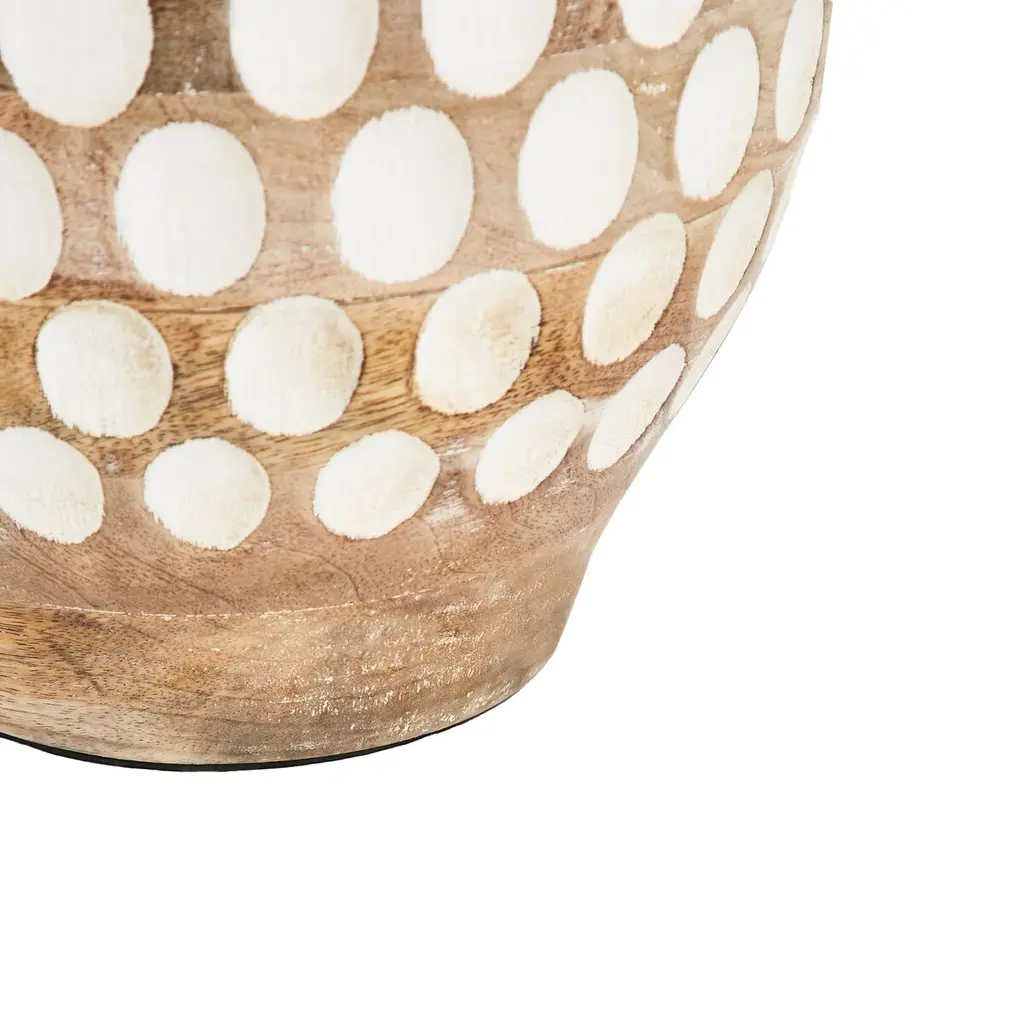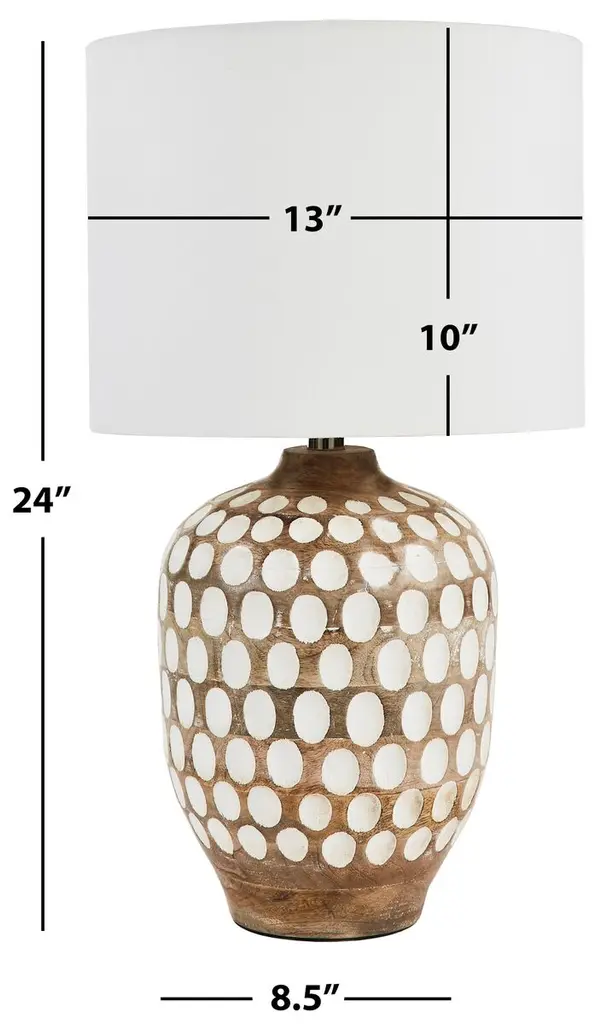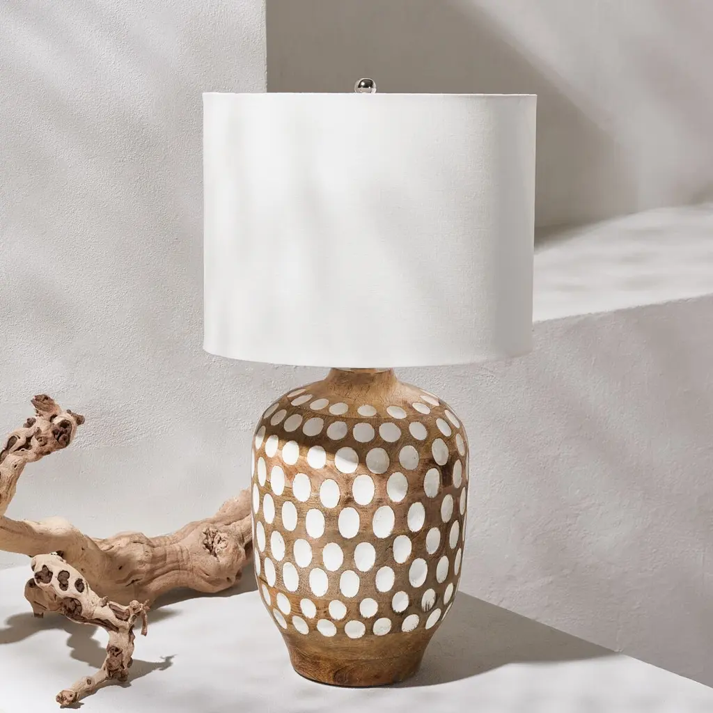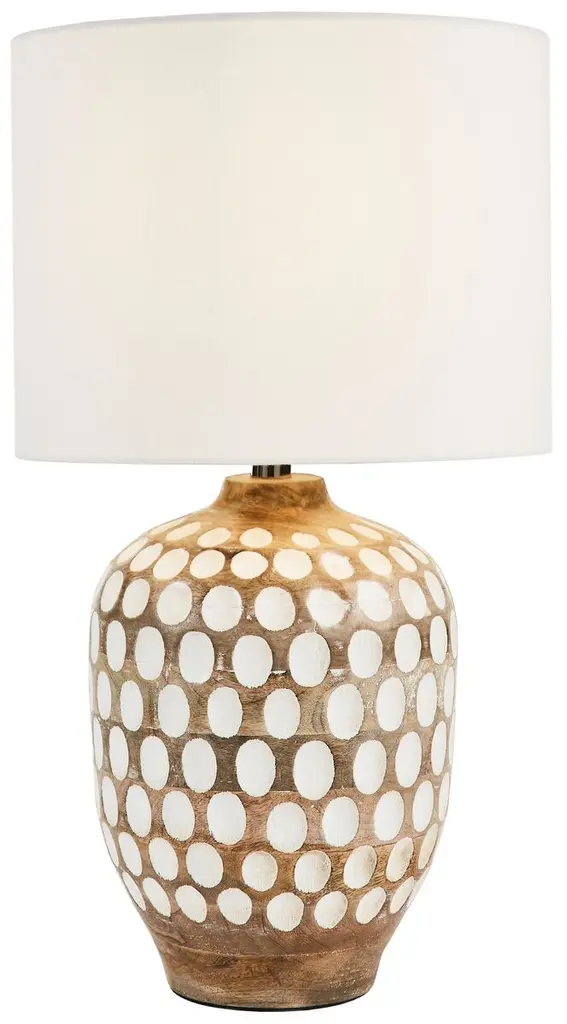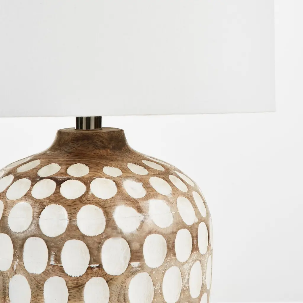 Dots carved into this table lamp's body are painted white to provide a cool contrast to the warm grain of the wood and accentuate its artisanal charm. The off-white cotton shade is a suitably understated finishing touch.