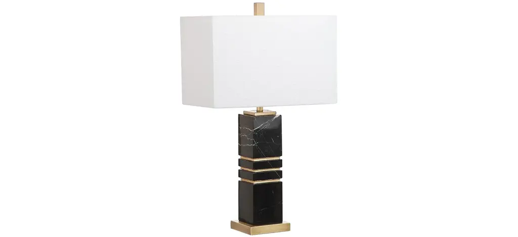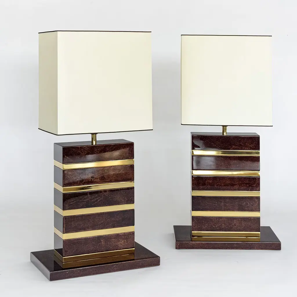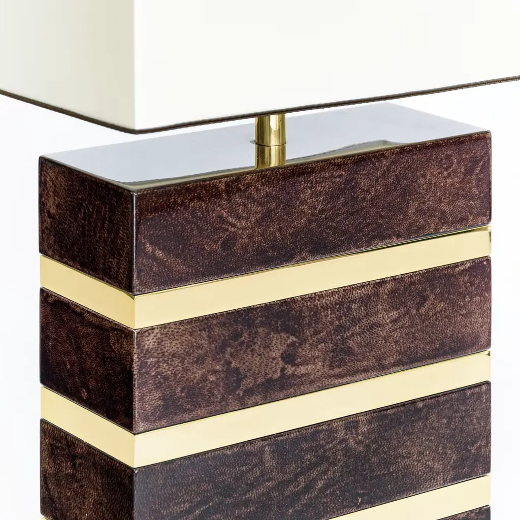 A marvelous timeless design and a testament to high-quality craftsmanship, this table lamp features a sophisticated shape distinguished by clean geometric lines. Boasting a white fabric lampshade, it rests on a unique base made of mona-colored parchment, enhanced with a glossy finish and brass details. Please consult the Concierge for further information.
