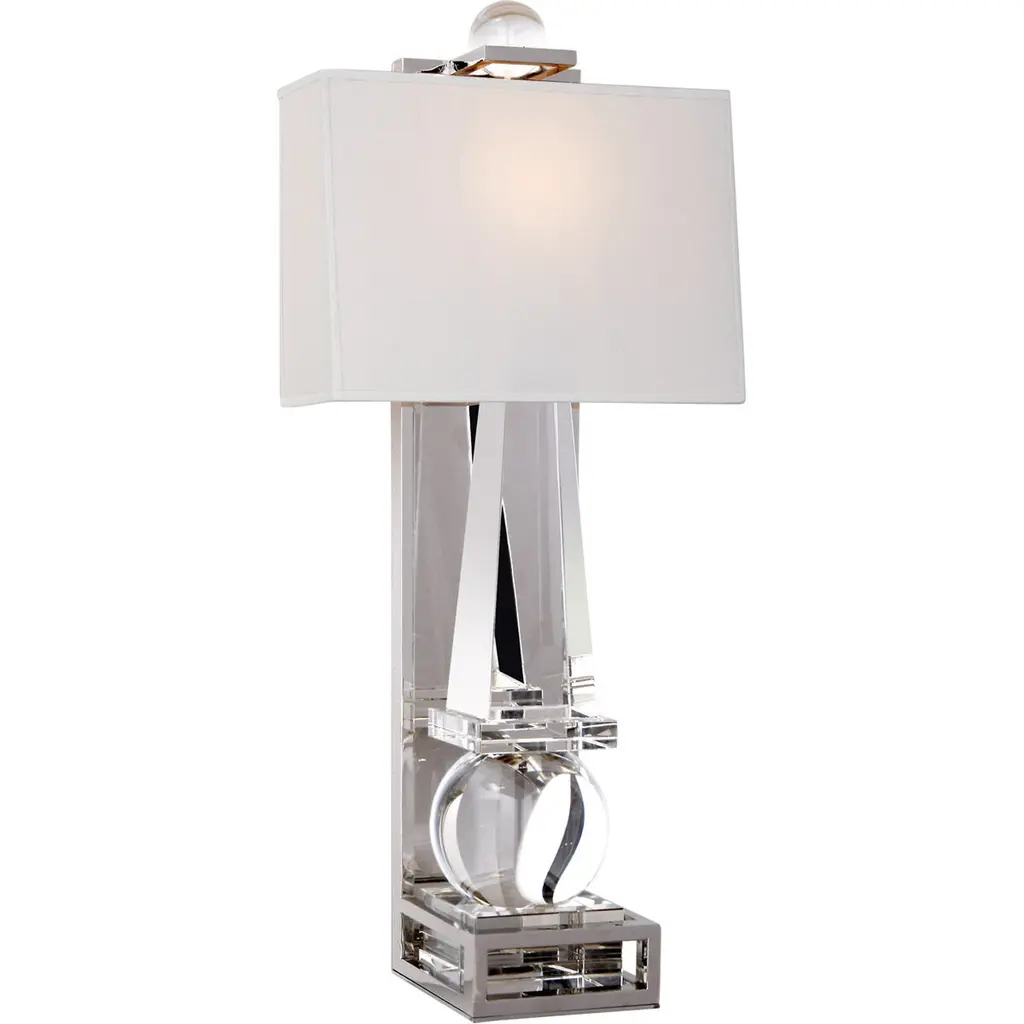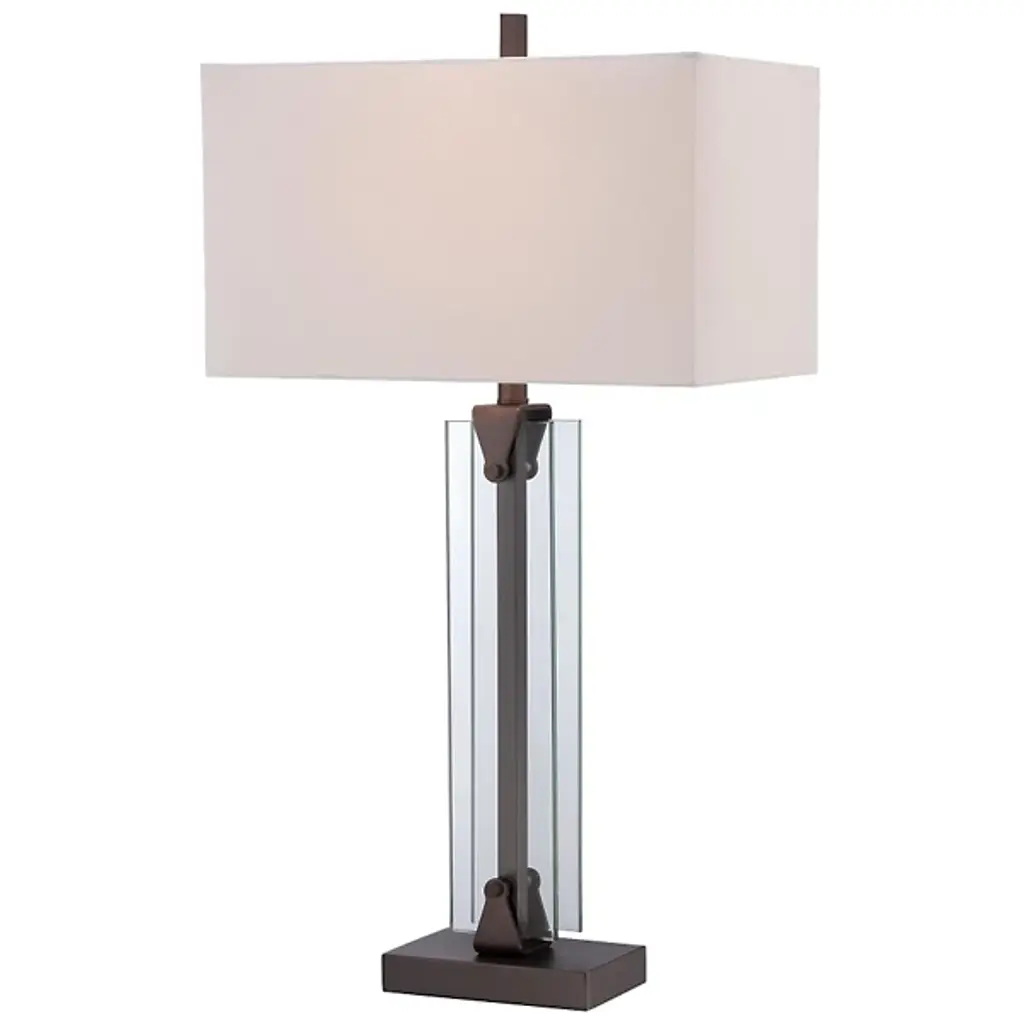The George Kovacs P1608 Table Lamp is a seemingly simple fixture with a contemporary twist. Having a traditional shape, the base of the lamp is emphasized with two Clear Glass Panels, adding striking contrast against the metallic finish and White Linen shade. The visible metal brackets on the top and bottom of the Glass Panels give the piece a slight industrial look while still being transitional in nature.
