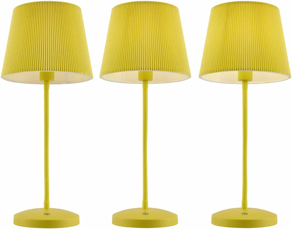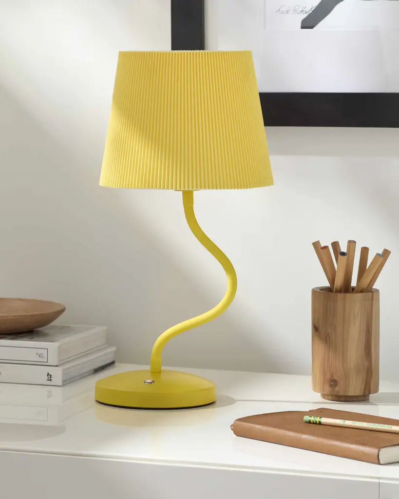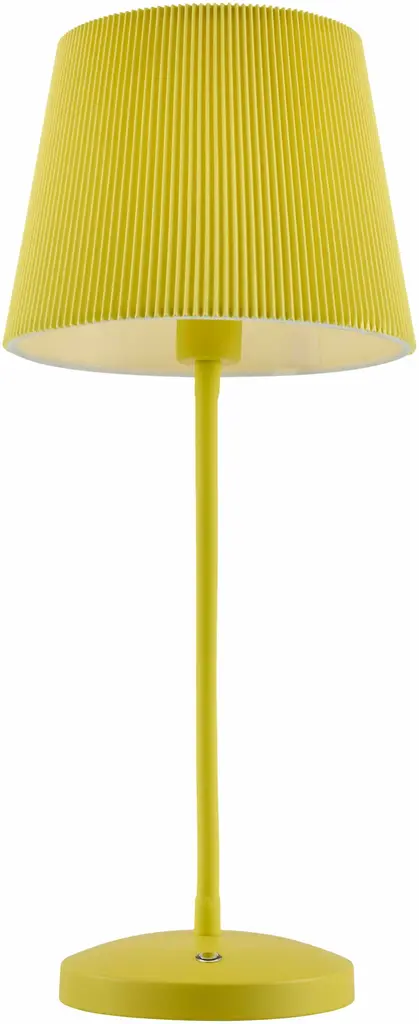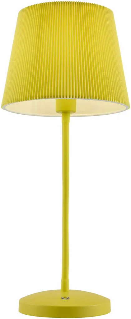 Collection: Pachiquita Colors: Yellow, White Material: Body: Iron, Plastic / Base: Iron / Shade (Outside): Polyester Styles: Contemporary Made In: China Lighting Type: Accent Table Lighting Base: Iron Base Color: Bright Yellow Shade Material: Polyester Shade Color: White, Bright Yellow Cord Length: 0' Switch Type: Dimmer Number of Bulbs: 1 Socket Type: E-12 Bulb Wattage: 7W