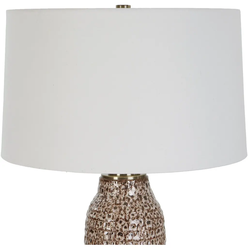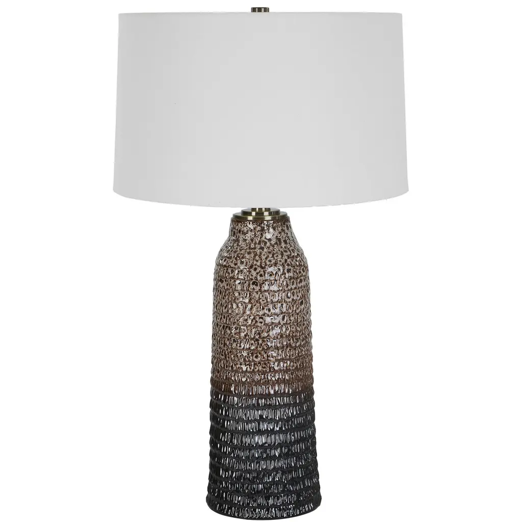 This Table Lamp Displays A Unique, Organic Feel With A Carved Ceramic Base Finished In A Mottled Ombre Effect From Aged Ivory Down To Dark Chocolate, Accented With Plated Brushed Brass Details. Paired With A Tapered Hardback Drum Shade Covered In A Casual White Linen Fabric.