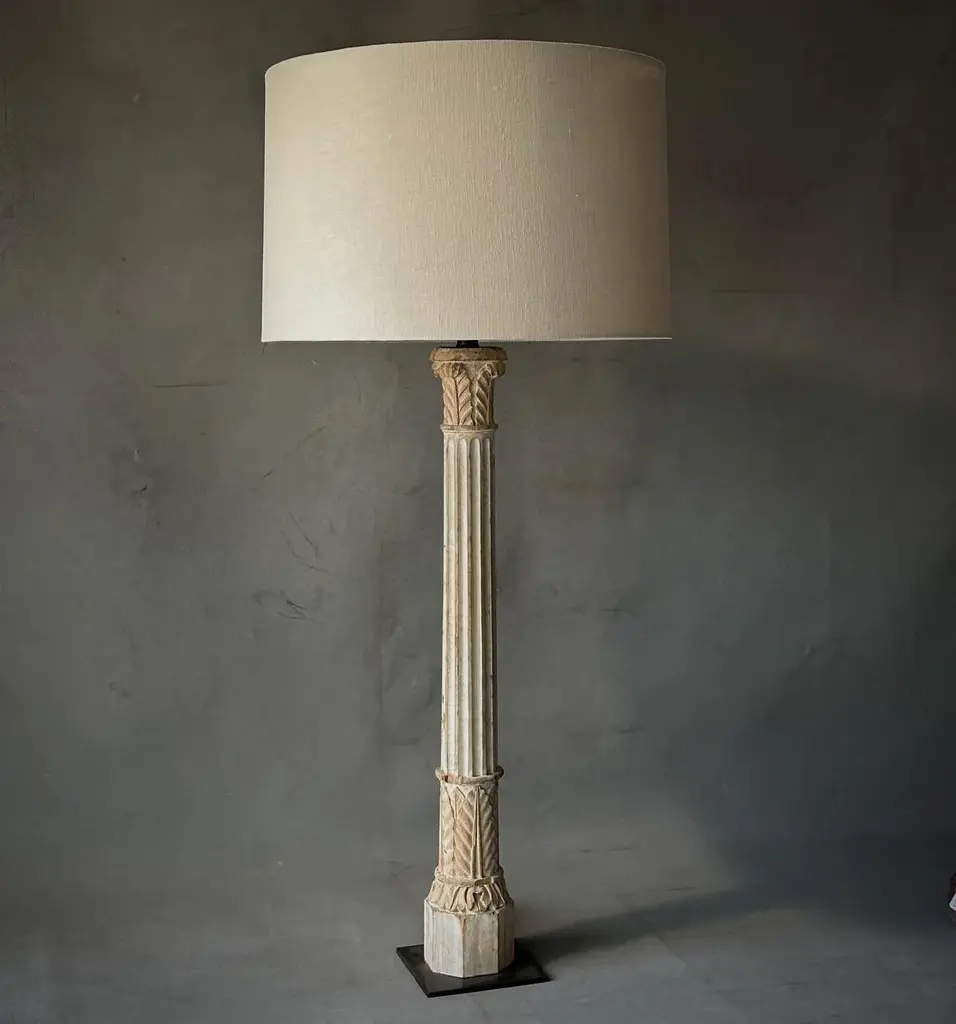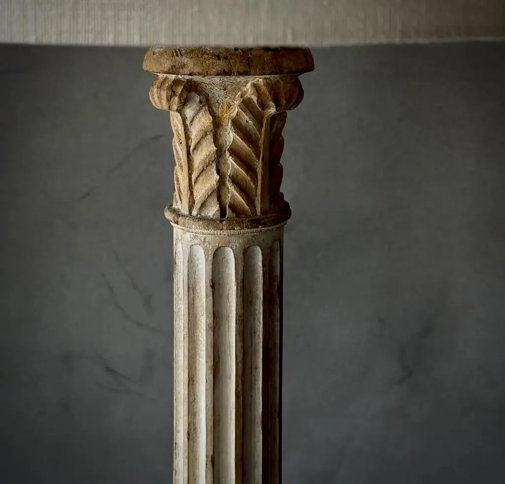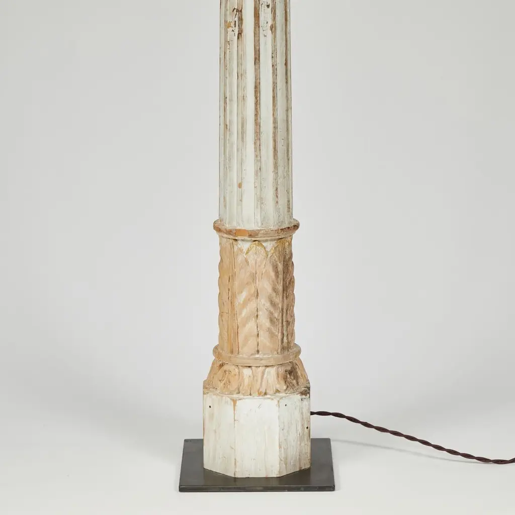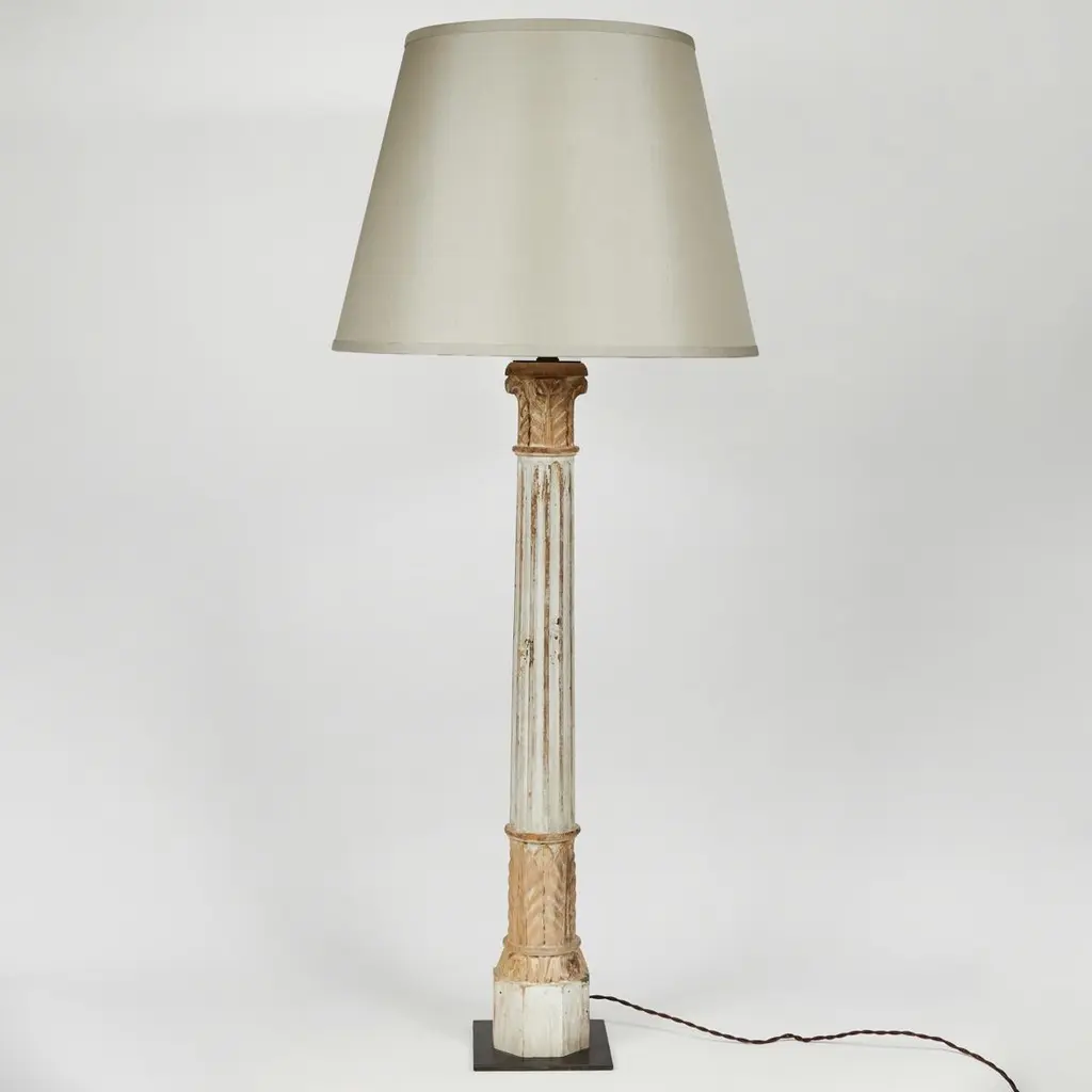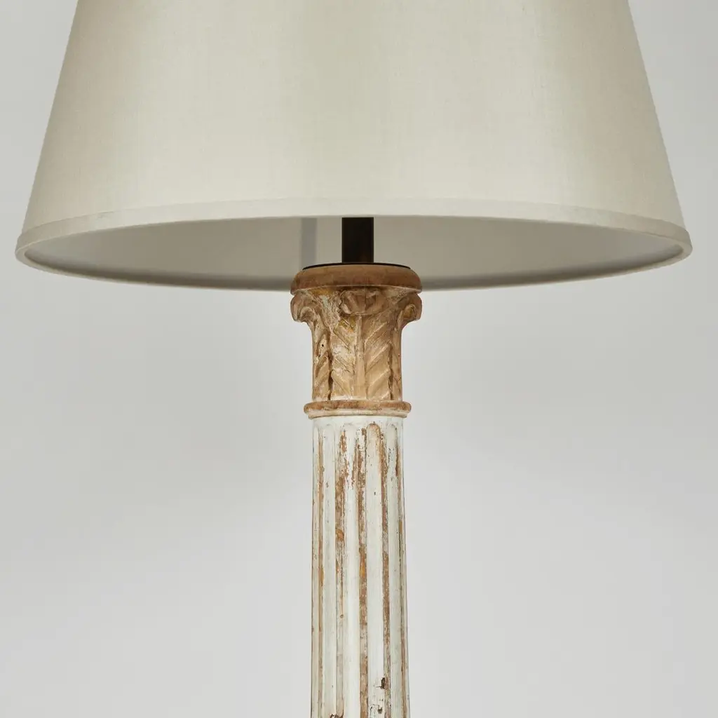 This 19th-century French column lamp, crafted from rustic white-painted wood, is adorned with elegant acanthus leaf carvings. The detailed artwork and a custom linen shade make it not only a source of light but a piece of art that brings a classic touch to any interior.France, circa 1880Dimensions: 6W x 18D x 44H
