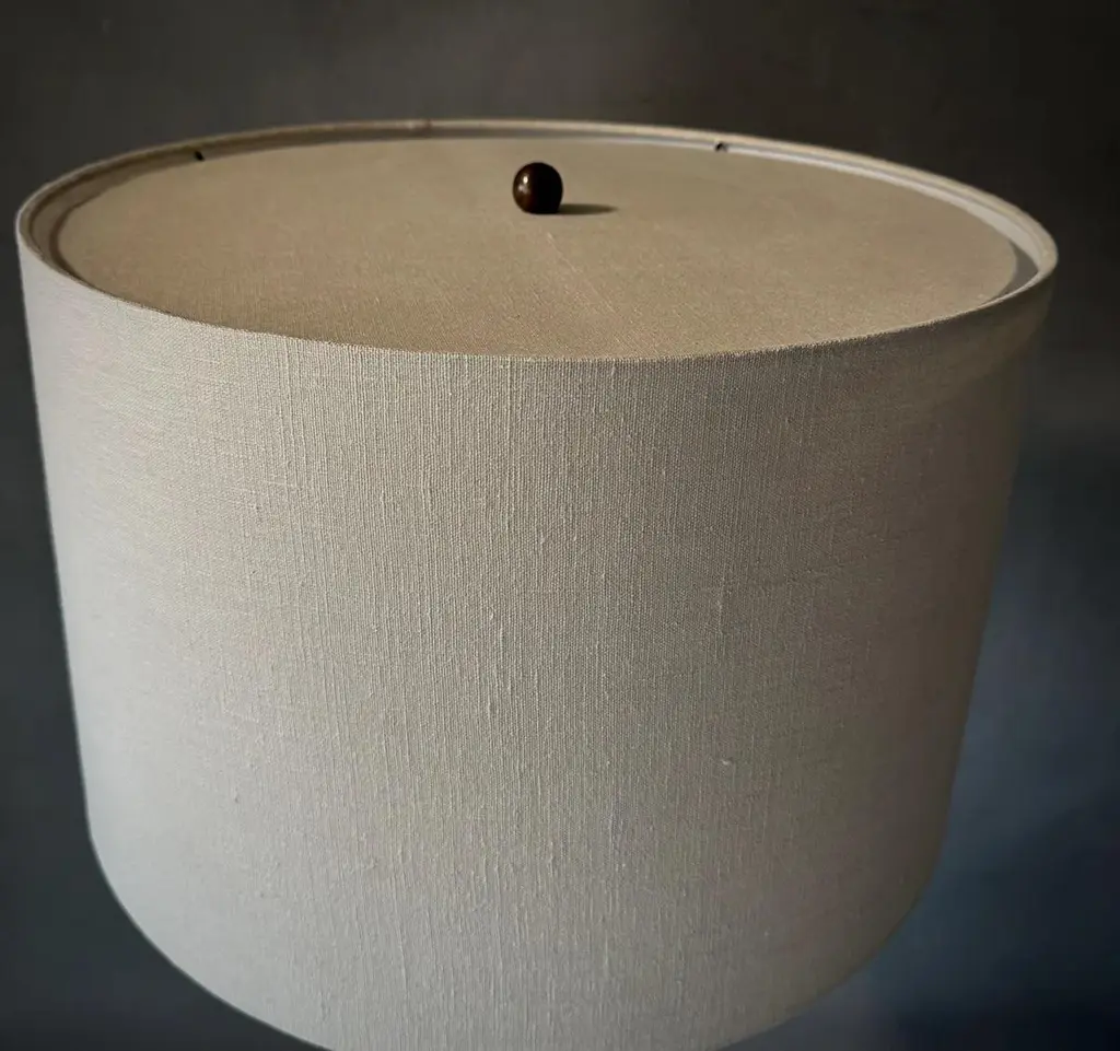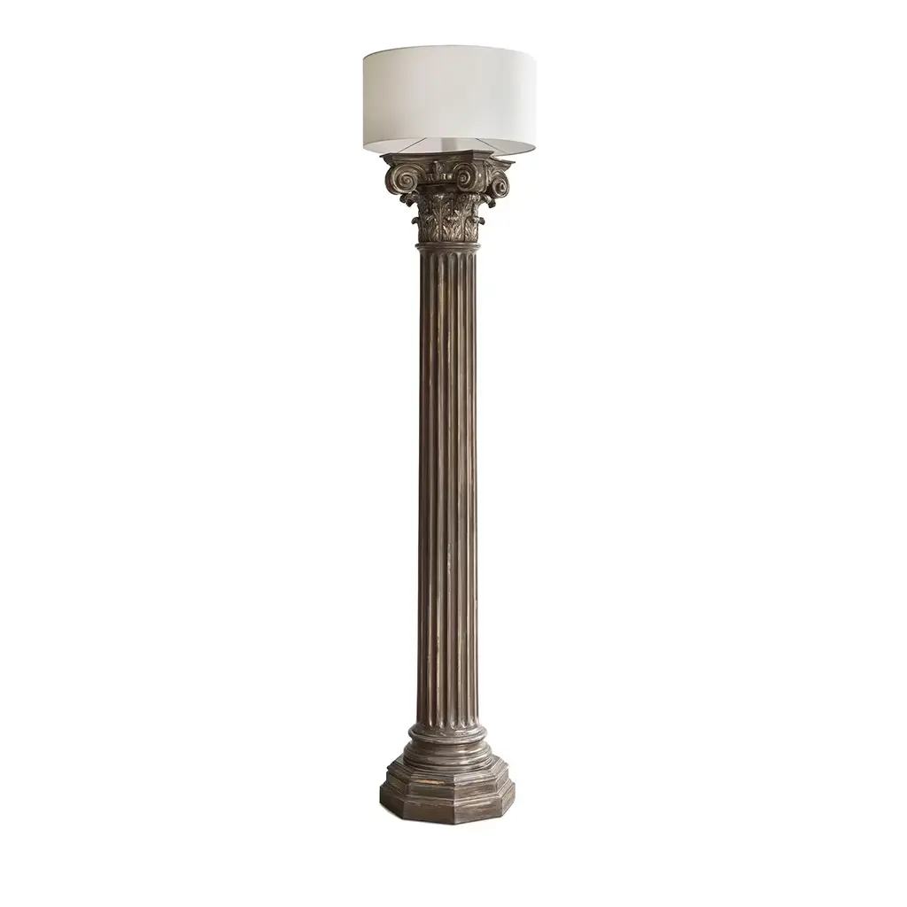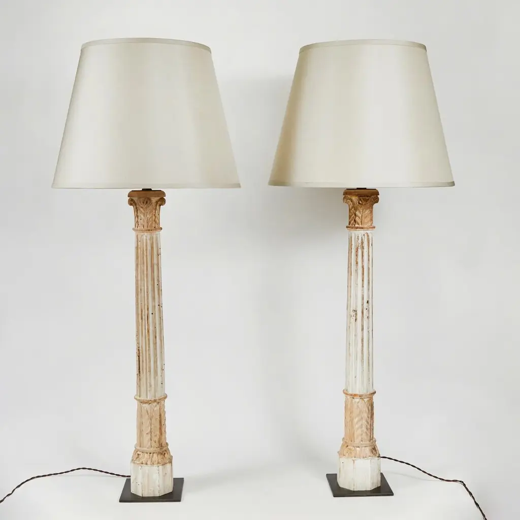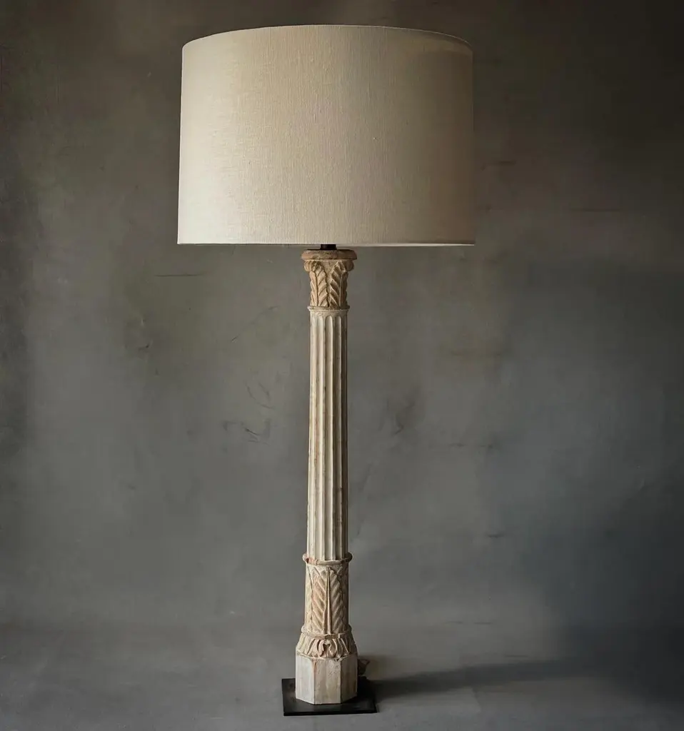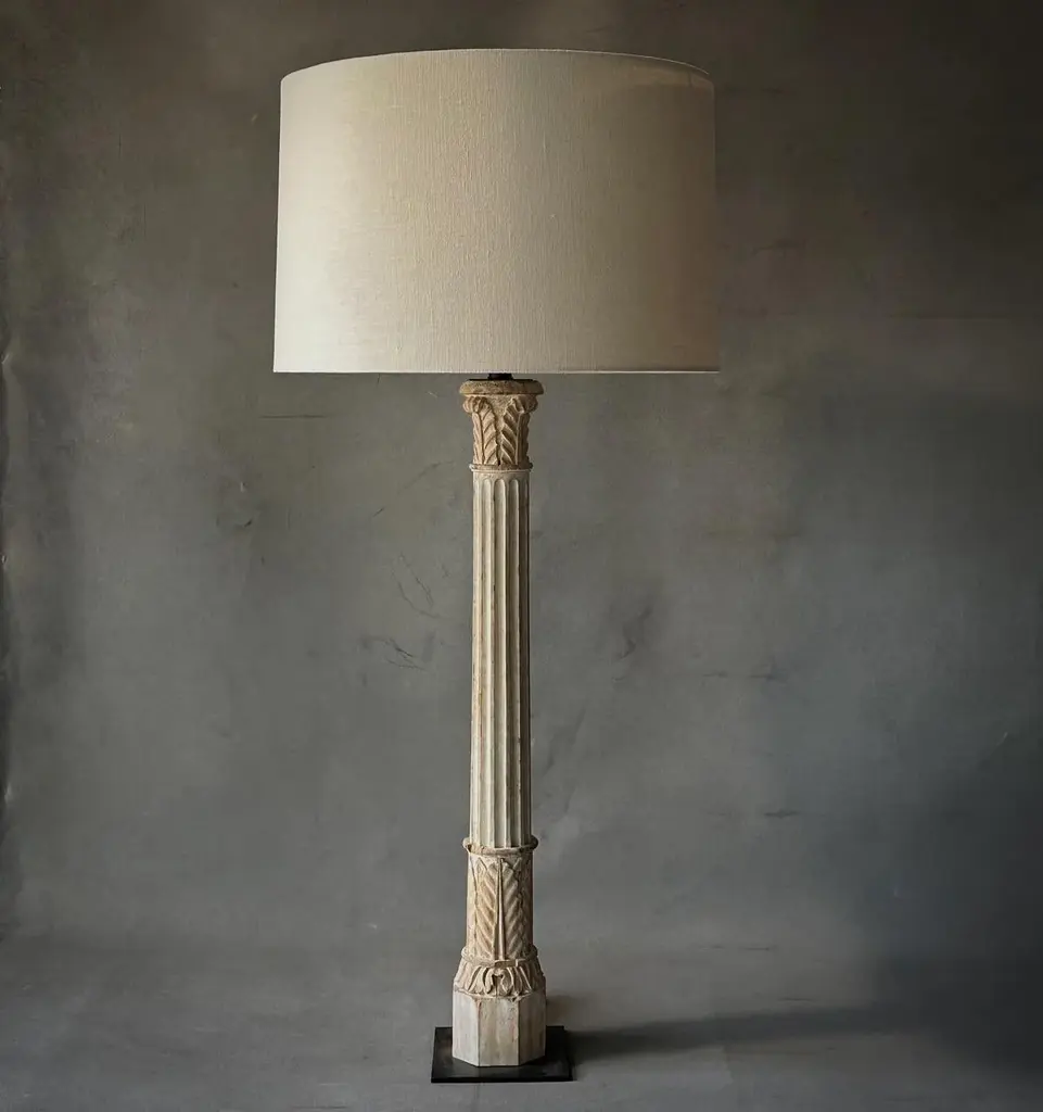 This 19th-century French column lamp, crafted from rustic white-painted wood, is adorned with elegant acanthus leaf carvings. The detailed artwork and a custom linen shade make it not only a source of light but a piece of art that brings a classic touch to any interior.France, circa 1880Dimensions: 6W x 18D x 44H