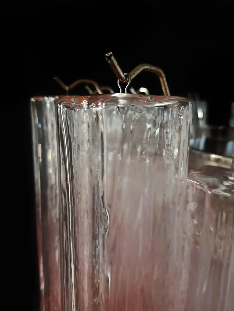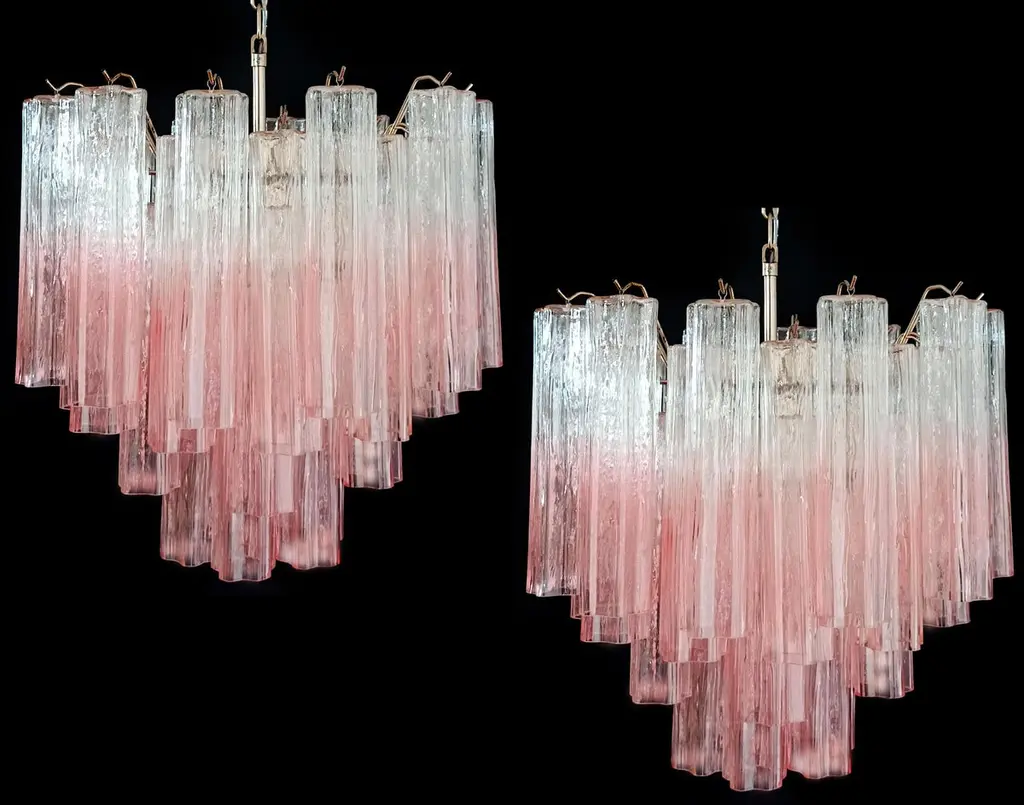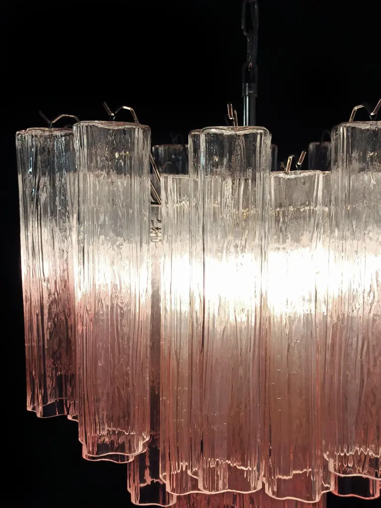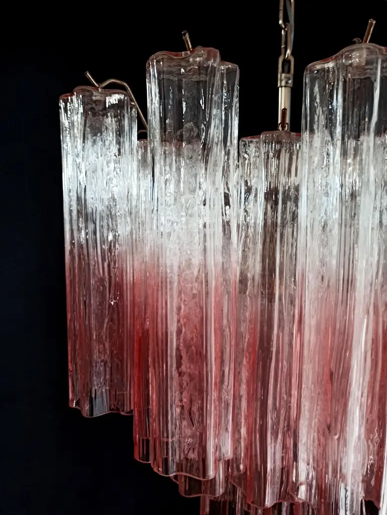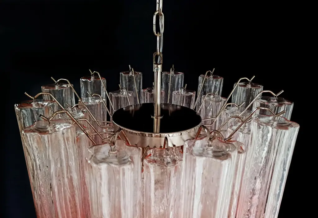 Pair Italian vintage chandeliers in Murano glass and nickel-plated metal structure. The armor polished nickel supports 36 large shaded pink glass tubes in a star shape.Period:late XX centuryDimensions: 50,40 inches (128 cm) height with chain; 21,30 inches (55 cm) height without chain; 22,85 inches (58 cm) diameter.Dimension glasses: 11,60 inches30 cm) height; 2,75 inches (7 cm) diameterLight bulbs: 7 light bulbs: 274 dimension (not included in the sale) - - On request we can replace the lampholders with those suitable for the American electrical system.Condition:Perfect condition and fully working. The metal structure has been perfectly restored and is therefore in very good condition, only small signs of oxidation.