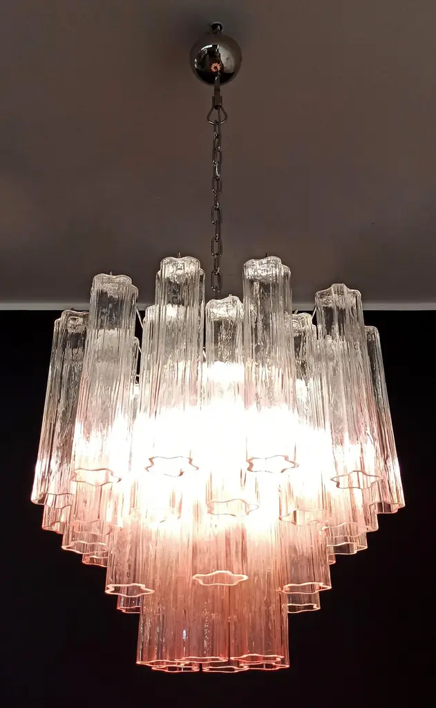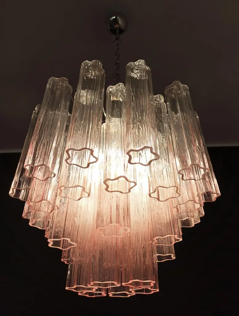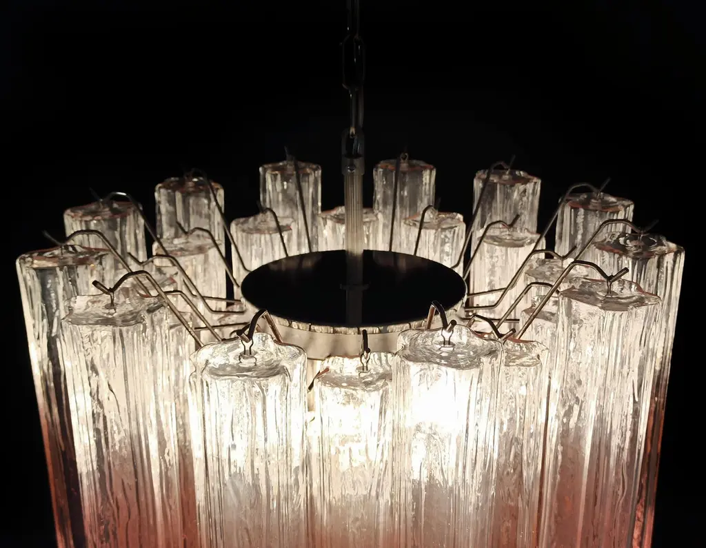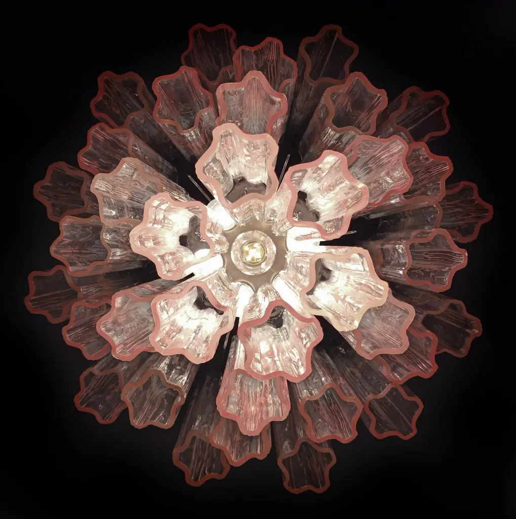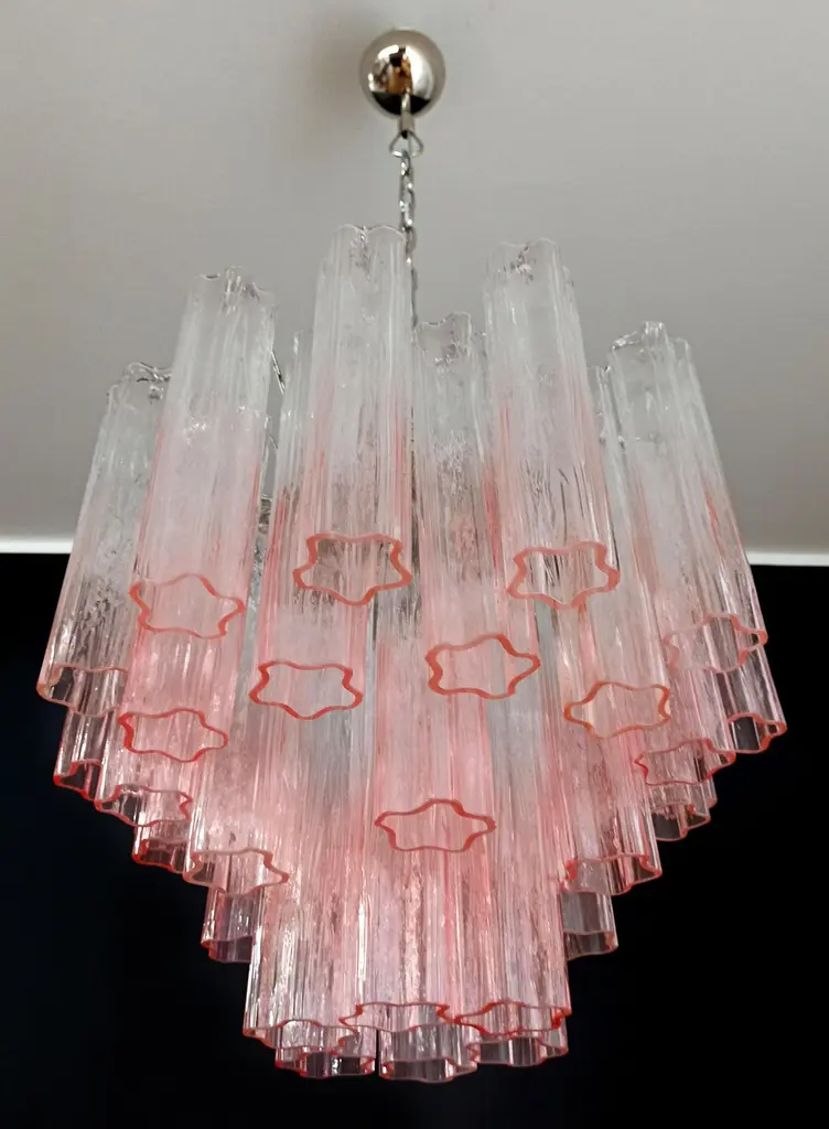 Pair Italian vintage chandeliers in Murano glass and nickel-plated metal structure. The armor polished nickel supports 36 large shaded pink glass tubes in a star shape.Period:late XX centuryDimensions: 50,40 inches (128 cm) height with chain; 21,30 inches (55 cm) height without chain; 22,85 inches (58 cm) diameter.Dimension glasses: 11,60 inches30 cm) height; 2,75 inches (7 cm) diameterLight bulbs: 7 light bulbs: 274 dimension (not included in the sale) - - On request we can replace the lampholders with those suitable for the American electrical system.Condition:Perfect condition and fully working. The metal structure has been perfectly restored and is therefore in very good condition, only small signs of oxidation.