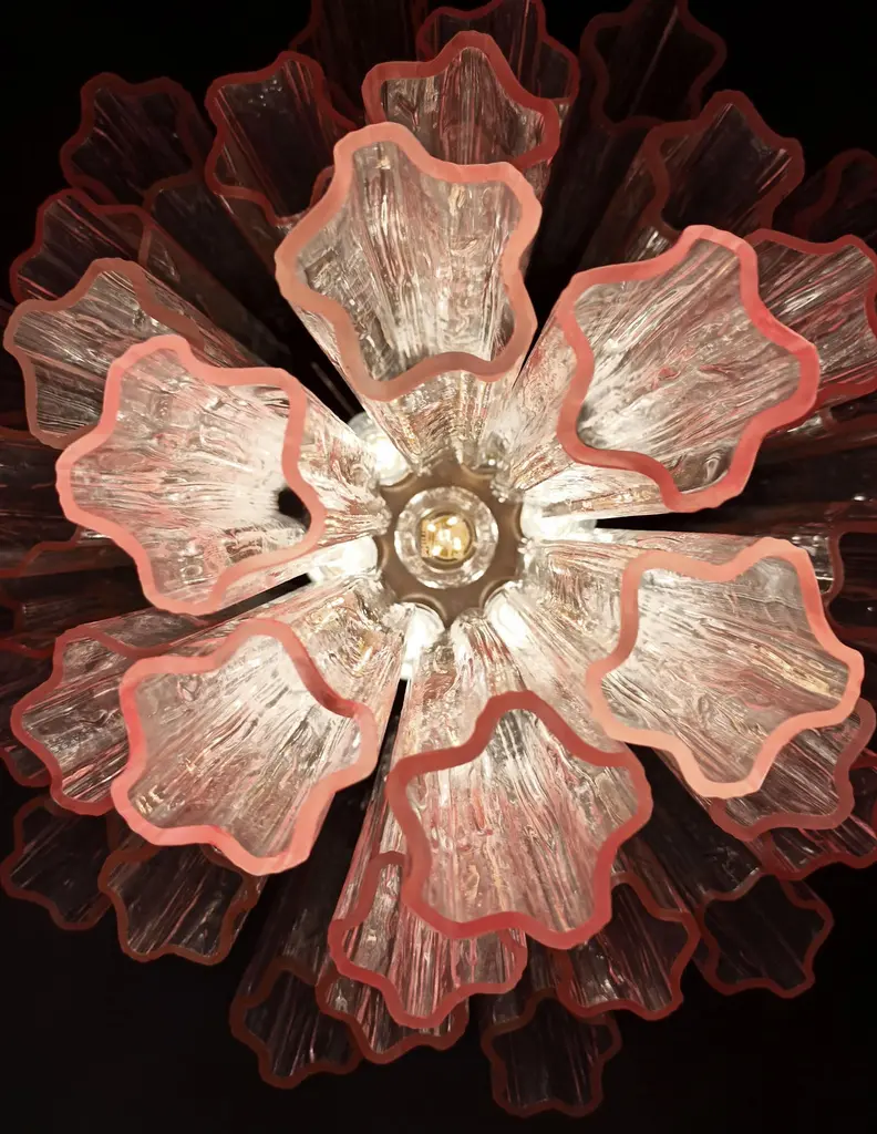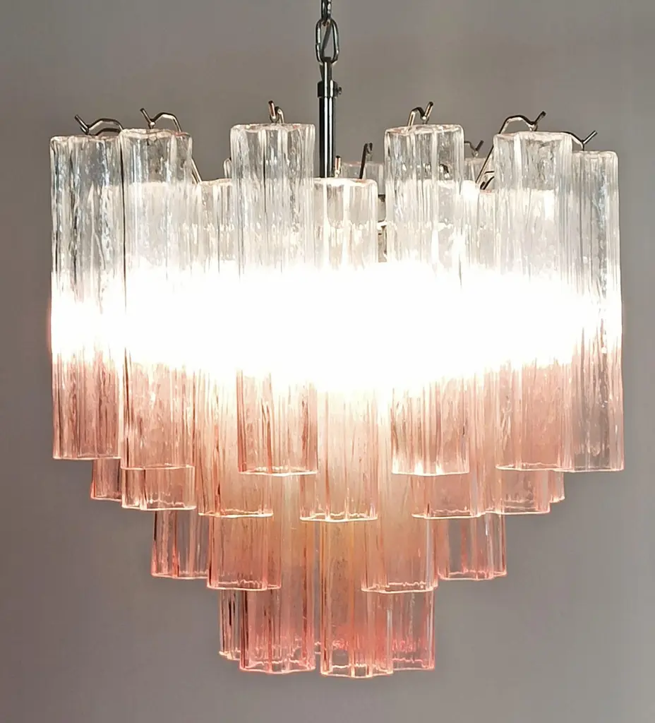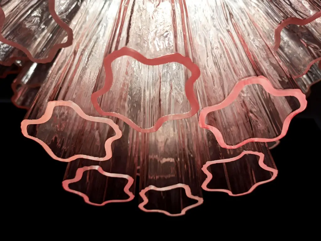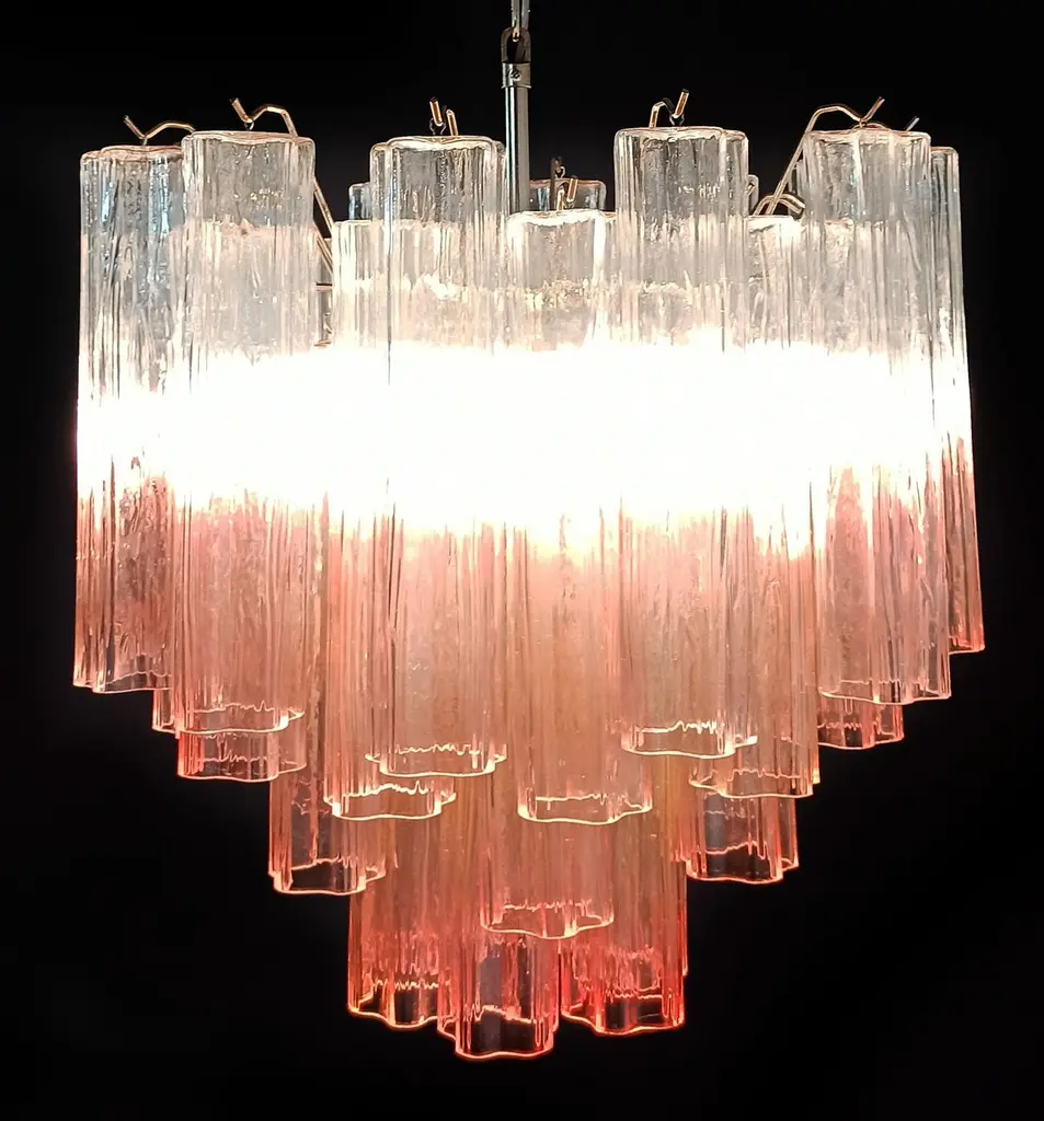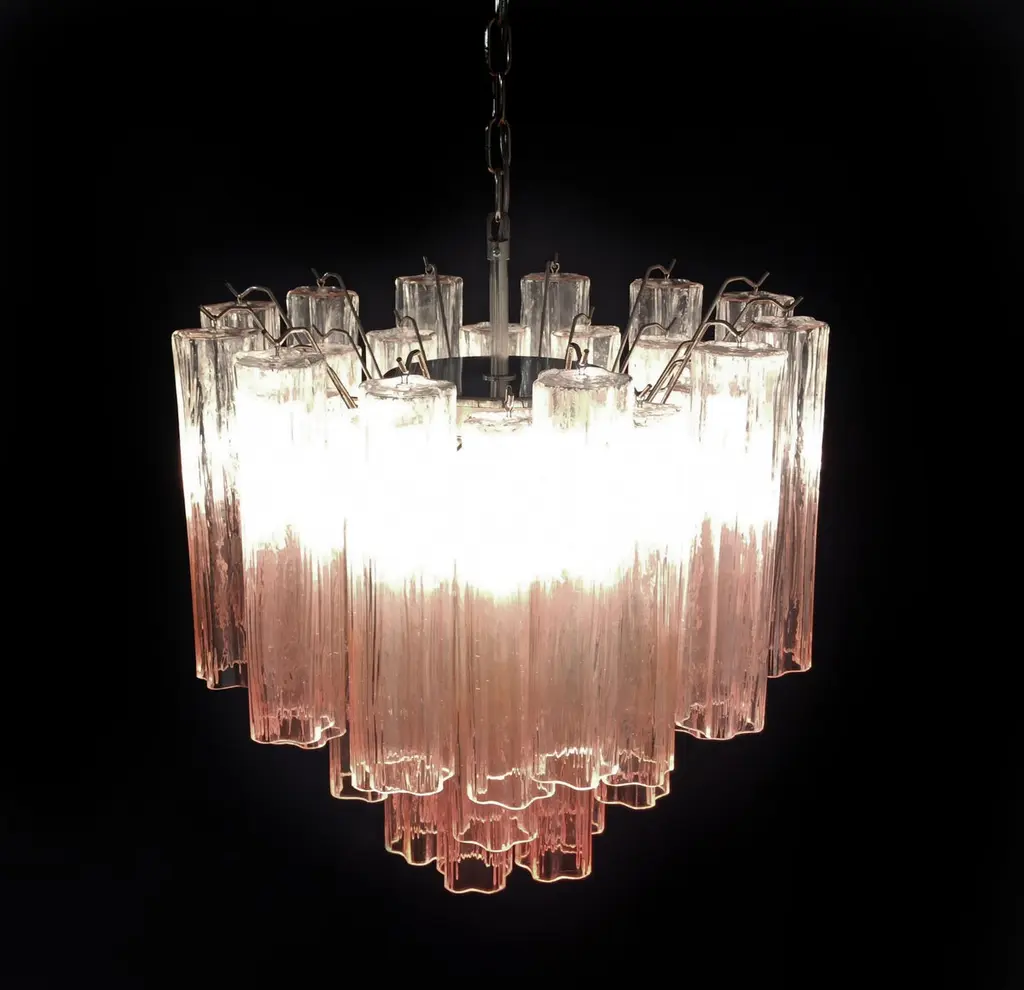 Pair Italian vintage chandeliers in Murano glass and nickel-plated metal structure. The armor polished nickel supports 36 large shaded pink glass tubes in a star shape.Period:late XX centuryDimensions: 50,40 inches (128 cm) height with chain; 21,30 inches (55 cm) height without chain; 22,85 inches (58 cm) diameter.Dimension glasses: 11,60 inches30 cm) height; 2,75 inches (7 cm) diameterLight bulbs: 7 light bulbs: 274 dimension (not included in the sale) - - On request we can replace the lampholders with those suitable for the American electrical system.Condition:Perfect condition and fully working. The metal structure has been perfectly restored and is therefore in very good condition, only small signs of oxidation.
