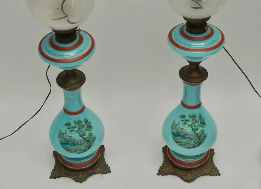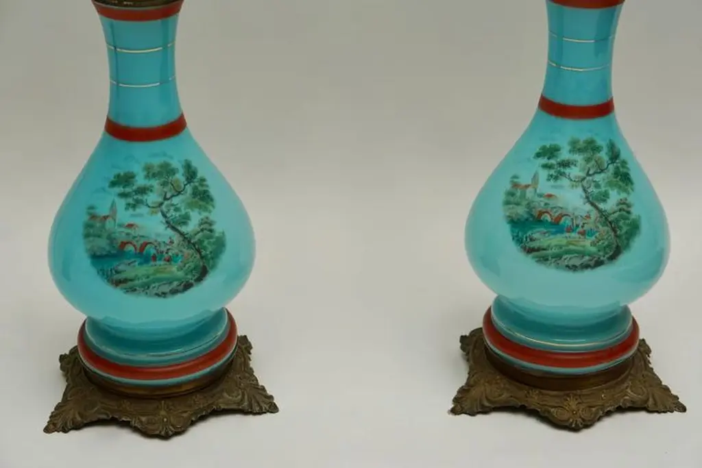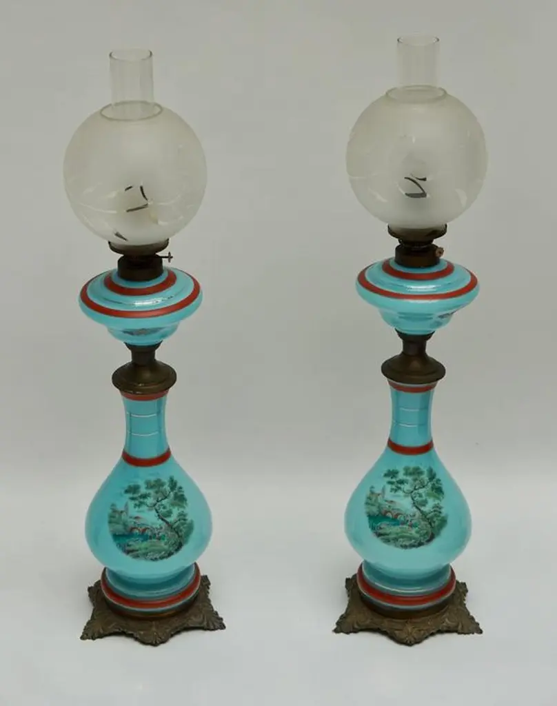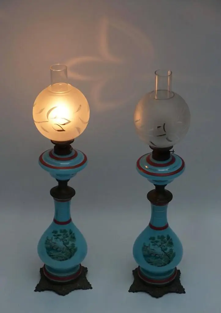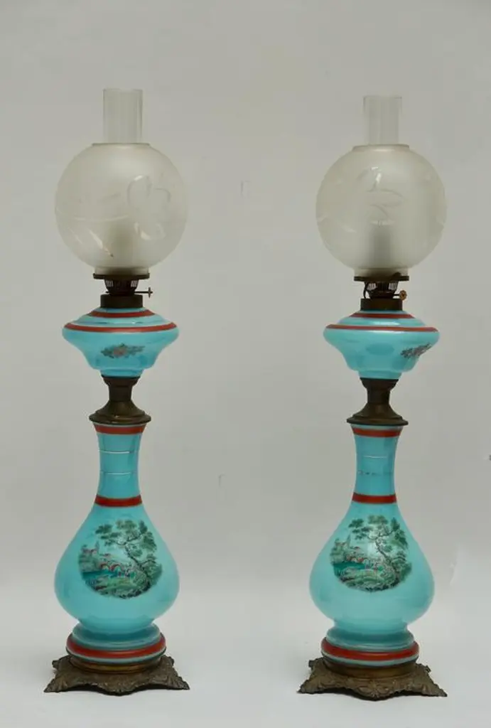 Pair of 19th century French opaline lamps, formerly oil.Measures: Height 80 cm.Diameter 17 cm.Please note: The price is per piece.