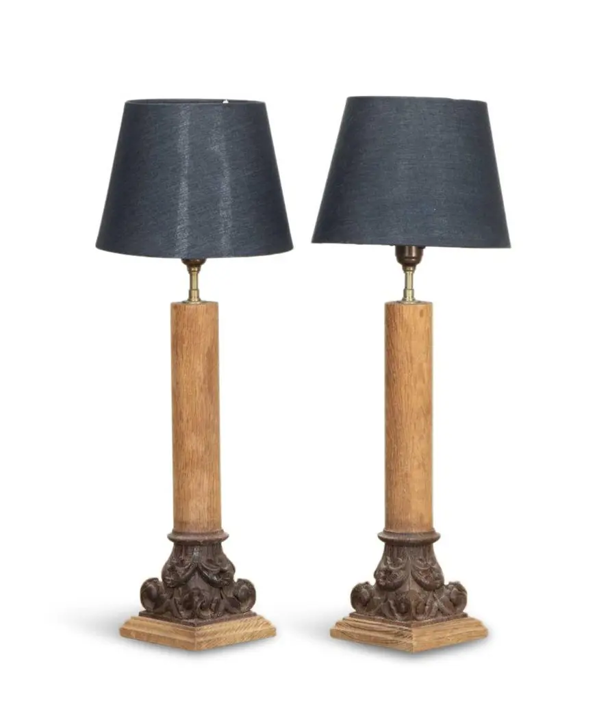 Pair of 19th Century French wooden corinthian columns, rewired into stylish table lamps.With intricately carved bases. Lamp shades included.