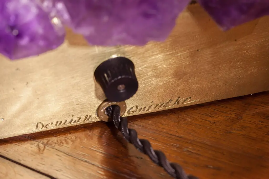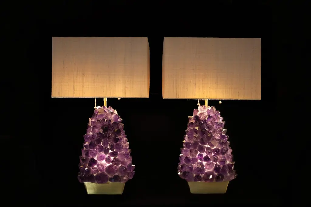 Unique pair of amethyst lamps, with approximately 170 brut rocks hand assembled on casted bronze base.170 brut rocks.Weight: 14 kg.Internal 3,5W Led light and two external Led 9W lamps. Total 12,5 W on each with 3000K color tone. 127 V / 220 VElectric gold rayon fabric braided lamp cord set (8FT), switches, lamp socket cluster with two pull chain and euro two pin plug. Shades in silk, both sides.Dimensions: 72 x 30 x 25 cm oval body and 41 x 33 cm top shade.Demian Quincke develops unique handmade decorative objets d’art from precious stones that are carefully selected and perfectly fitted together, creating amazing forms of brilliance and beauty. The final appearance is like a bouquet of beautifully illuminated flowers, rendered in natural quartz, unfolding their petals.Demian’s artistry is a product of hard work, natural ability, and the unique artistic and cultural environment in which he was raised. Born in France to Uruguayan parents, Demian was exposed early to art by his artist mother and his father, who was a merchant in high decor and antique objects.When Demian was two years old, he relocated with his family to Uruguay, which began the process of broadening his world-view and developing his multi-cultural identity. After stops in California and Germany, he eventually arrived in Brazil at the age of fourteen, with an appreciation for the wide expanse of the World and his place in it.From the outset of his career, Demain worked to developed his unique style of artistic expression, all the while learning from other artists through observation. In 2010, upon returning from a study tour and research in New York City, he began to create, develop and produce his own pieces.In love with the natural beauty of semi-precious Brazilian stones, Demian uses them as the predominant material of his work. With them, he creates objets d’art that remind the viewer of the Earth’s natural beauty, even through the material has been transformed by his artistry. Internal or external lights enhance the brightness and beauty of the stones, and highlight their artistic metamorphosis.