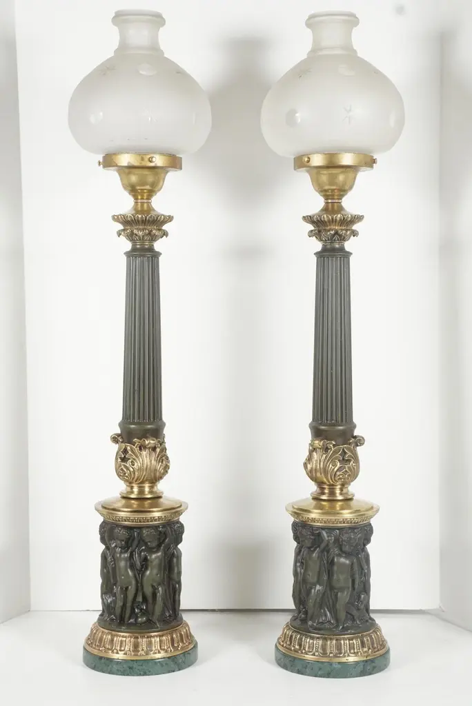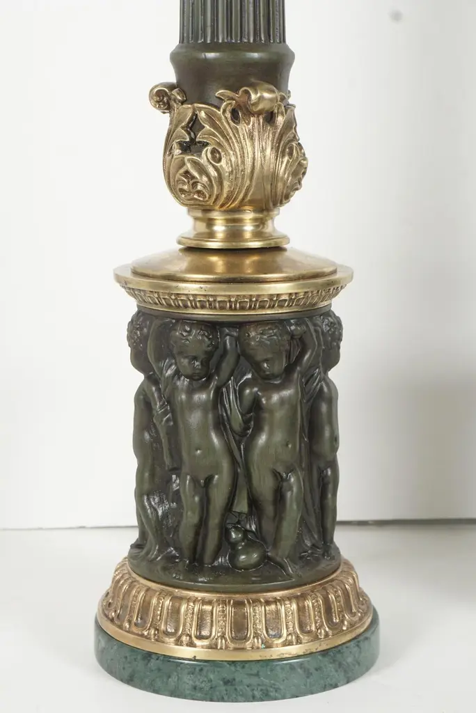 This pair of very dramatic tall cast & tole neoclassical sinumbra style lamps with frosted etched glass shades appear to be antique from the 1820s however are made circa 1930. Cast in heavy brass and tole painted they are most probably European in origin and are in excellent condition. The base is decorated with encircling putti sandwiched in between two architectural brass circular panels. A reeded tole column rises up out of acanthus leaves and is topped by a capital decorated with acanthus leaves. The shades are frosted and etched to clear created a very pleasing and atmospheric glow. The tole painting mimics old patinated bronze with a rich deep green patina with rub thrus and the green marble bases further the overall effect. Newly rewired with French silk wrapped wire.