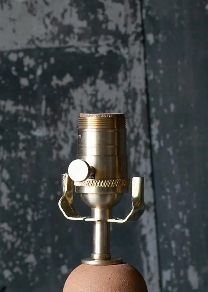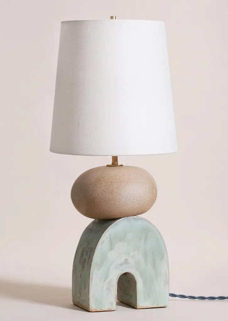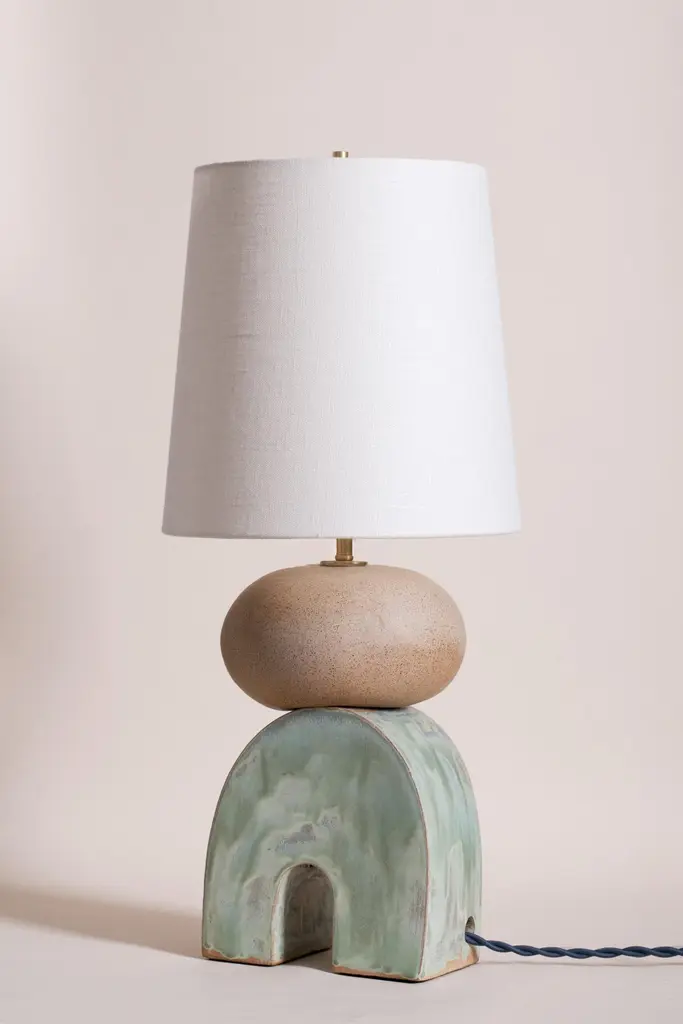 Pair of one of a kind ceramic lamps, thrown on the potters wheel and assembled by hand. The lamp base is comprised of two different clay bodies and features a raw, unglazed ceramic surface to highlight the texture of natural clay contrasted with a coppery green glazed bottom. This set was inspired by seashells and smooth stones collected from the beach on trips to New England.The pair are about 23 inches tall with linen shade, unfinished and brushed brass hardware, with a blue braided cord. UK plug available on request.