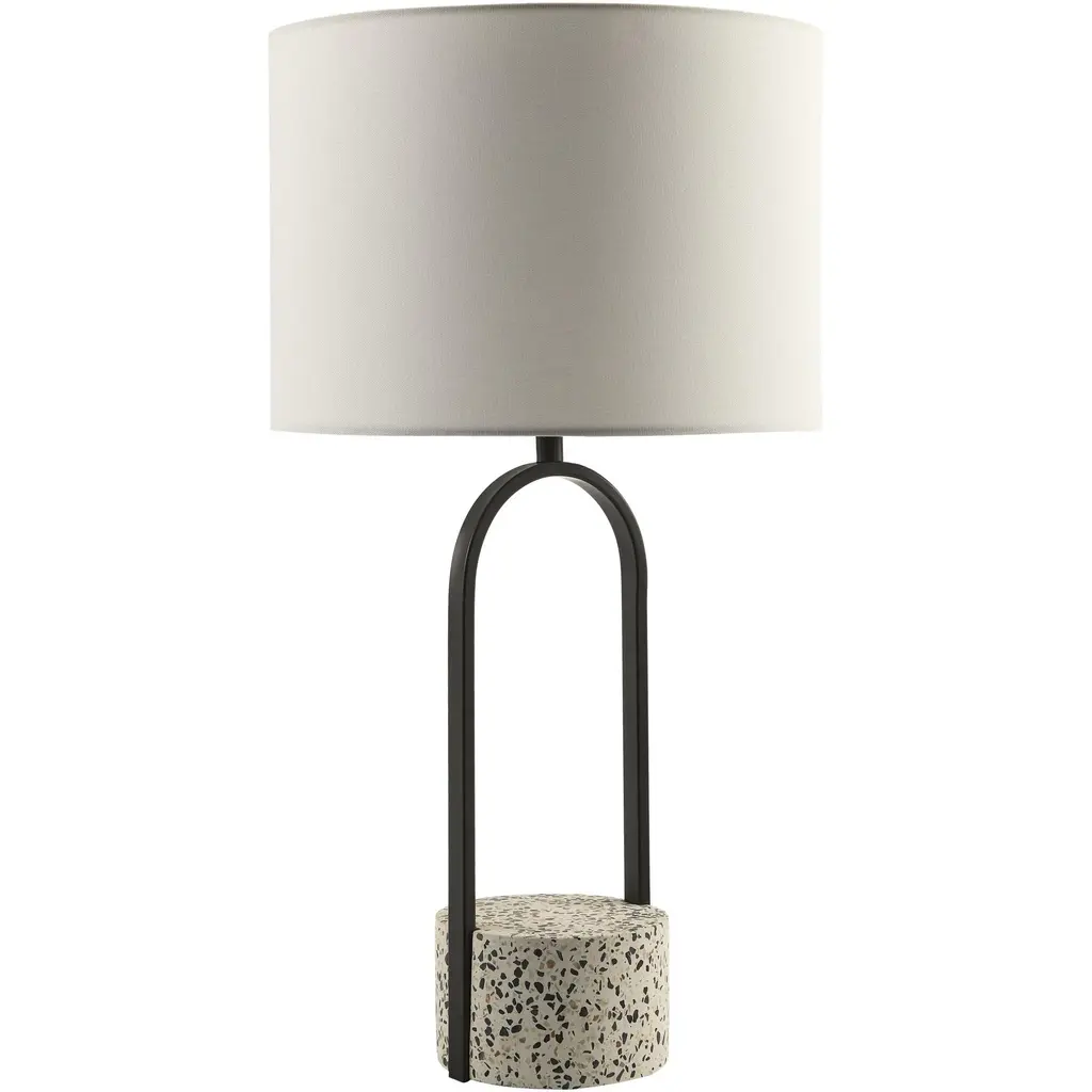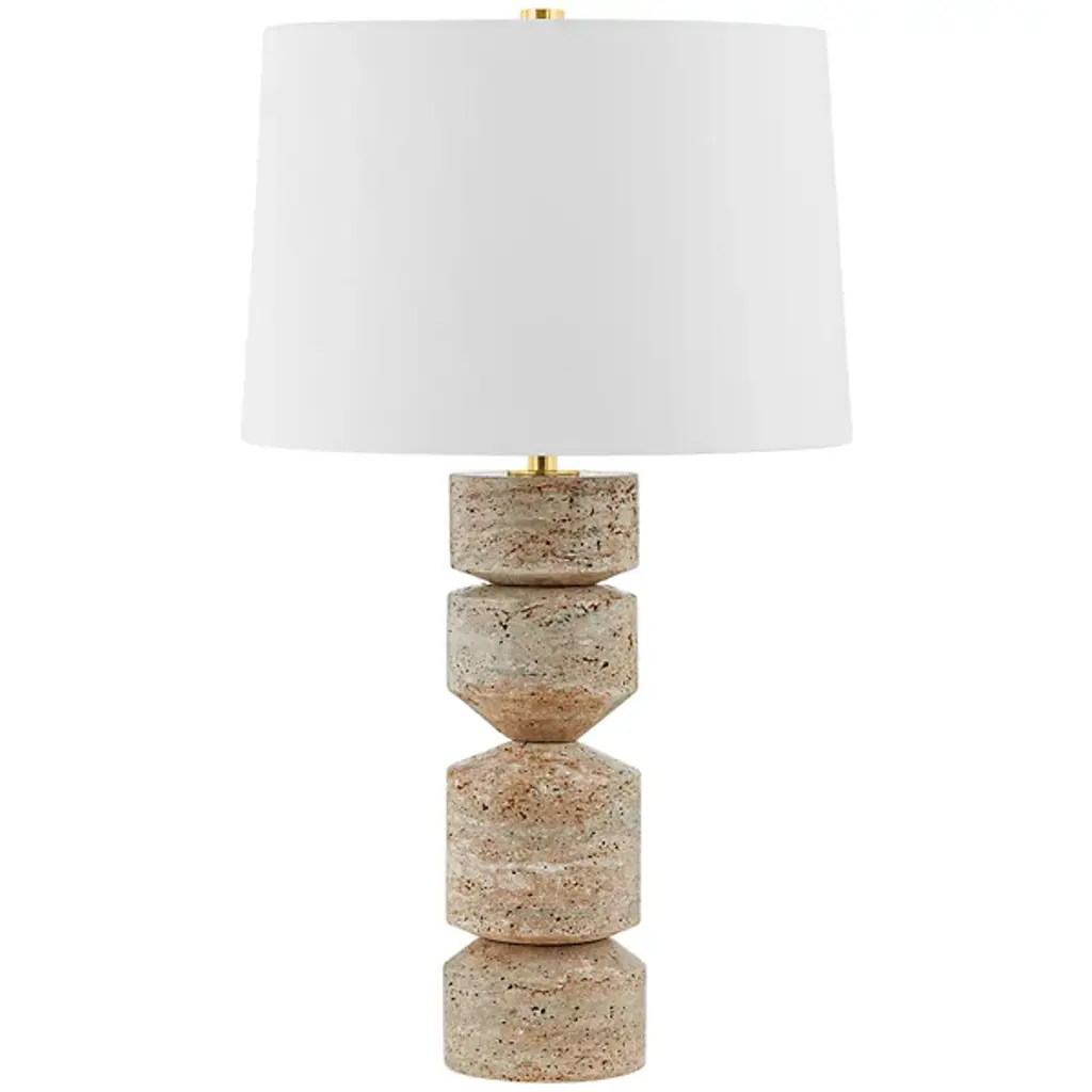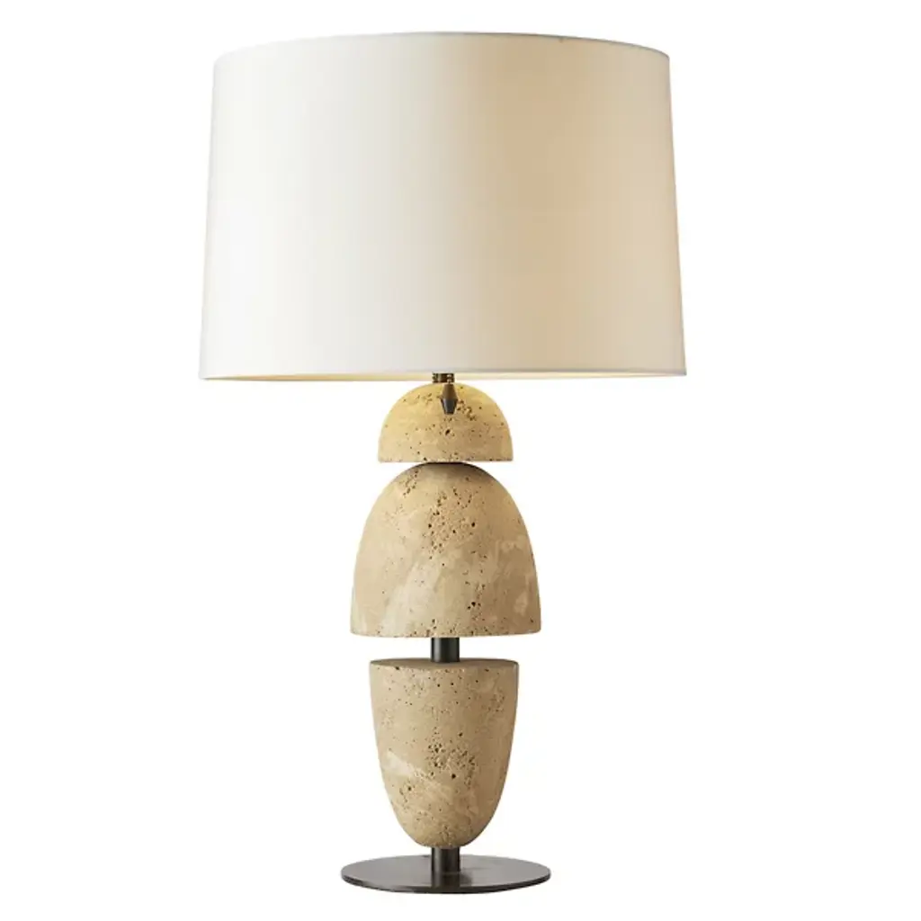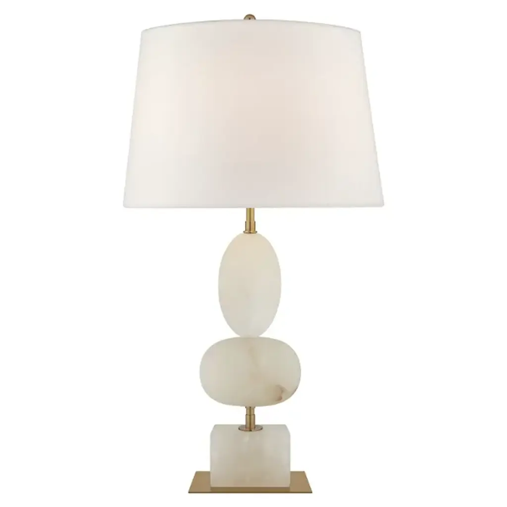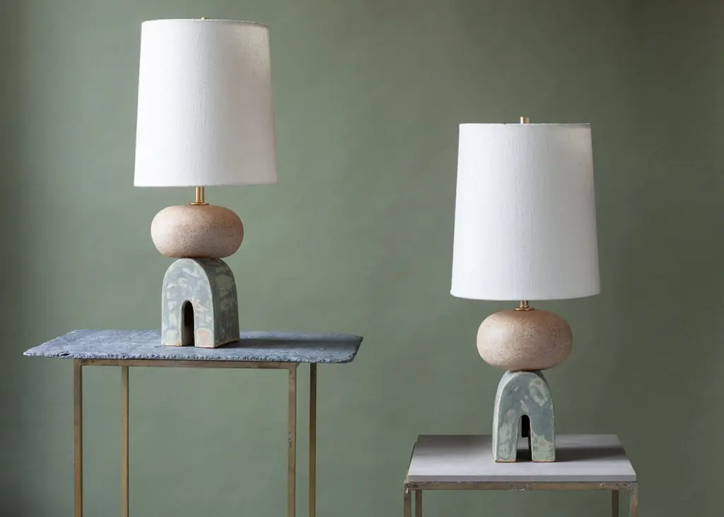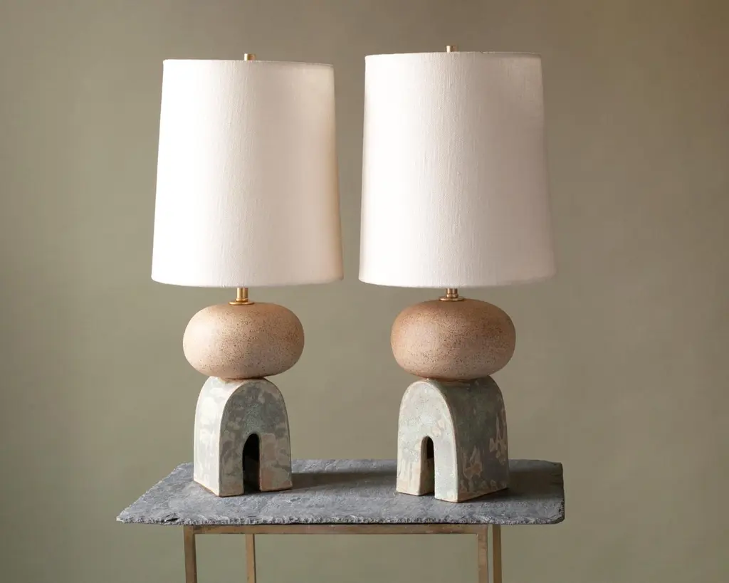 One of a kind, pair of ceramic lamps, thrown on the potters wheel and assembled by hand. The lamp base is comprised of two different clay bodies, with white underglaze and coppery green glaze. This piece was inspired by seashells and smooth stones collected from the beach on trips to New England.About 17 inches tall with linen shade, unfinished and brushed brass hardware, with a blue braided cord. Lamp measures 8 x 6 x 6” (without shade harp)Shade measures 8 x 9”UK plug available on request.
