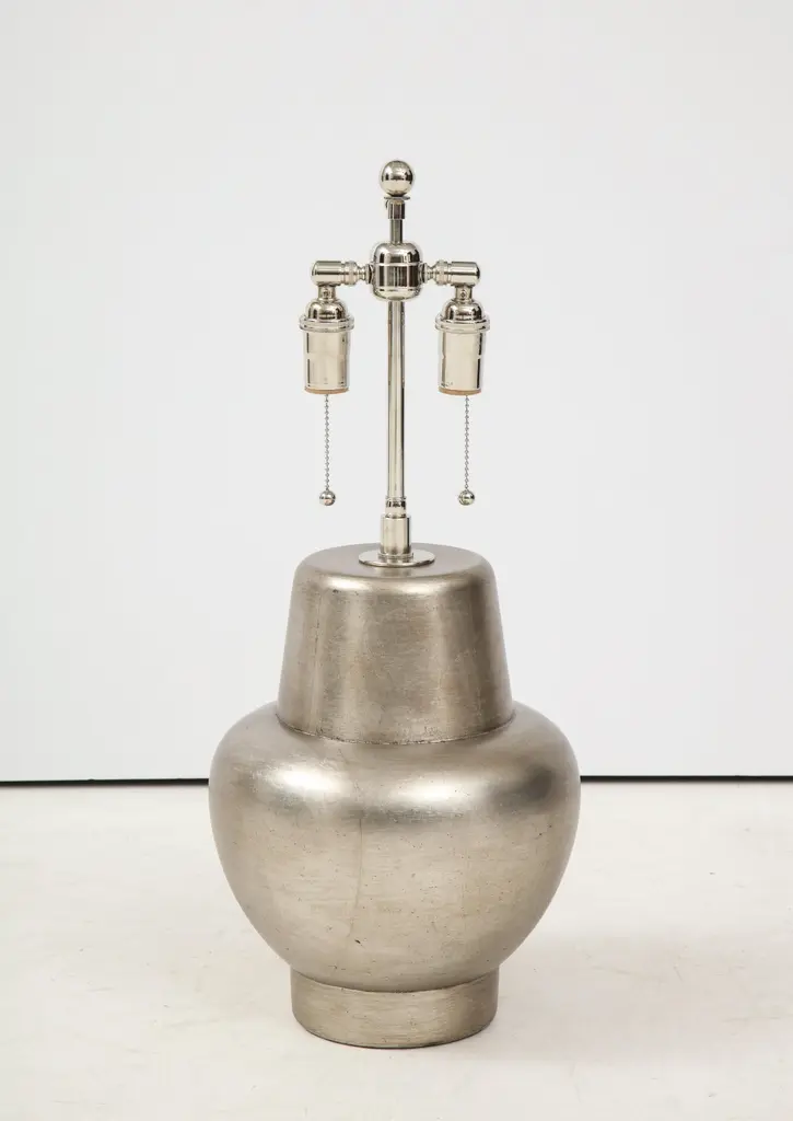 Beautiful pair of glazed silver leafed lamps by James Mont.The lamps have been newly rewired with polished nickel double clusters.The price is for the pairLamp shades NOT included