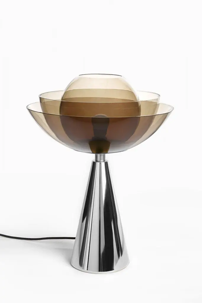 Lotus table lamp by Mason EditionsDimensions: 36 × 48 cmMaterials: matte gold 24k base + transparent smoke grey blown glassFinishings: matte gold 24k base + transparent smoke grey blown glasspolished champagne gold base + transparent opal blown glassmatte copper base + transparent opal blown glassmatte white nickel base + transparent blown glassAll our lamps can be wired according to each country.With its fascinating shape and heady scent, for many Asian cultures the lotus flower symbolizes elegance, beauty and grace. The support of this magical flower is a cone in enameled metal, which narrows upwards to embrace the luminous core. Like a bud that opens in the sunlight, Lotus unfolds its blow glass petals, made up of three separate elements. They gently filter the light to create an intimate and cozy atmosphere.Ideal for bedside, desk and table use, this modern design lamp is an exquisite example of aesthetics combined with functionality.Mason Editions is an Italian company specialized in the production of design furniture, lighting solutions, and accent pieces. Born from the lifelong passion for lighting and entrepreneurial spirit of Fabio and his partner Silvia, Mason Editions places itself halfway between fine art and exquisite craftsmanship. A collection of lighting, design objects, and furnishing accessories, signed by artists Serena Confalonieri, Martina Bartoli, and Matteo Fiorini, head of the creative direction. Mason Editions comes from the experience of an Italian lighting company placed in the Veneto region. This new brand of furniture elements was born from the meeting between the entrepreneur Fabio Mason and three international designers who designed the first collection for a sophisticated public. Therefore the collection wants to be eclectic and timeless.The material contrast and fresh design, with essential shapes, mark the mason editions collection.In conclusion, the elegant Italian sign highlights proposals suitable for all environments.Mason editions is a set of experiences, artisans, and productive know-how that creates a capable system.