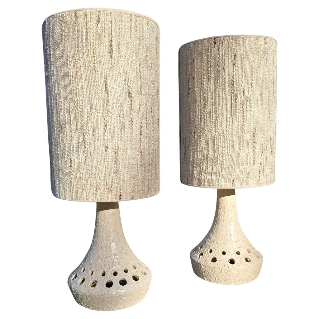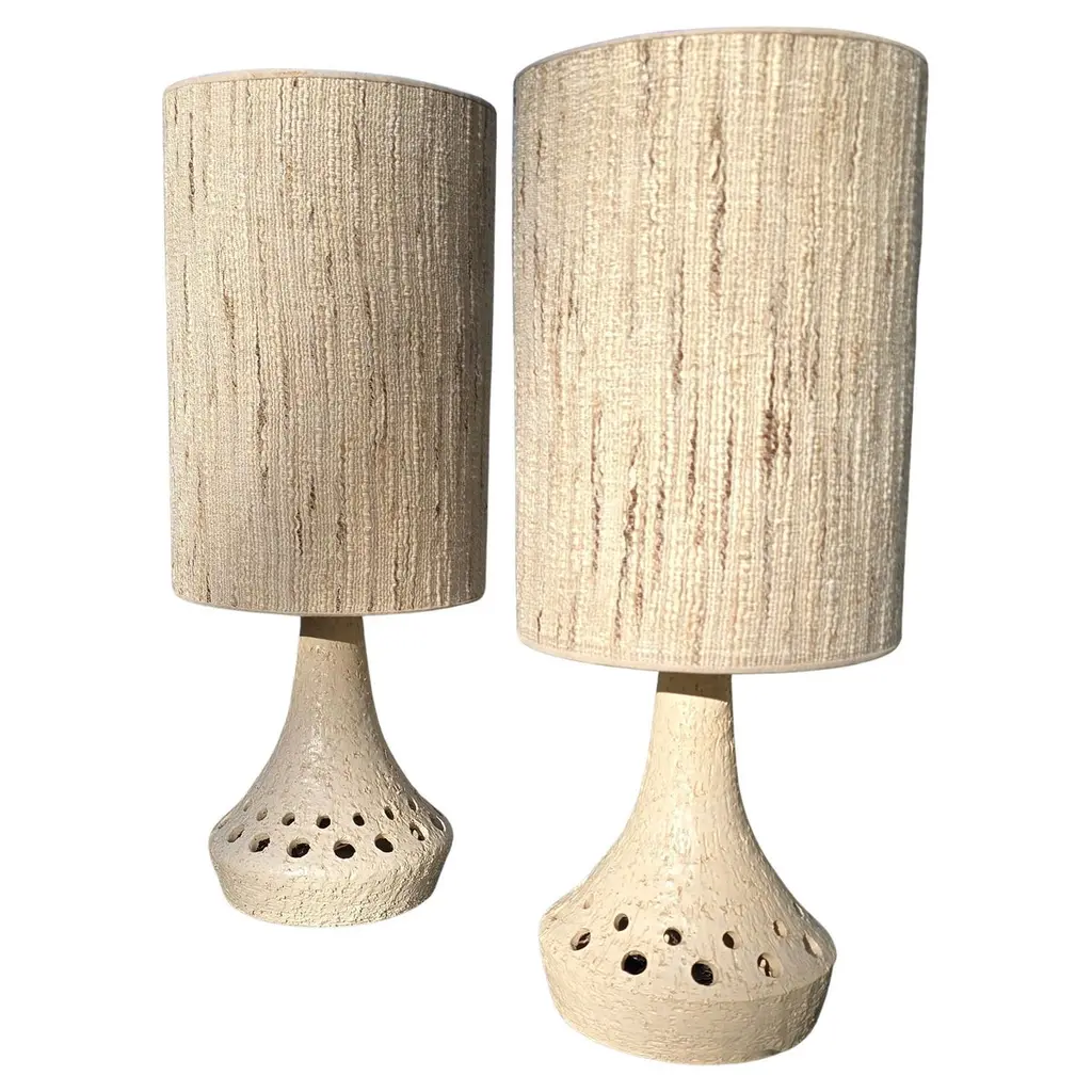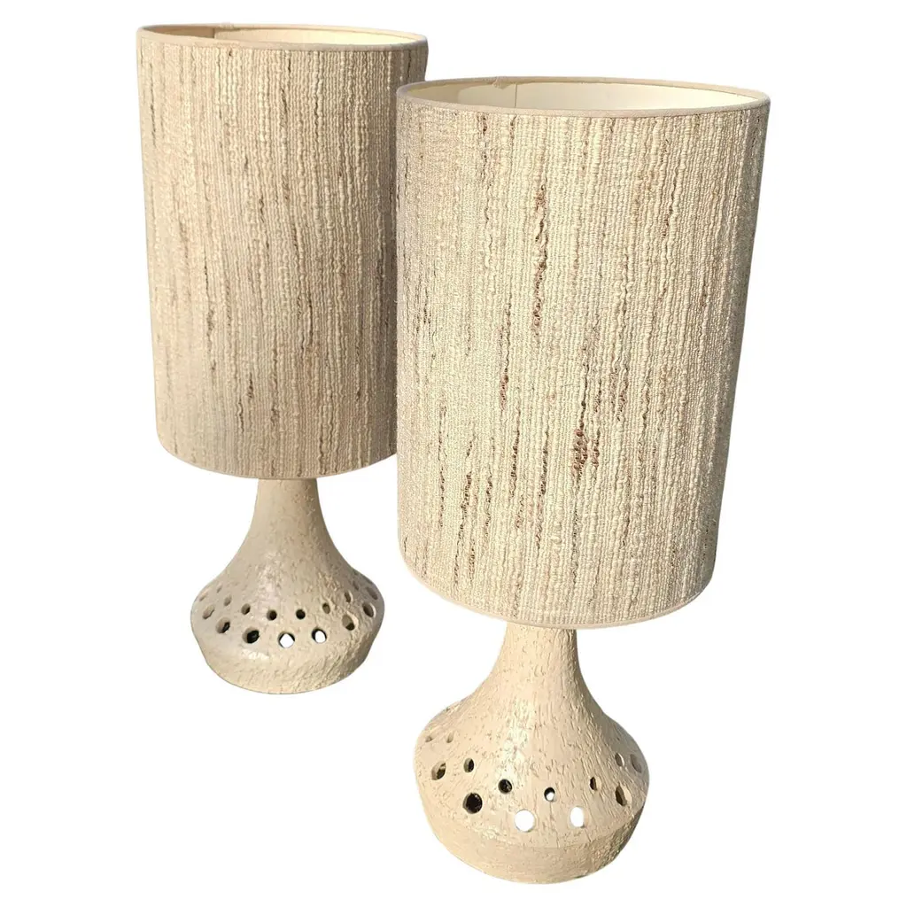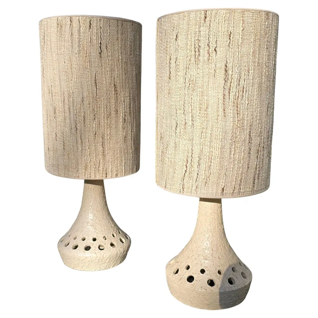 Pair of Mid-Century Modern Danish Ceramic Table LampsElevate your interior with this stunning pair of Mid-Century Modern ceramic table lamps from Denmark. These beautifully crafted lamps date back to the mid-20th century and feature an elegant, sculptural ceramic base with distinctive perforated detailing. The textured surface and organic shape exude a timeless Scandinavian charm.Each lamp is complemented by a custom-made fabric lampshade, designed to diffuse light softly and create a warm, inviting ambiance.Dimensions:Height: 24.8" (63 cm) and 25.6" (65 cm)Lampshade Diameter: 9.8" (25 cm) Price is per piece, not for the pair.