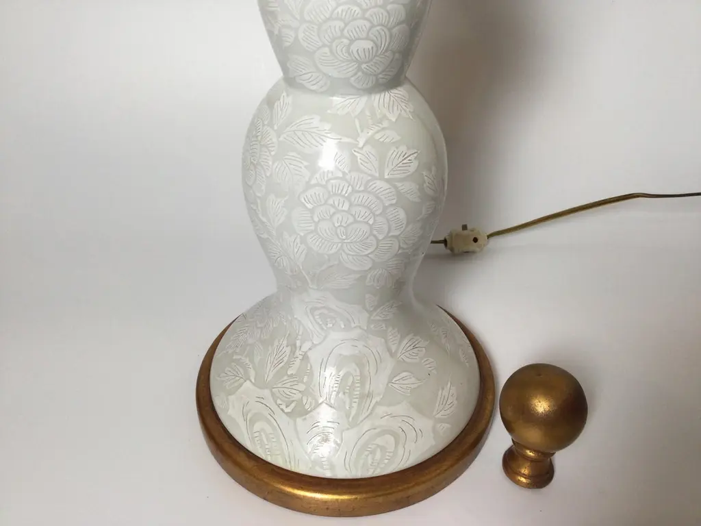 A chic pair of Hollywood regency tall porcelain lamps. The gloss off white porcelain with a pattern on pattern finish in excellent condition. The lamps with sockets for two bulbs. The shades are for photographic purposes only and not included.