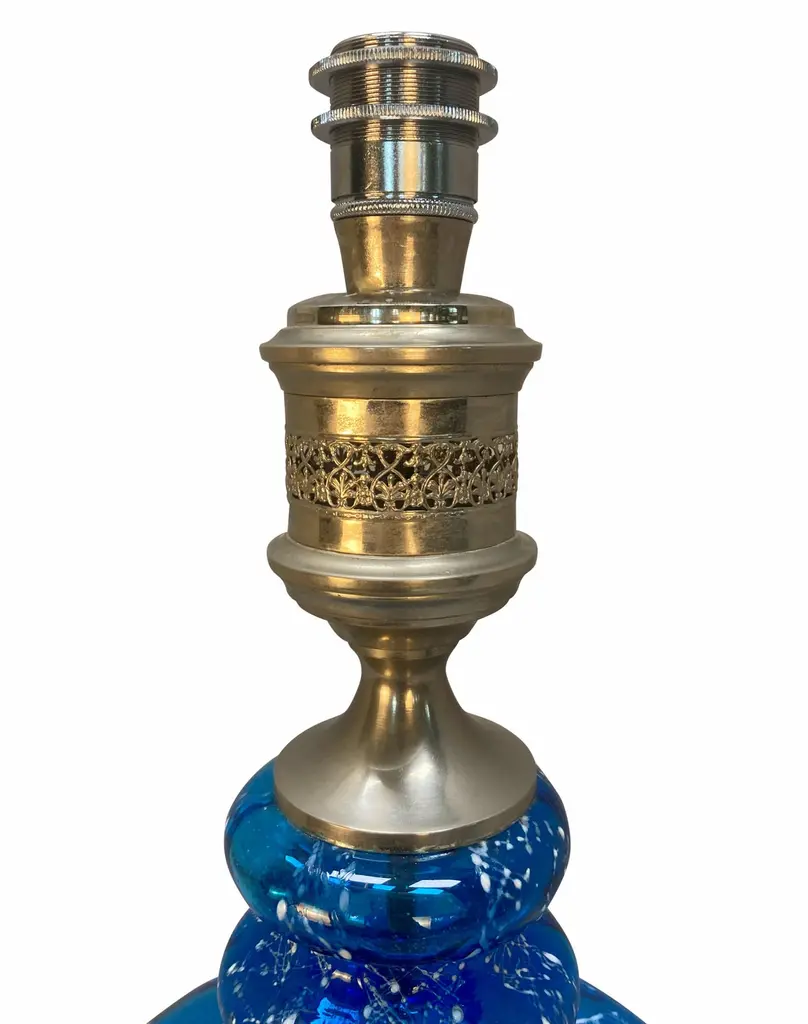 A pair of Italian Mid-Century hand-blown blue glass table lamps with silvered mounts, in a Middle Eastern manner.