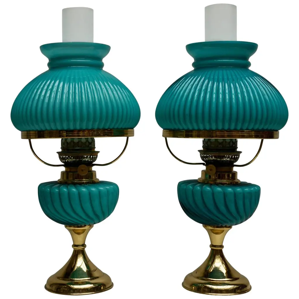 Pair Of Midcentury Blue Glass & Silver Lamps