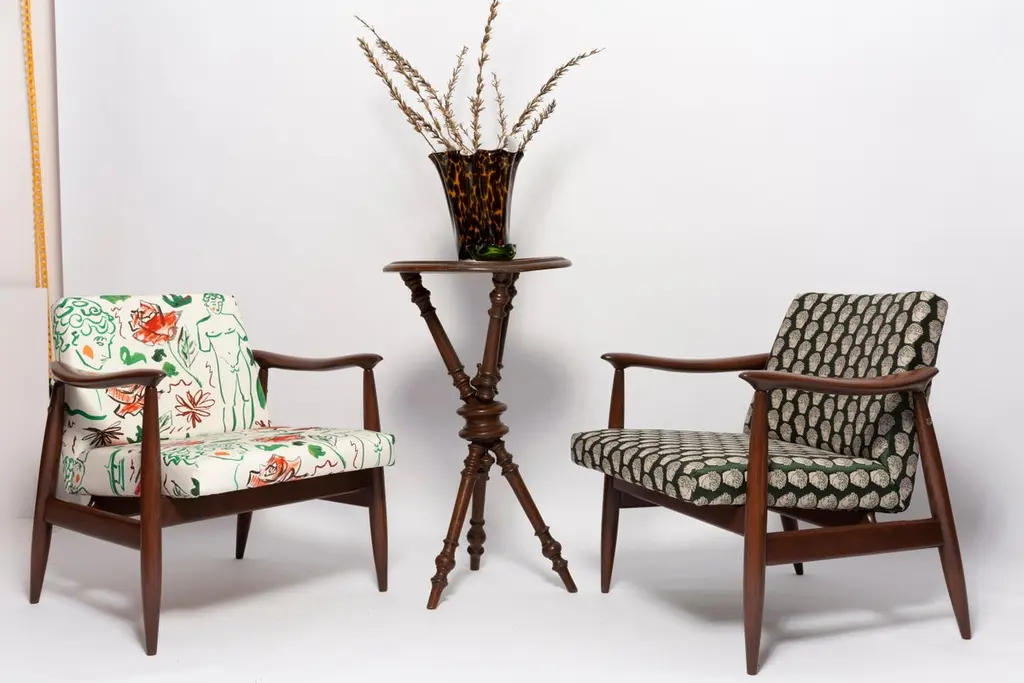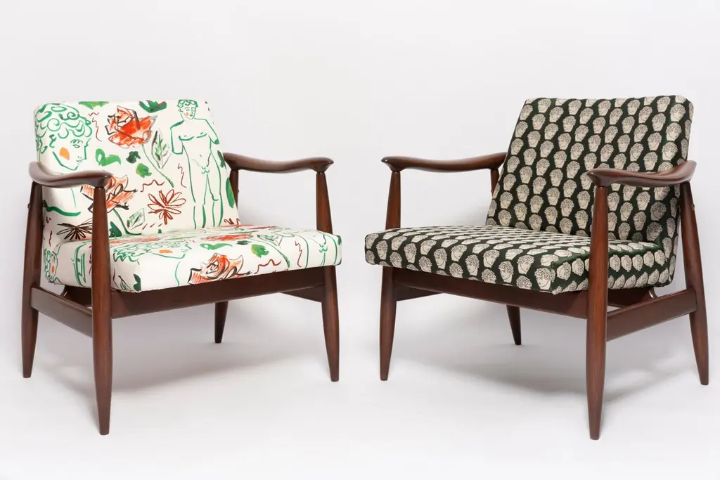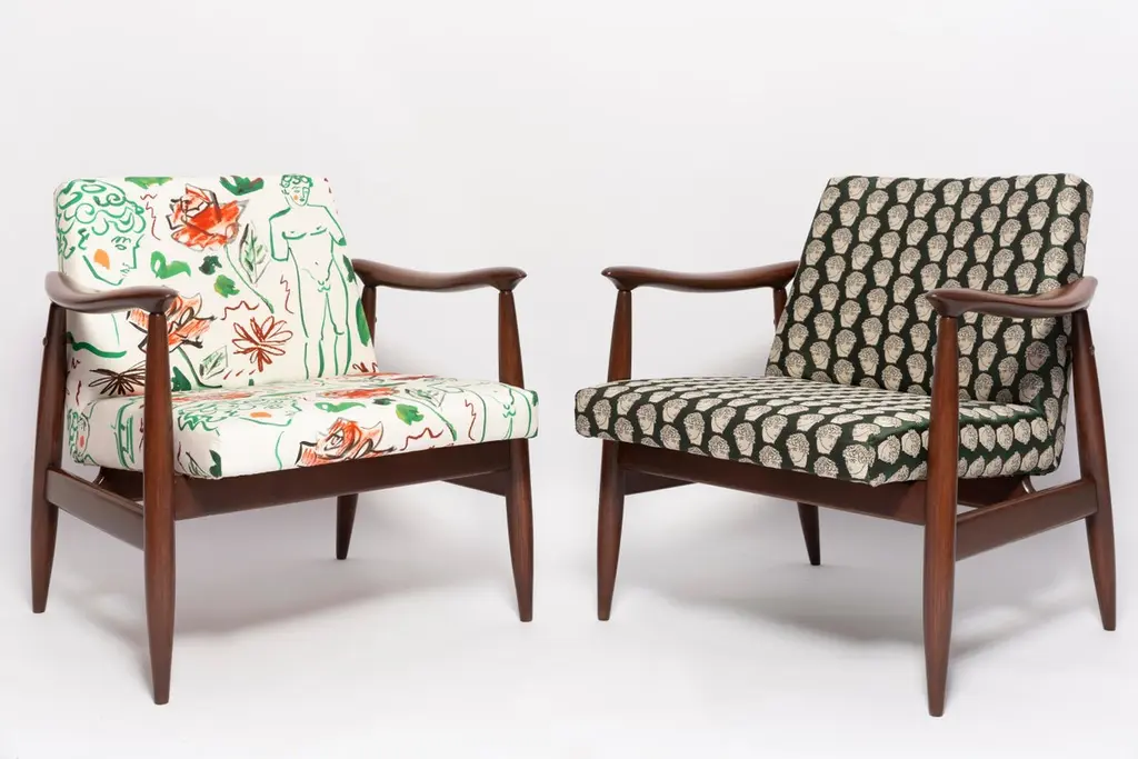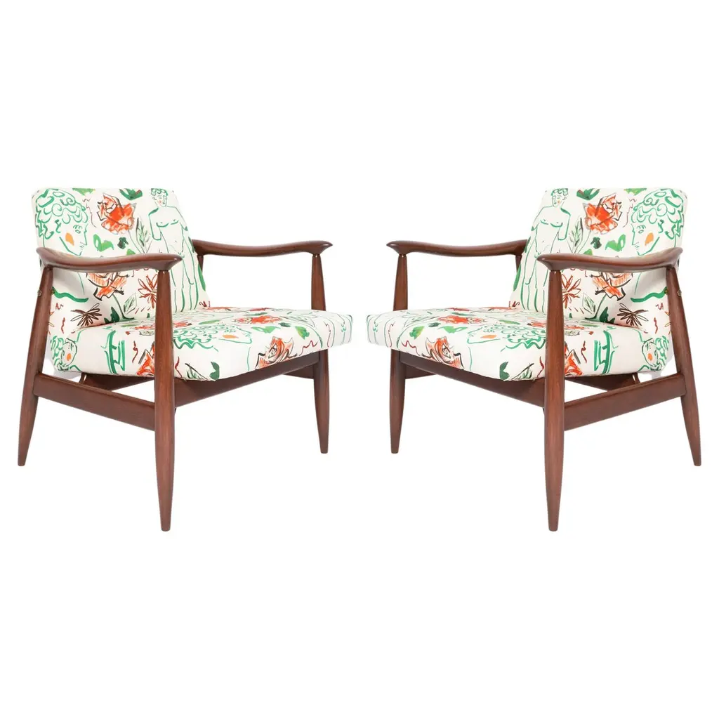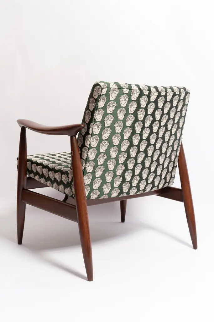 The GFM armchair is an icon of the Polish design of the PRL period.The famous armchair was designed in 1962 by the Polish interior designer and furniture designer Edmund Homa. Produced in the Lower Silesian Furniture Factory in Swiebodzice.This model has a simple, modernist form. It consists of an upholstered seat combined with a wooden backrest. The organic shape is typical of the 1960s style.The chair is very ergonomic and comfortable, as the furniture designs of that time were largely focused on the user. Due to its small Size, the furniture fits perfectly into the interiors of contemporary apartments, perfectly meeting the needs of customers.Unique piece is in perfect condition after a professional renovation. We can prepare this armchair in another wood or fabric color. Also in a set of two or more. Please check the last pictures with color samples.About the fabricPortraits of antinous, greek favourite of the roman emperor hadrian. i have always been drawn to figures of the ancient greek and roman worlds, and the story of antinous is a fantastic one, although sadly rather tragic in the end. renowned for his beauty, antinous will forever be a beguiling character. cotton lampas that plays on the shiny/matte contrast. suitable for upholstery. All available colors on the last picture.Composition - 36%CO 33%AC 31%PA-ecoAbrasion test - Martindale: 20000 giri/rubsCertifications - UK Cigarette BS5852 source 0Here set of two is available.