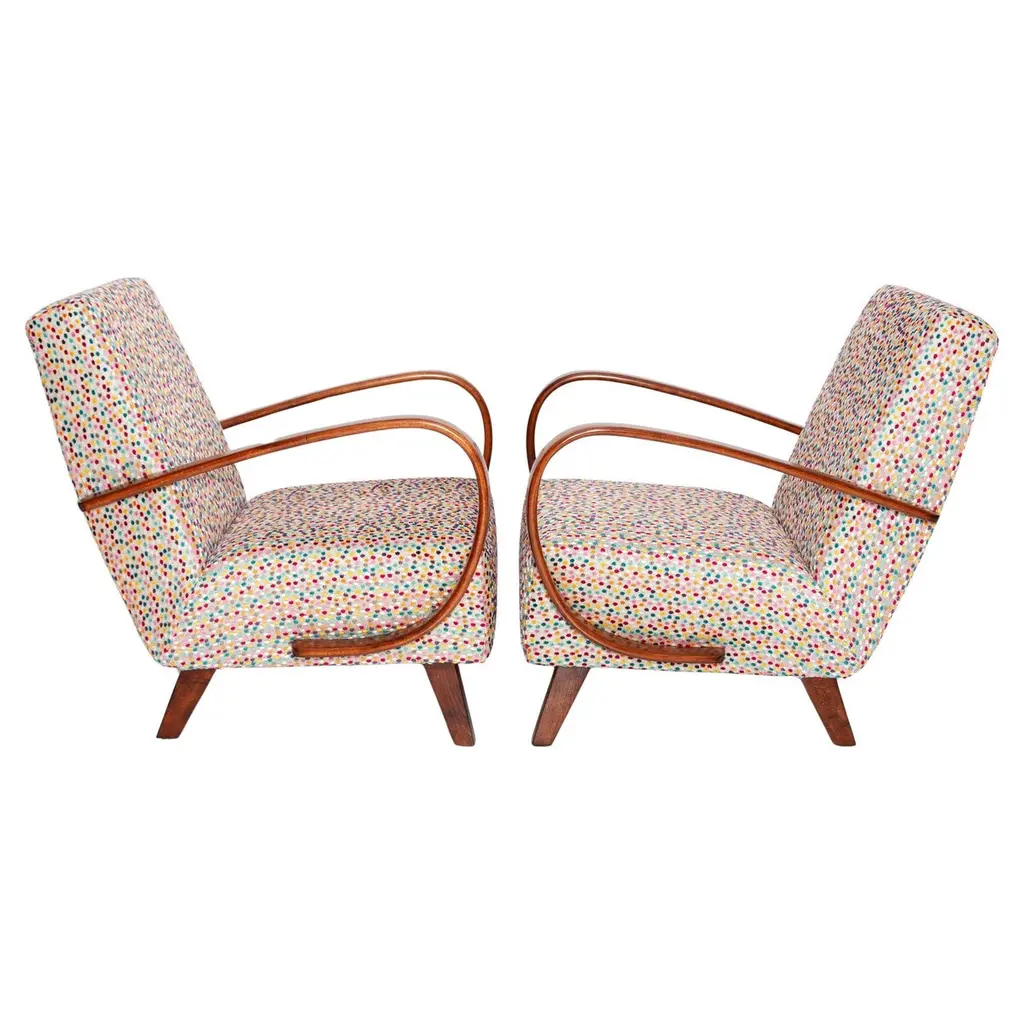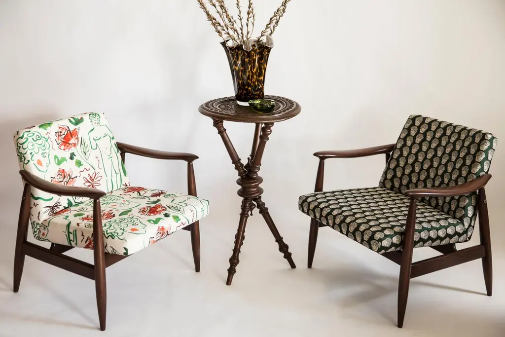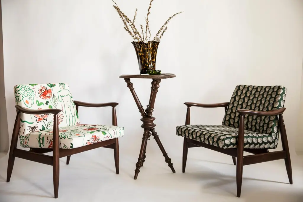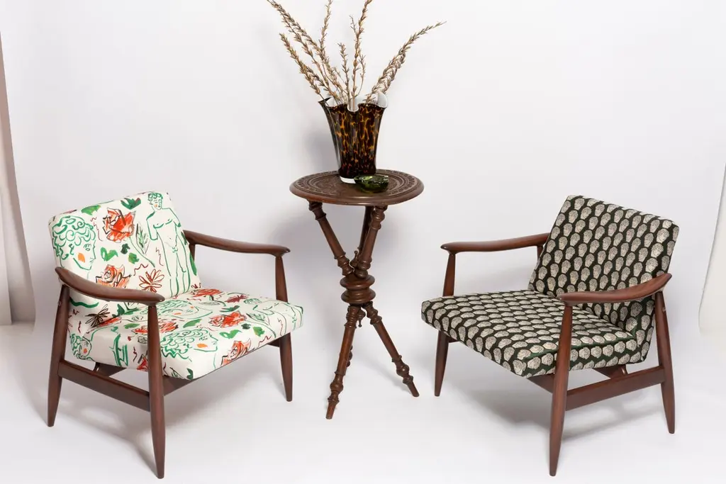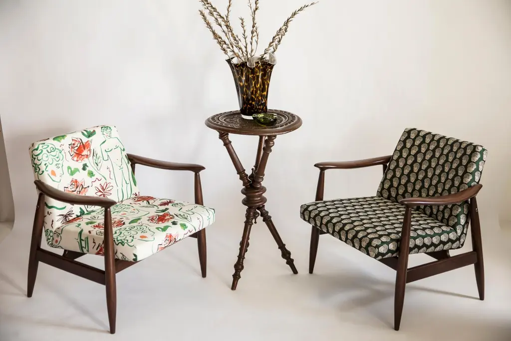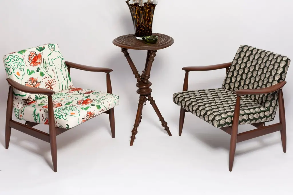 The GFM armchair is an icon of the Polish design of the PRL period.The famous armchair was designed in 1962 by the Polish interior designer and furniture designer Edmund Homa. Produced in the Lower Silesian Furniture Factory in Swiebodzice.This model has a simple, modernist form. It consists of an upholstered seat combined with a wooden backrest. The organic shape is typical of the 1960s style.The chair is very ergonomic and comfortable, as the furniture designs of that time were largely focused on the user. Due to its small Size, the furniture fits perfectly into the interiors of contemporary apartments, perfectly meeting the needs of customers.Unique piece is in perfect condition after a professional renovation. We can prepare this armchair in another wood or fabric color. Also in a set of two or more. Please check the last pictures with color samples.About the fabricPortraits of antinous, greek favourite of the roman emperor hadrian. i have always been drawn to figures of the ancient greek and roman worlds, and the story of antinous is a fantastic one, although sadly rather tragic in the end. renowned for his beauty, antinous will forever be a beguiling character. cotton lampas that plays on the shiny/matte contrast. suitable for upholstery. All available colors on the last picture.Composition - 36%CO 33%AC 31%PA-ecoAbrasion test - Martindale: 20000 giri/rubsCertifications - UK Cigarette BS5852 source 0Here set of two is available.