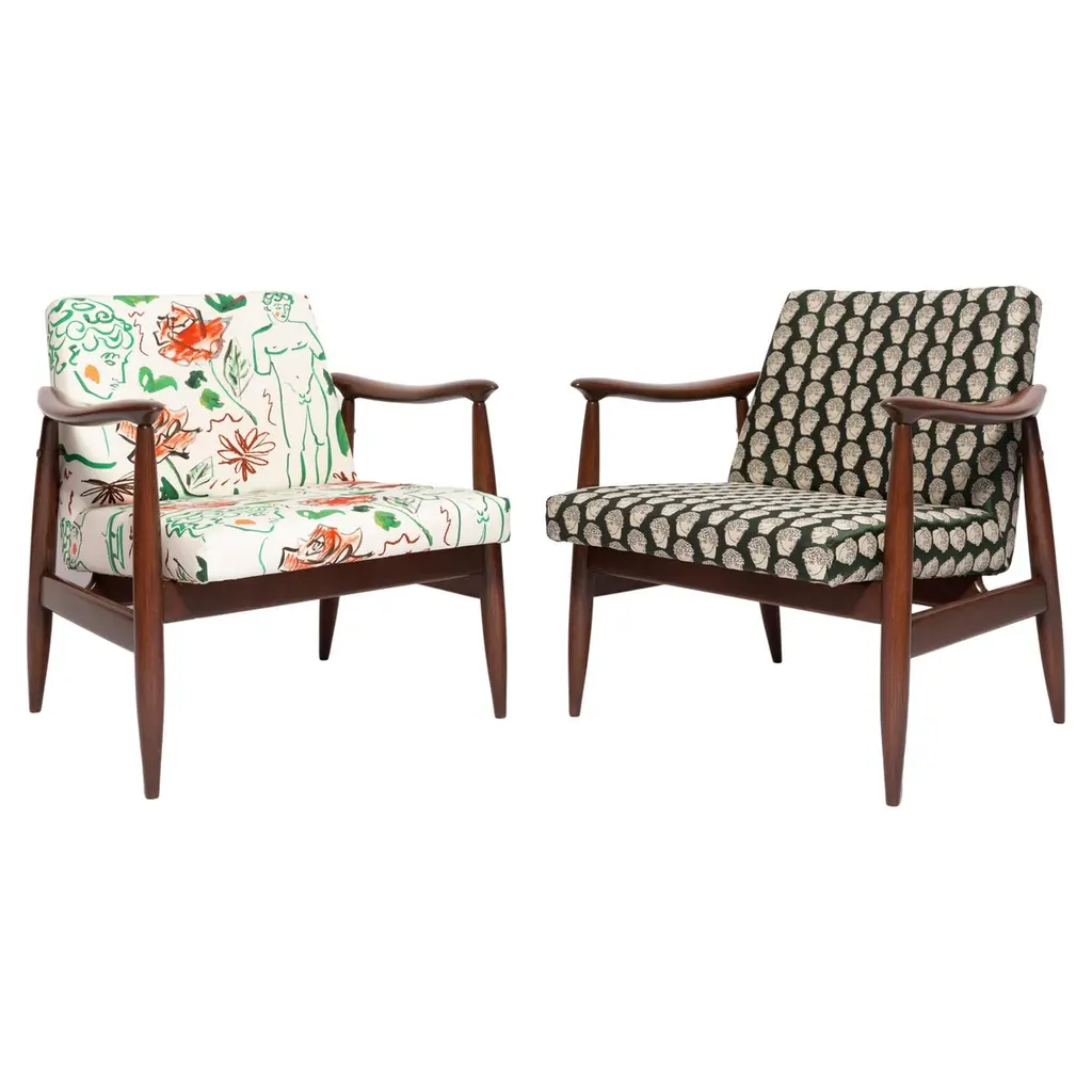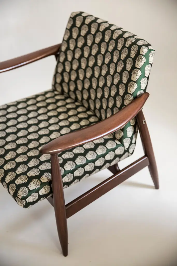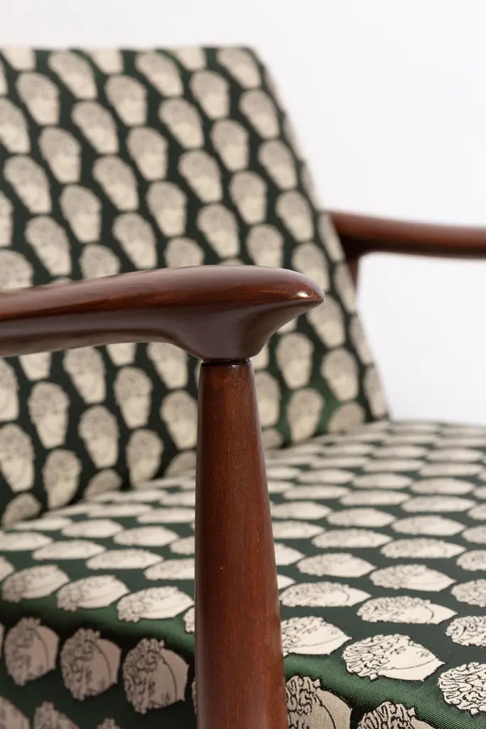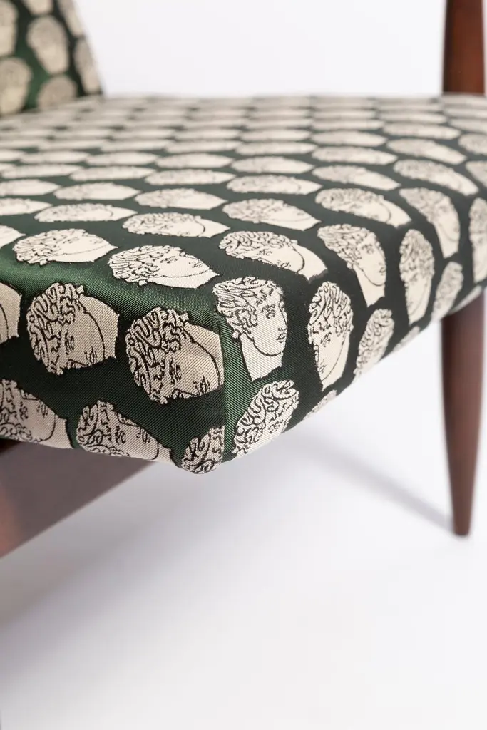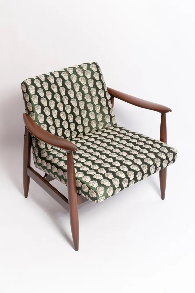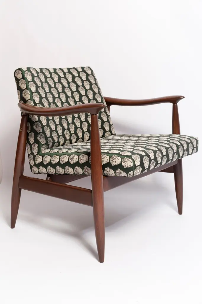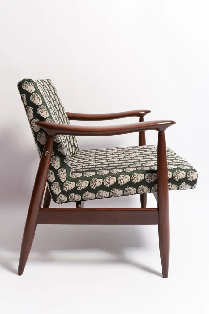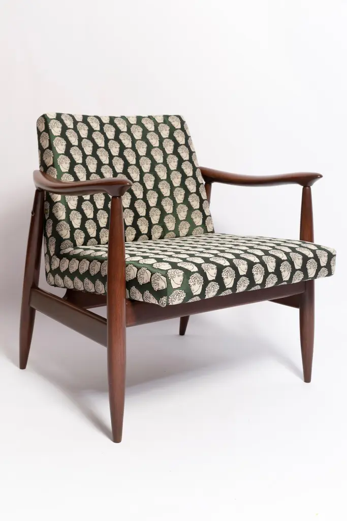 The GFM armchair is an icon of the Polish design of the PRL period.The famous armchair was designed in 1962 by the Polish interior designer and furniture designer Edmund Homa. Produced in the Lower Silesian Furniture Factory in Swiebodzice.This model has a simple, modernist form. It consists of an upholstered seat combined with a wooden backrest. The organic shape is typical of the 1960s style.The chair is very ergonomic and comfortable, as the furniture designs of that time were largely focused on the user. Due to its small size, the furniture fits perfectly into the interiors of contemporary apartments, perfectly meeting the needs of customers.Unique piece is in perfect condition after a professional renovation. We can prepare this armchair in another wood or fabric color. Also in a set of two or more. Please check the last pictures with color samples.About the fabricPortraits of antinous, greek favourite of the roman emperor hadrian. i have always been drawn to figures of the ancient greek and roman worlds, and the story of antinous is a fantastic one, although sadly rather tragic in the end. renowned for his beauty, antinous will forever be a beguiling character... cotton lampas that plays on the shiny/matte contrast. suitable for upholstery. All available colors on the last picture.Composition - 36%CO 33%AC 31%PA-ecoAbrasion test - Martindale: 20000 giri/rubsCertifications - UK Cigarette BS5852 source 0Here set of two is available.