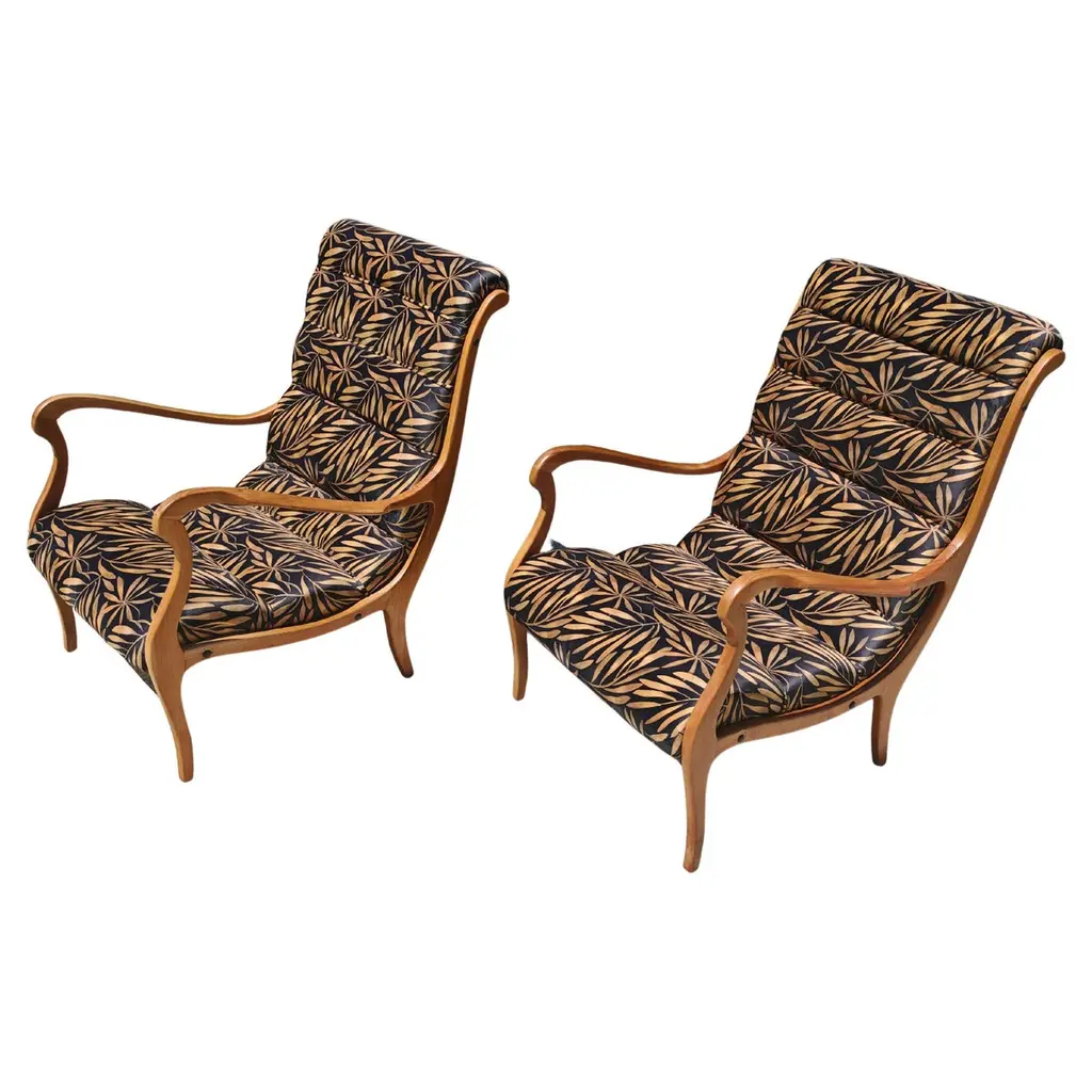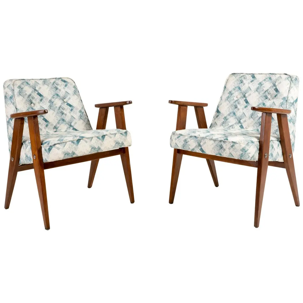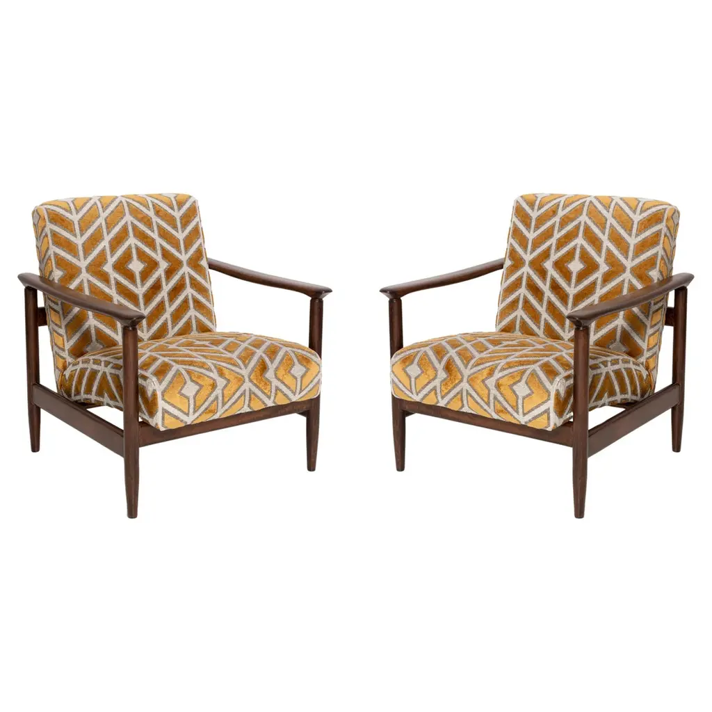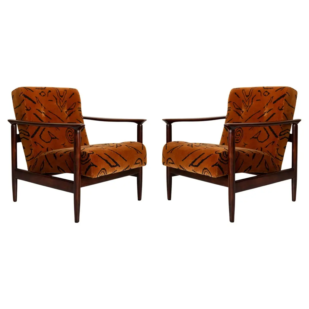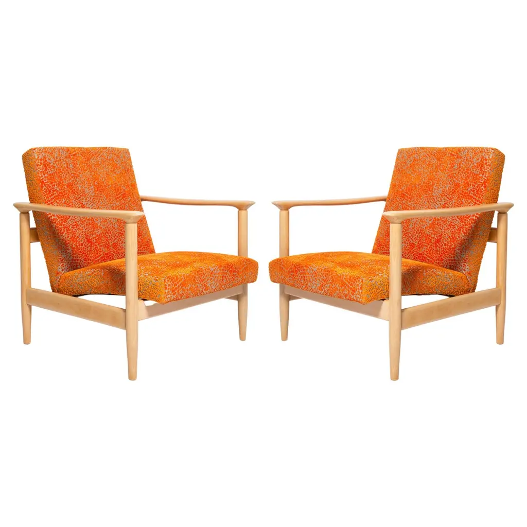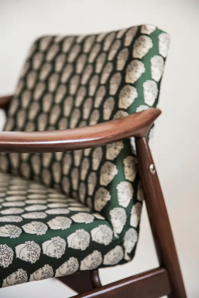 The GFM armchair is an icon of the Polish design of the PRL period.The famous armchair was designed in 1962 by the Polish interior designer and furniture designer Edmund Homa. Produced in the Lower Silesian Furniture Factory in Swiebodzice.This model has a simple, modernist form. It consists of an upholstered seat combined with a wooden backrest. The organic shape is typical of the 1960s style.The chair is very ergonomic and comfortable, as the furniture designs of that time were largely focused on the user. Due to its small size, the furniture fits perfectly into the interiors of contemporary apartments, perfectly meeting the needs of customers.Unique piece is in perfect condition after a professional renovation. We can prepare this armchair in another wood or fabric color. Also in a set of two or more. Please check the last pictures with color samples.About the fabricPortraits of antinous, greek favourite of the roman emperor hadrian. i have always been drawn to figures of the ancient greek and roman worlds, and the story of antinous is a fantastic one, although sadly rather tragic in the end. renowned for his beauty, antinous will forever be a beguiling character... cotton lampas that plays on the shiny/matte contrast. suitable for upholstery. All available colors on the last picture.Composition - 36%CO 33%AC 31%PA-ecoAbrasion test - Martindale: 20000 giri/rubsCertifications - UK Cigarette BS5852 source 0Here set of two is available.