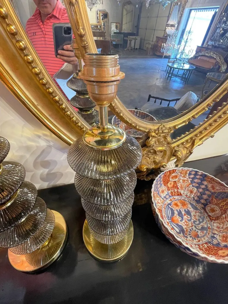 Beautiful pair of modern Murano smoke glass and brass lamps. Lovely textured glass and very fine quality. Creates an upscale look!.