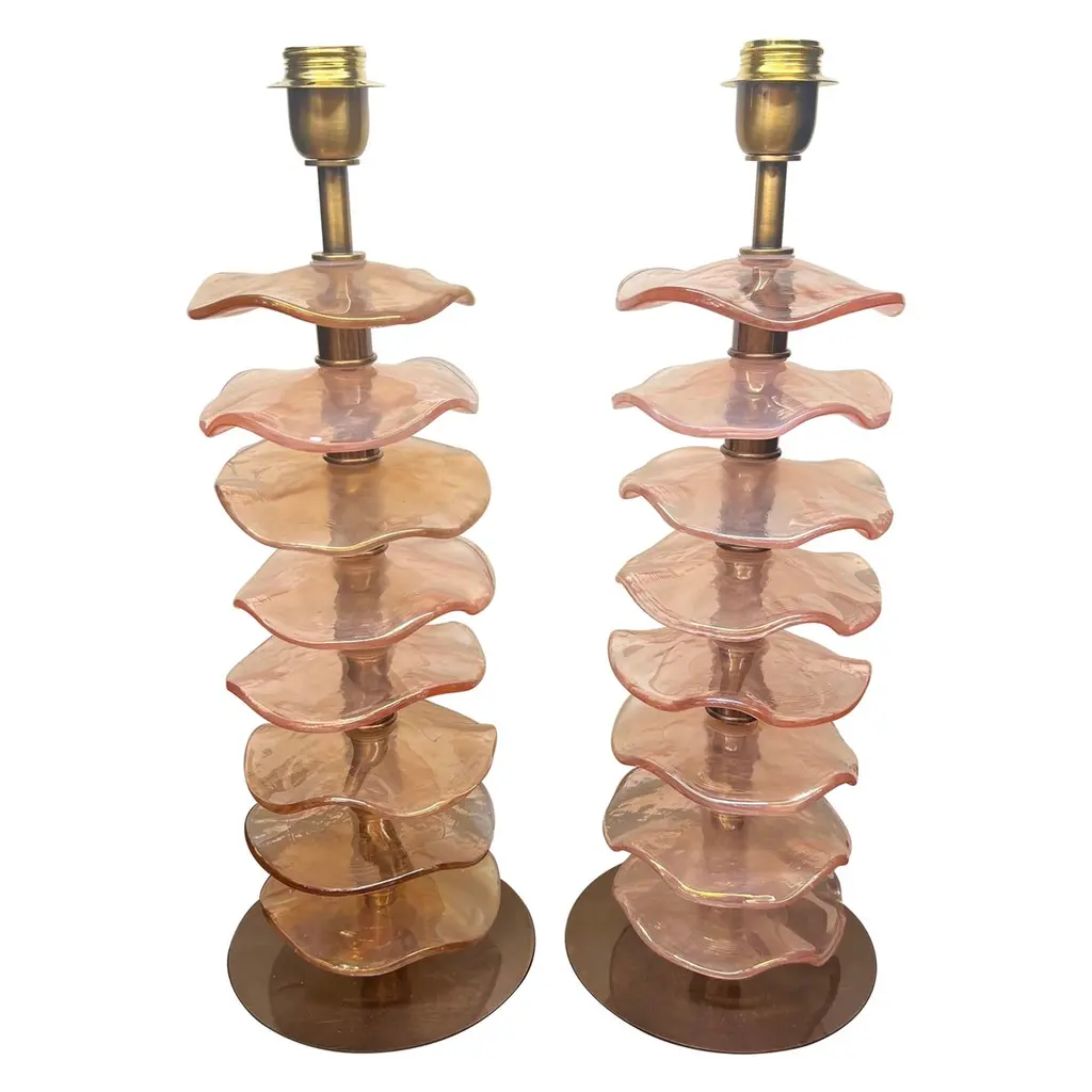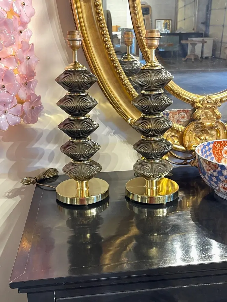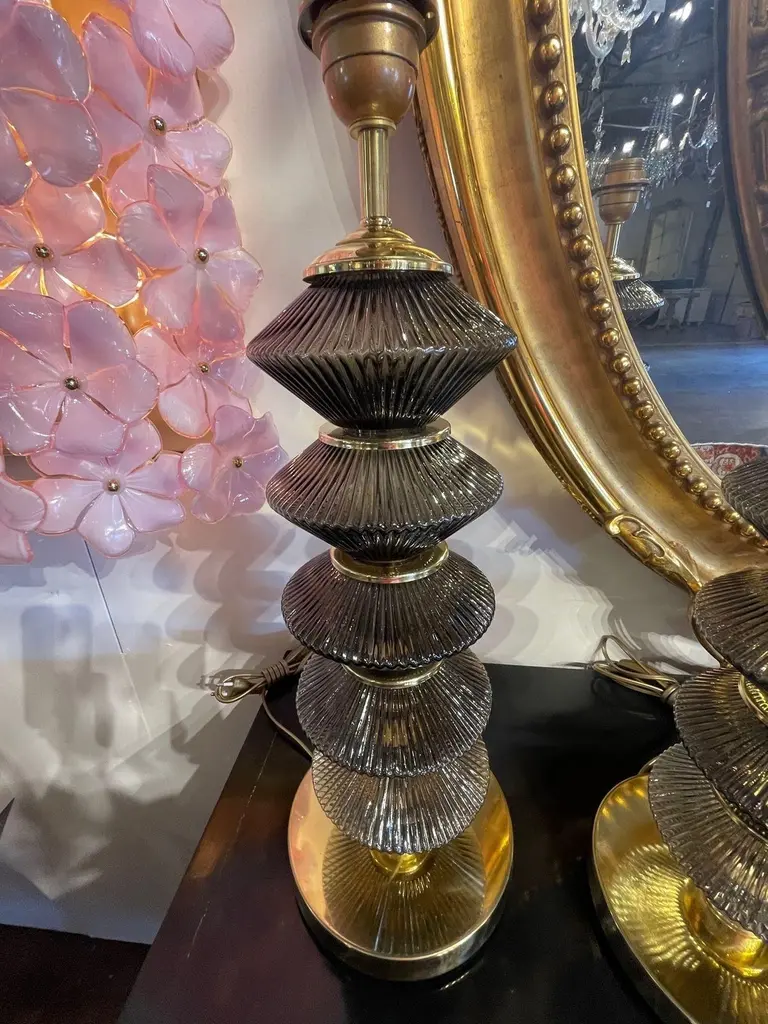 Pair Of Modern Smoke Colored Murano Glass And Brass Lamps