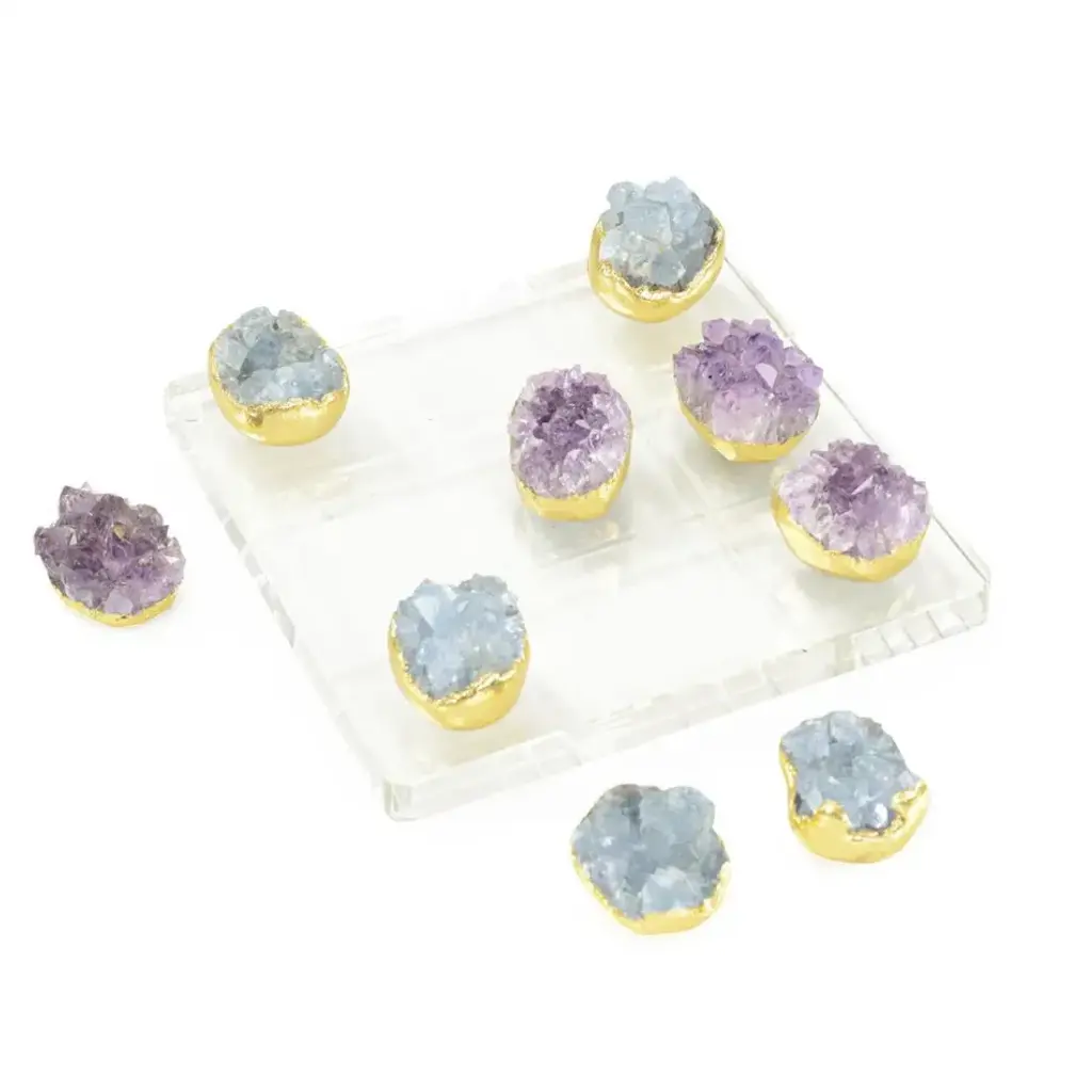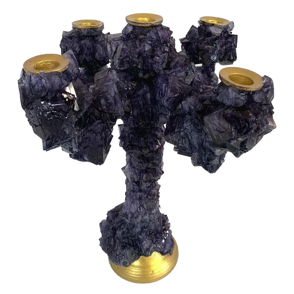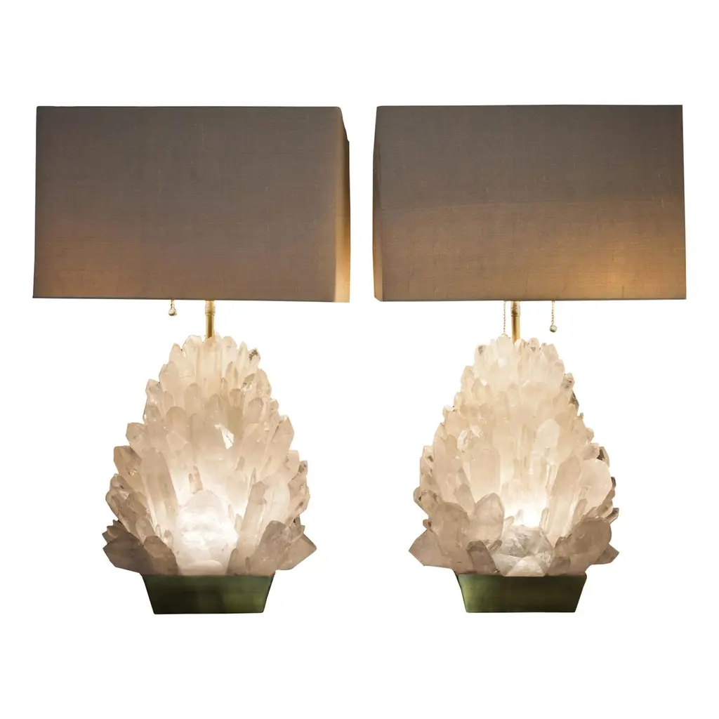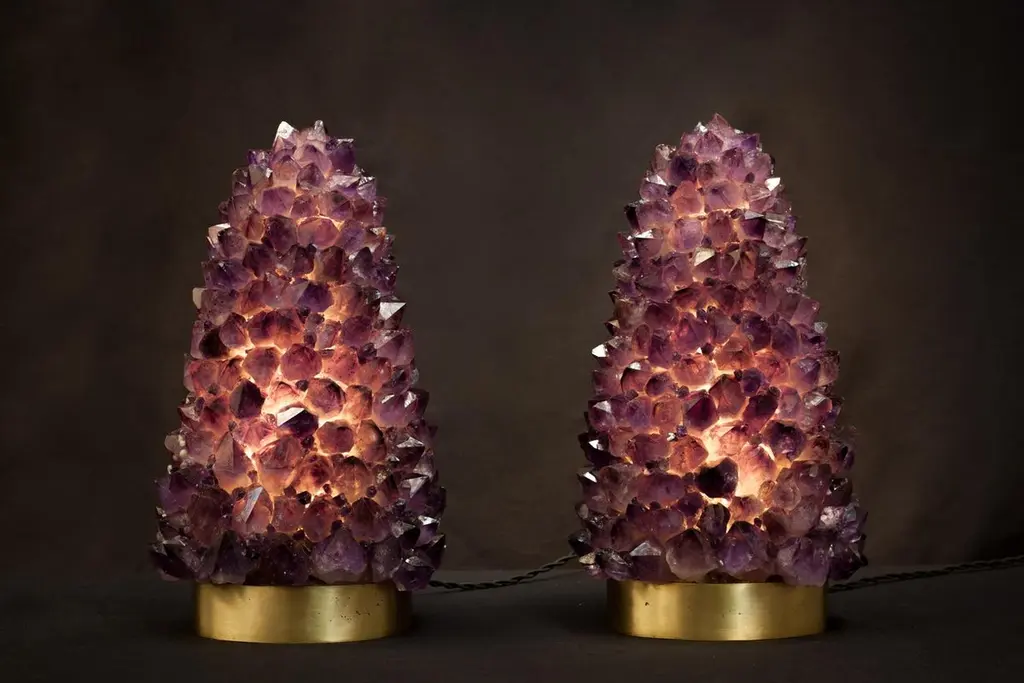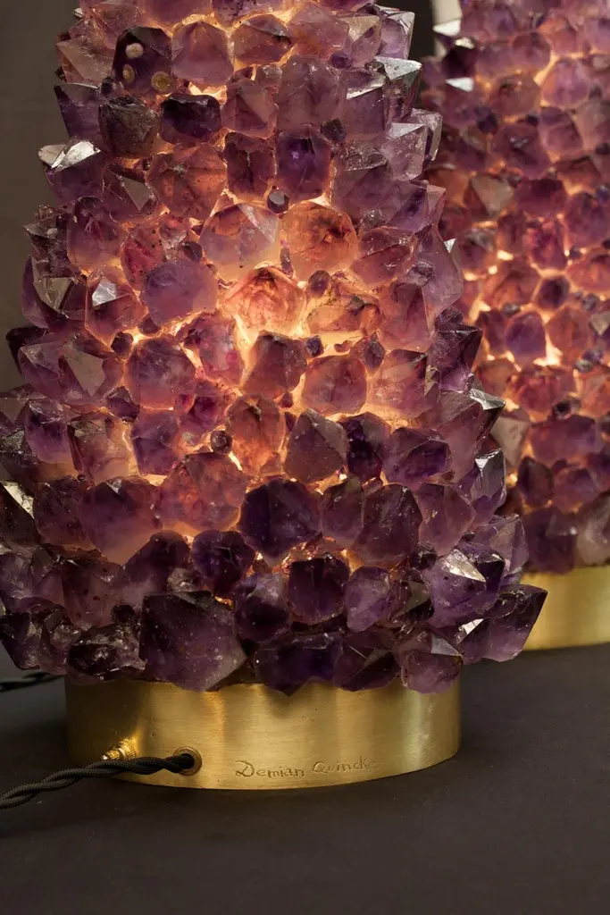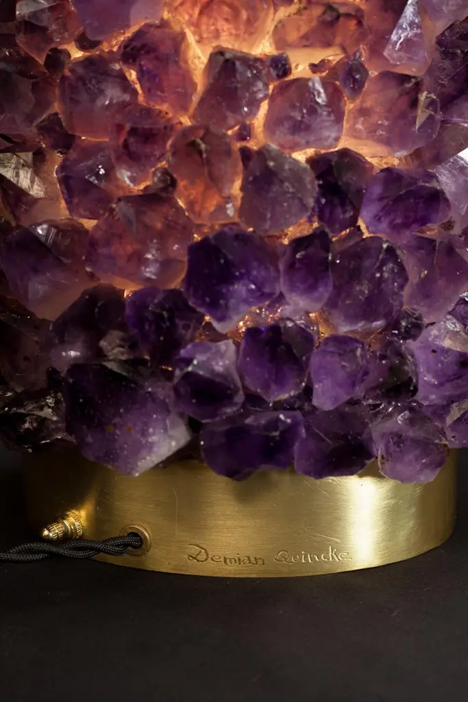 Pair of natural amethyst table lamps-signed by Demian QuinckeAurea natural amethyst assembled and sculpted on casted oval brass baseDimensions: 45 x 27 x 17 cm.5W LED lightBi-Volt 100-240V 38A and 8ft long black twisted 18 Gauge / SPT-2 type UL listed twistedPower cord with antique style phenolic plug. Wire and power cord assembled in theUSA. UL listed file number E35522516 kg eachDemian Quincke develops unique handmade decorative objets d’art from precious stones that are carefully selected and perfectly fitted together, creating amazing forms of brilliance and beauty. The final appearance is like a bouquet of beautifully illuminated flowers, rendered in natural quartz, unfolding their petals.Demian’s artistry is a product of hard work, natural ability, and the unique artistic and cultural environment in which he was raised. Born in France to Uruguayan parents, Demian was exposed early to art by his artist mother and his father, who was a merchant in high decor and antique objects.When Demian was two years old, he relocated with his family to Uruguay, which began the process of broadening his world-view and developing his multi-cultural identity. After stops in California and Germany, he eventually arrived in Brazil at the age of 14, with an appreciation for the wide expanse of the world and his place in it.From the outset of his career, Demain worked to developed his unique style of artistic expression, all the while learning from other artists through observation. In 2010, upon returning from a study tour and research in New York City, he began to create, develop and produce his own pieces.In love with the natural beauty of semi-precious Brazilian stones, Demian uses them as the predominant material of his work. With them, he creates objects d’art that remind the viewer of the Earth’s natural beauty, even though the material has been transformed by his artistry. Internal or external lights enhance the brightness and beauty of the stones, and highlight their artistic metamorphosis.