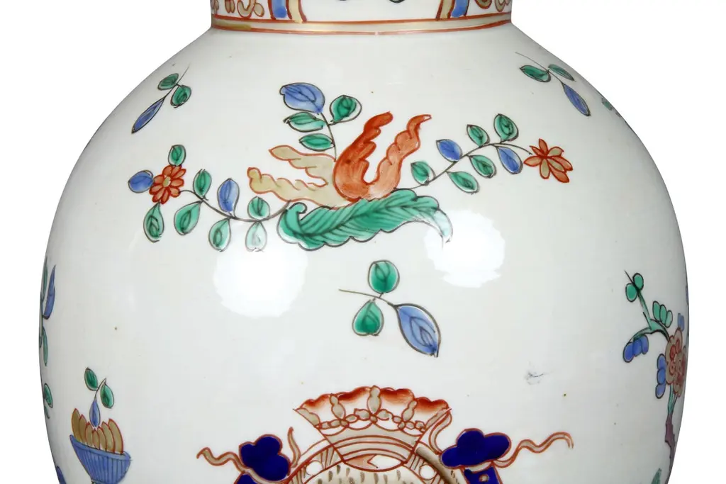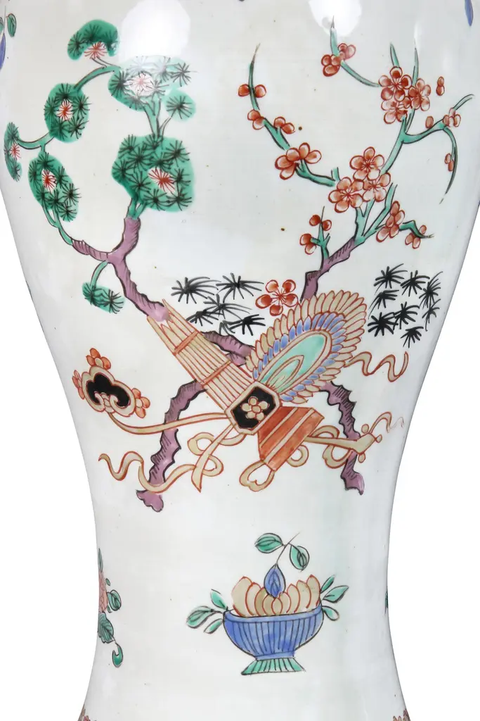 Baluster form decorated with a central crest with overall reds, greens and blues.