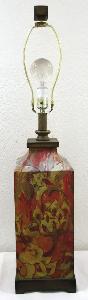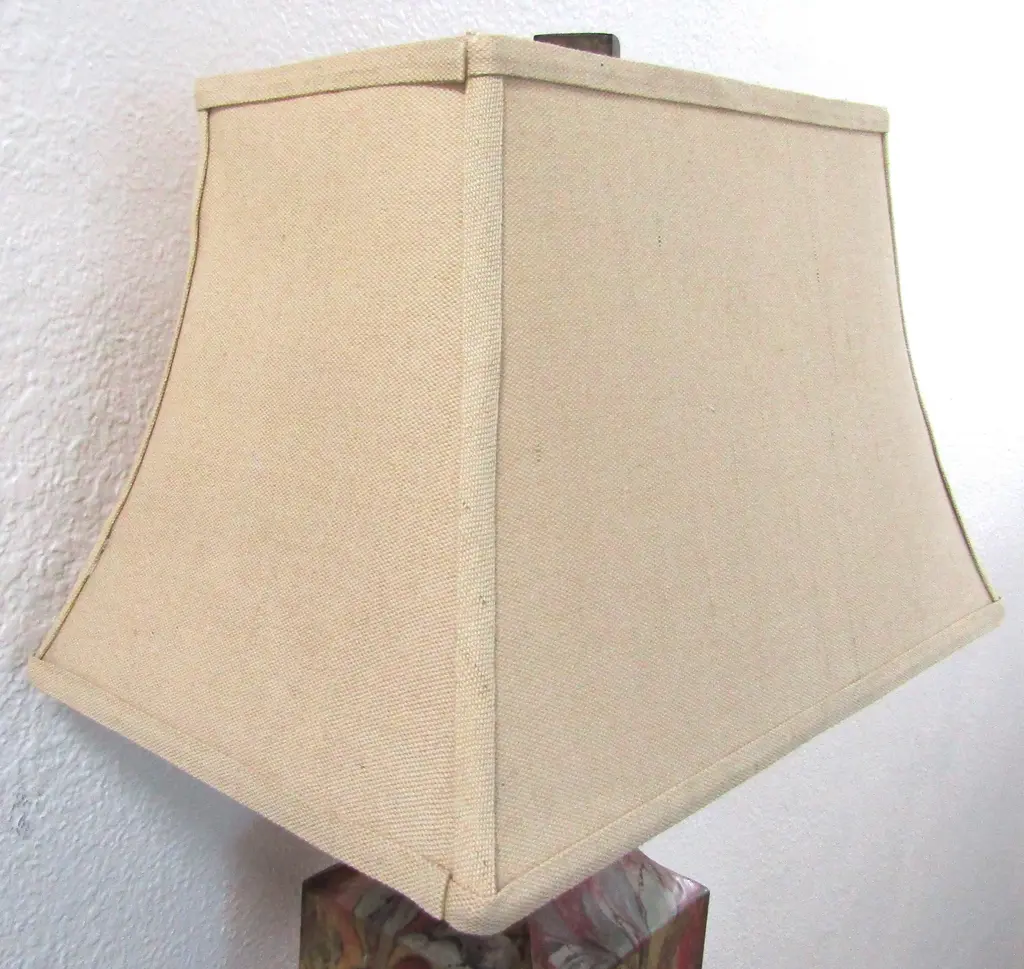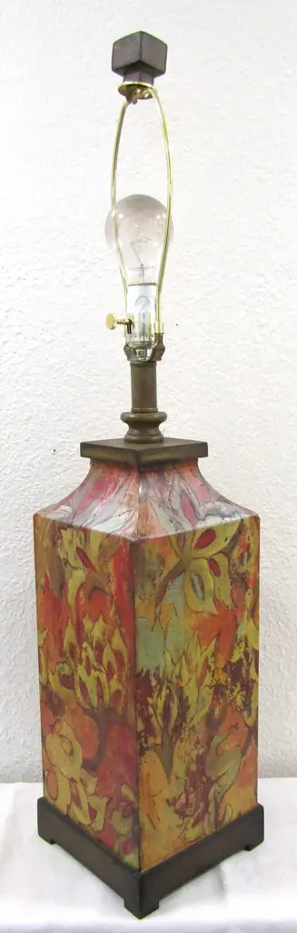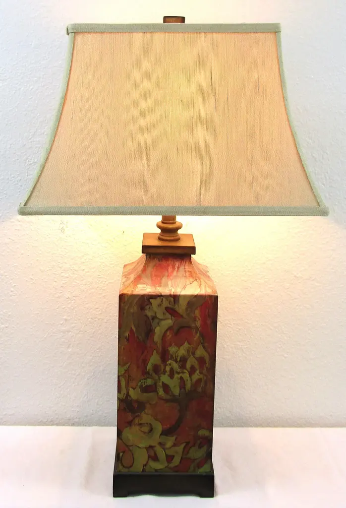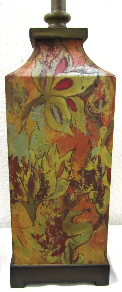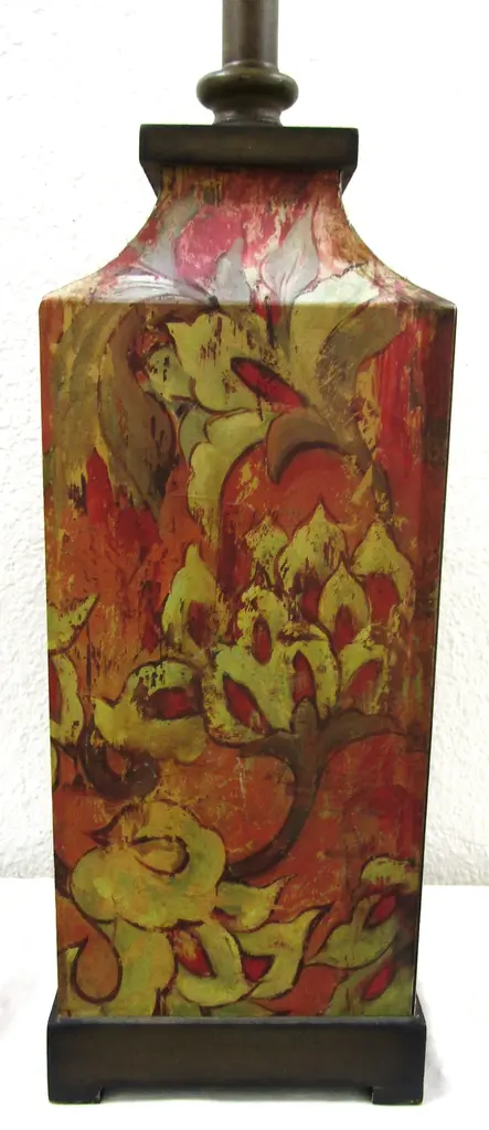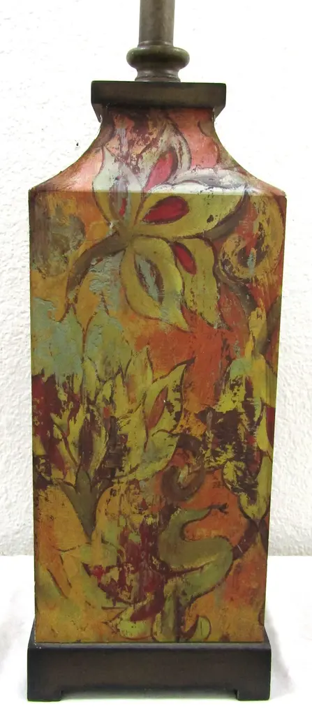 Pair of Designer Uttermost 27678 Colorful Flowers Print Boutique Distressed Wood Table Lamps Material: Premium Compressed Hardwood Color/Finish: Colorful Flower Print With Burnished Walnut Finished Details. Heirloom Quality - Expertly hand crafted and hand finished Colorful Flower Print With Burnished Walnut Finished Details. The Rectangle Bell Shade Is An Ivory Linen Fabric. Each measures 7" square and 32" tall. Each lamp shade measures 18" long, 12" wide and 11 1/4" tall.