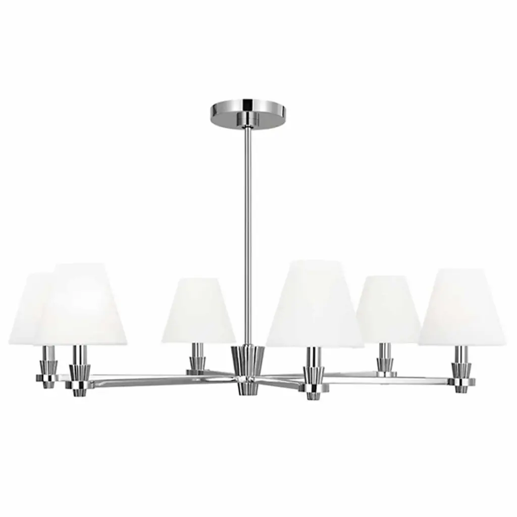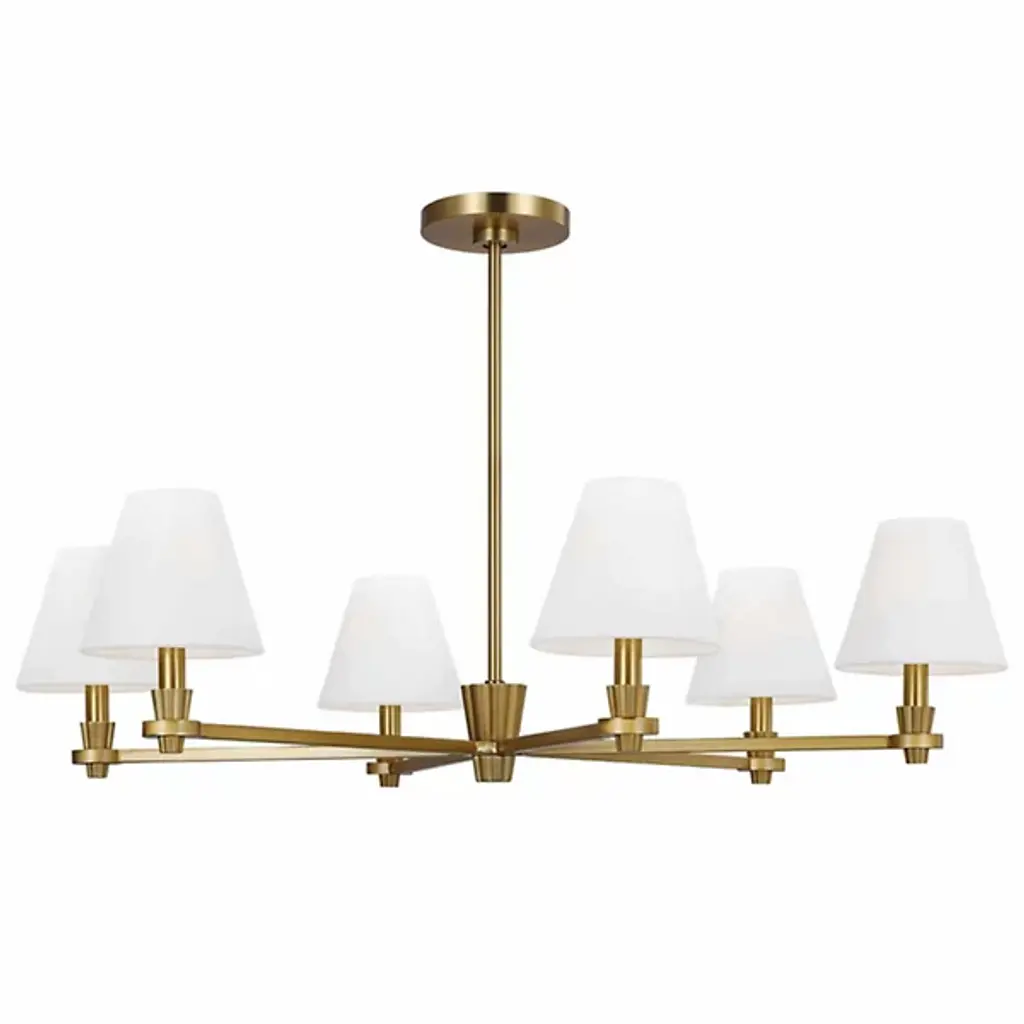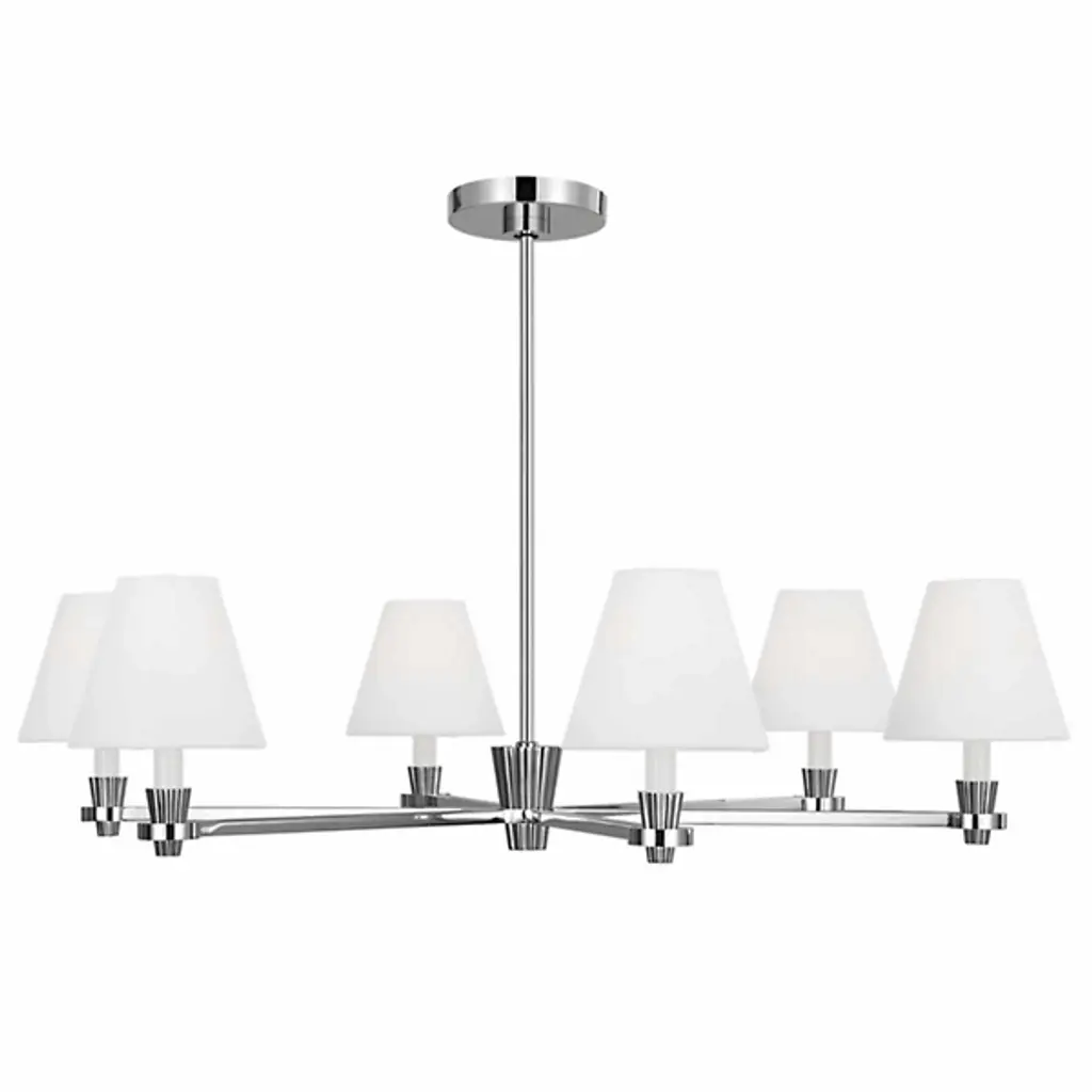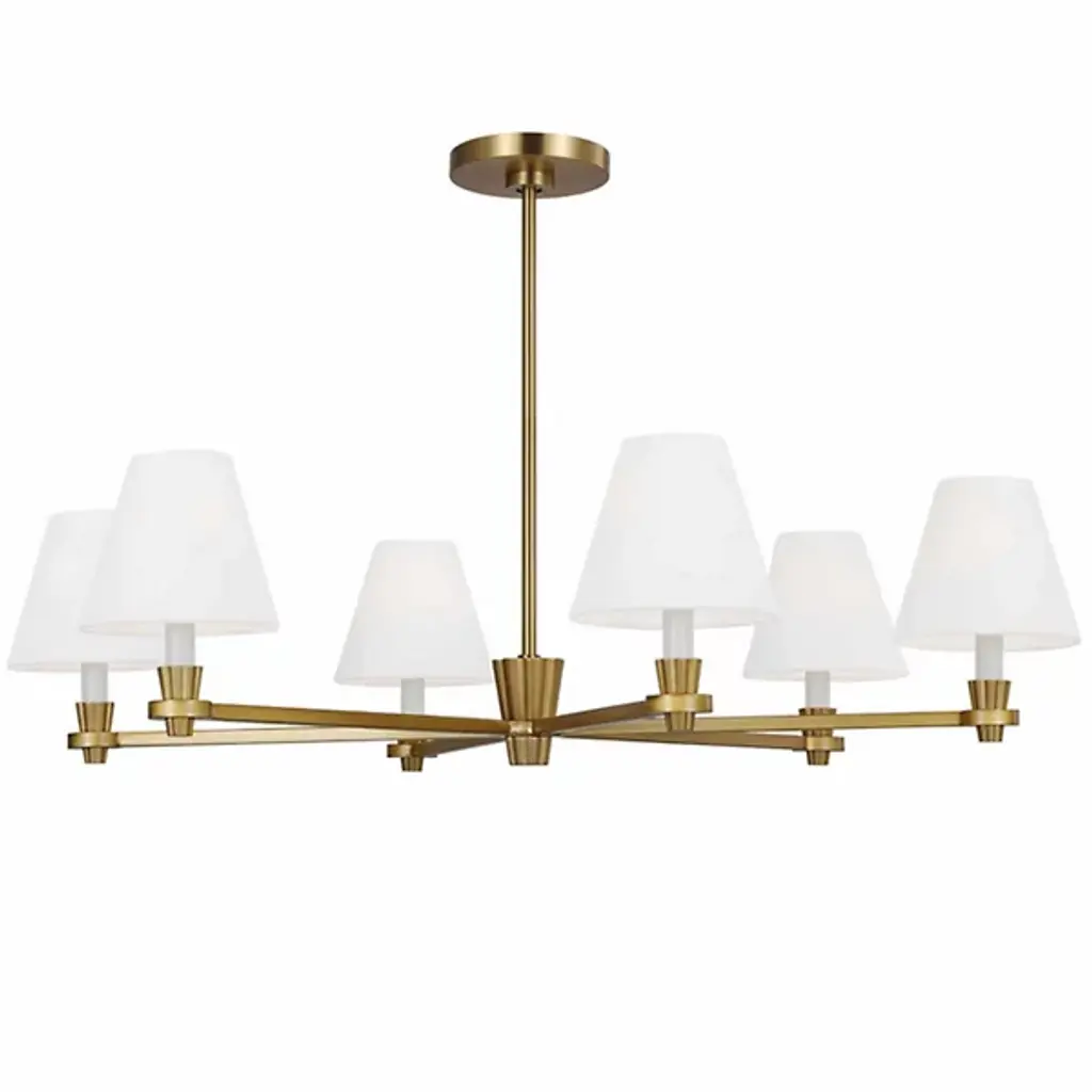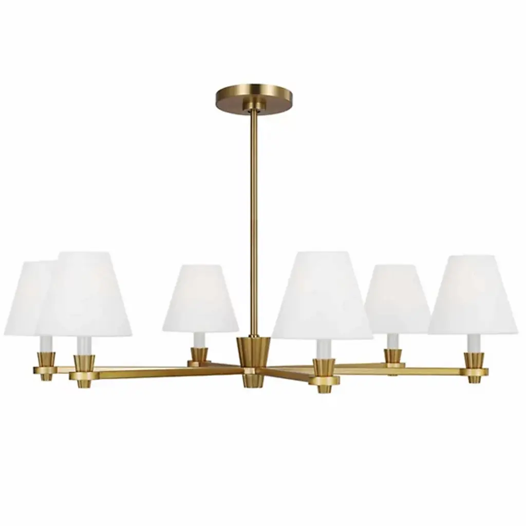 Enchant interior spaces with the smooth lines and open design of the Paisley Chandelier from Visual Comfort Studio, formerly known as AH by Alexa Hampton, This sleek structure starts with a circular canopy, descending along a slim central stem and terminating in a beveled conical hub below that sends out slim crossbars to each side, each arm ending in a smaller version of the central hub that seats candelabra style lamping. A smooth linen shade flares out and around each candelabra-style lamp, glowing from within with an expressive style while casting direct downlight through each open base.