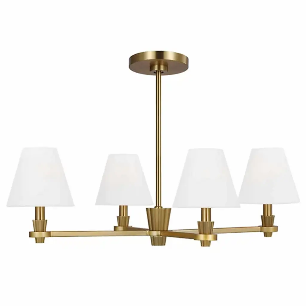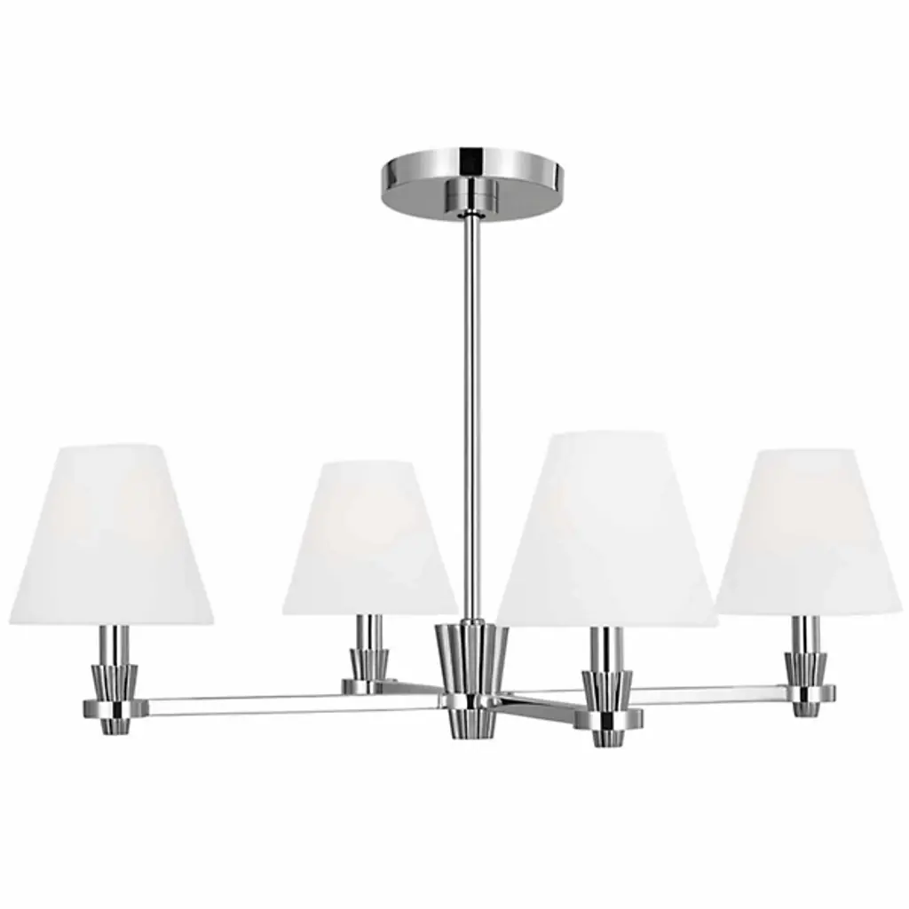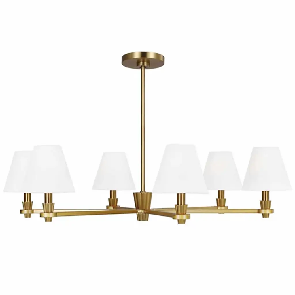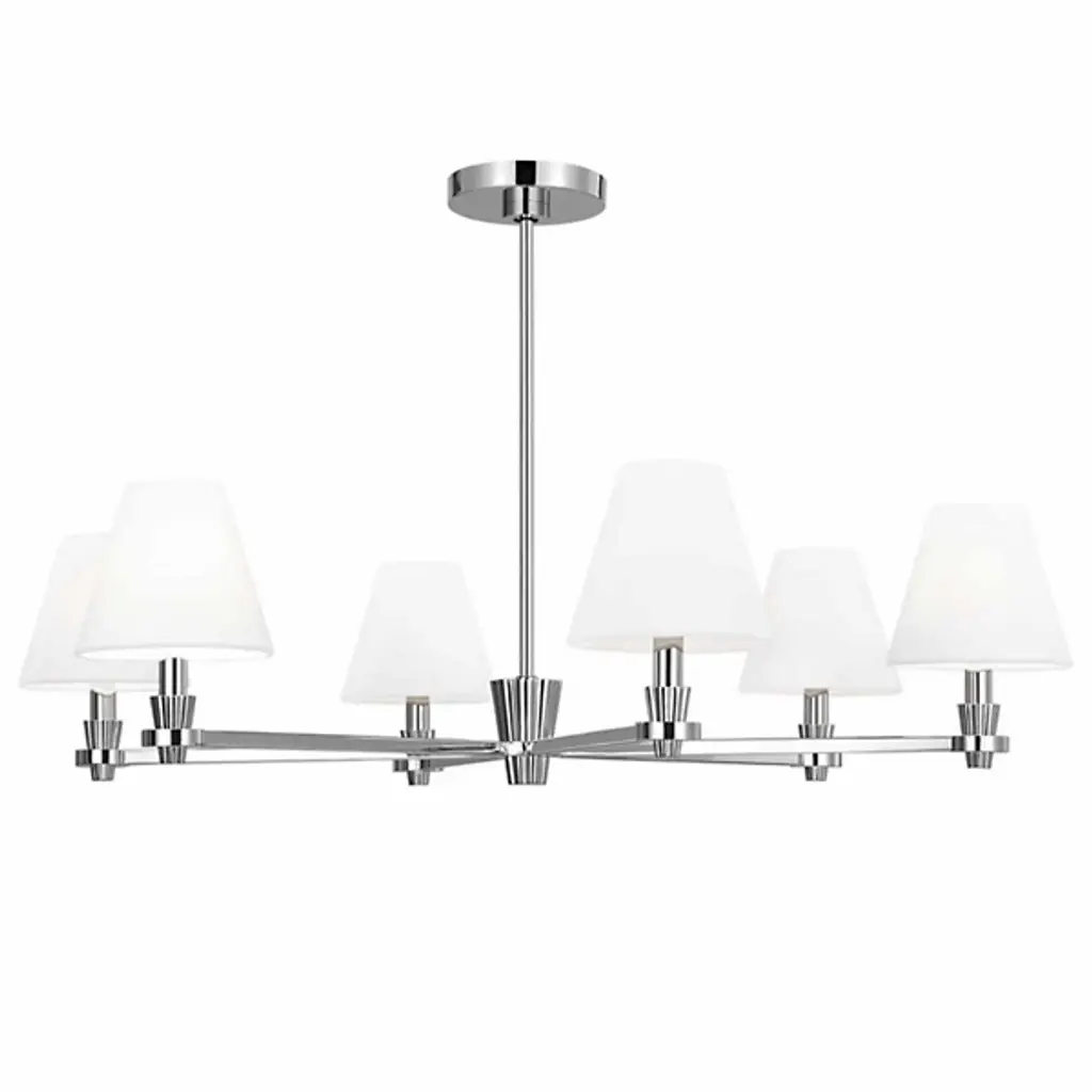 Enchant interior spaces with the smooth lines and open design of the Paisley Chandelier from Visual Comfort Studio, formerly known as AH by Alexa Hampton, This sleek structure starts with a circular canopy, descending along a slim central stem and terminating in a beveled conical hub below that sends out slim crossbars to each side, each arm ending in a smaller version of the central hub that seats candelabra style lamping. A smooth linen shade flares out and around each candelabra-style lamp, glowing from within with an expressive style while casting direct downlight through each open base.