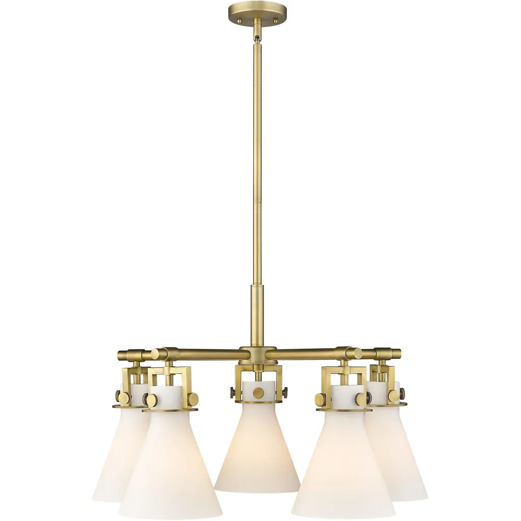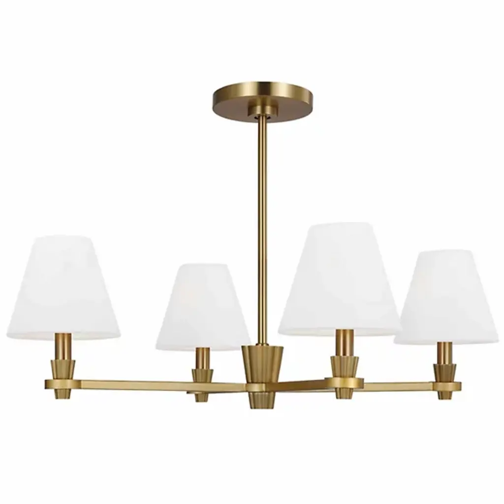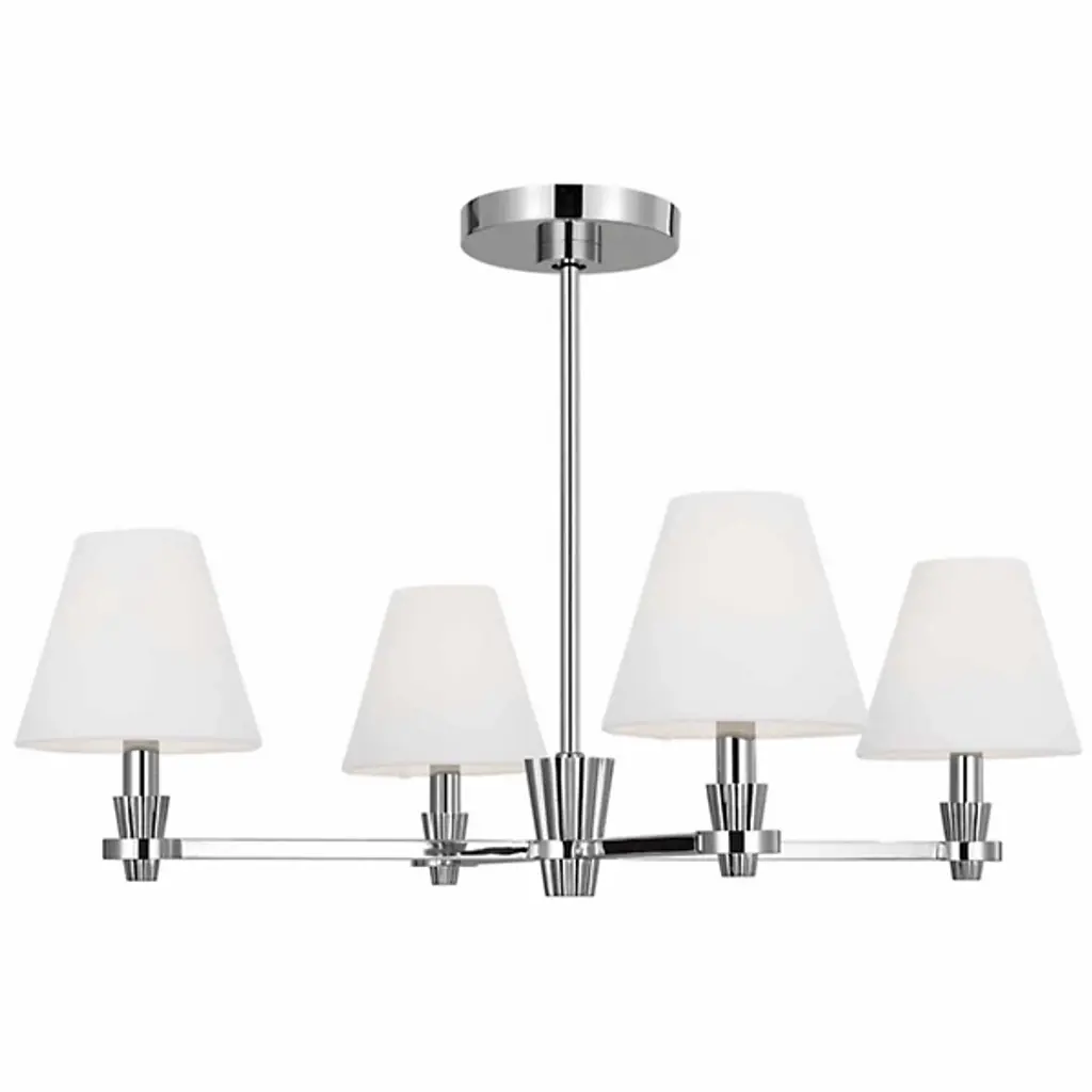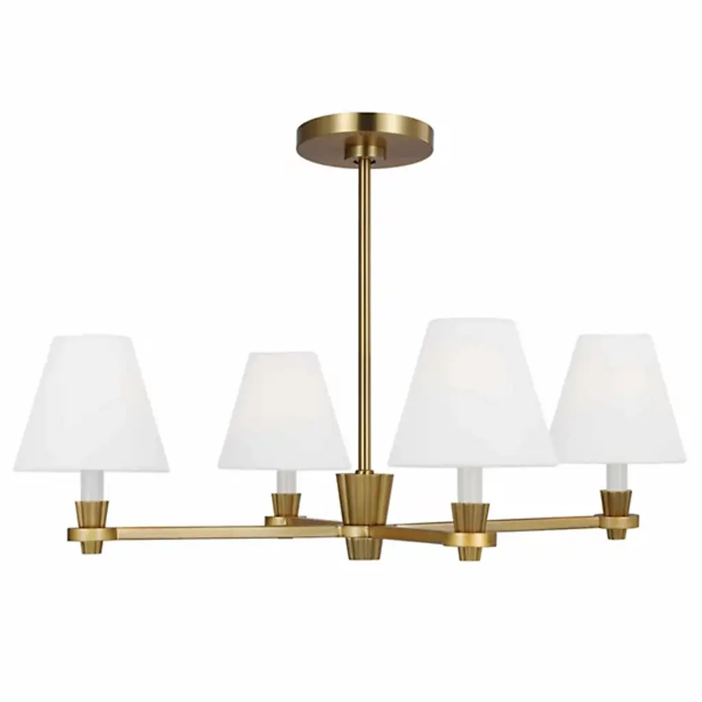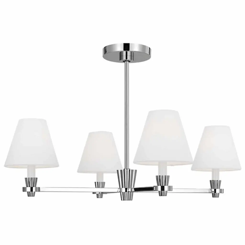 Enchant interior spaces with the smooth lines and open design of the Paisley Chandelier from Visual Comfort Studio, formerly known as AH by Alexa Hampton, This sleek structure starts with a circular canopy, descending along a slim central stem and terminating in a beveled conical hub below that sends out slim crossbars to each side, each arm ending in a smaller version of the central hub that seats candelabra style lamping. A smooth linen shade flares out and around each candelabra-style lamp, glowing from within with an expressive style while casting direct downlight through each open base.