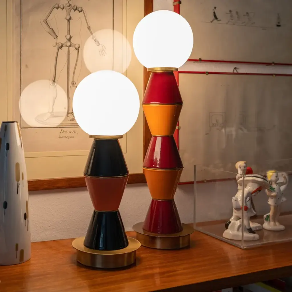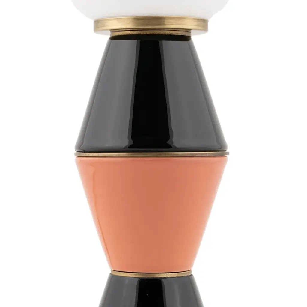 Sophistication distinguish the small Palm table lamp. The structure comprises a brass base and a sequence of three ceramic elements in a contrasting colors combination, a delicate peach pink and black. A spherical satin glass works as light diffuser. Brushed brass inserts gracefully separate each conic element. Ceramic available in different colors combinations.Electr.Fitting1 x G9 Led 5W