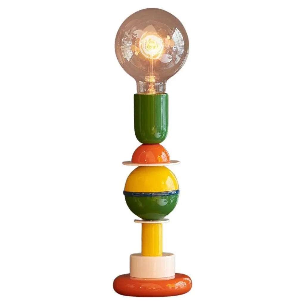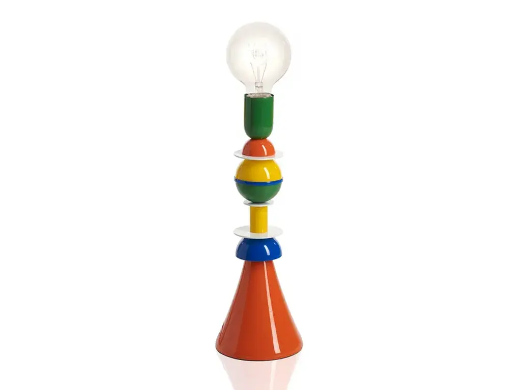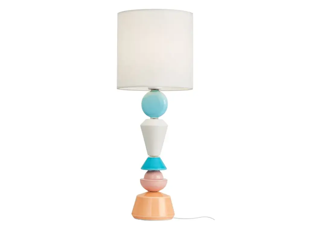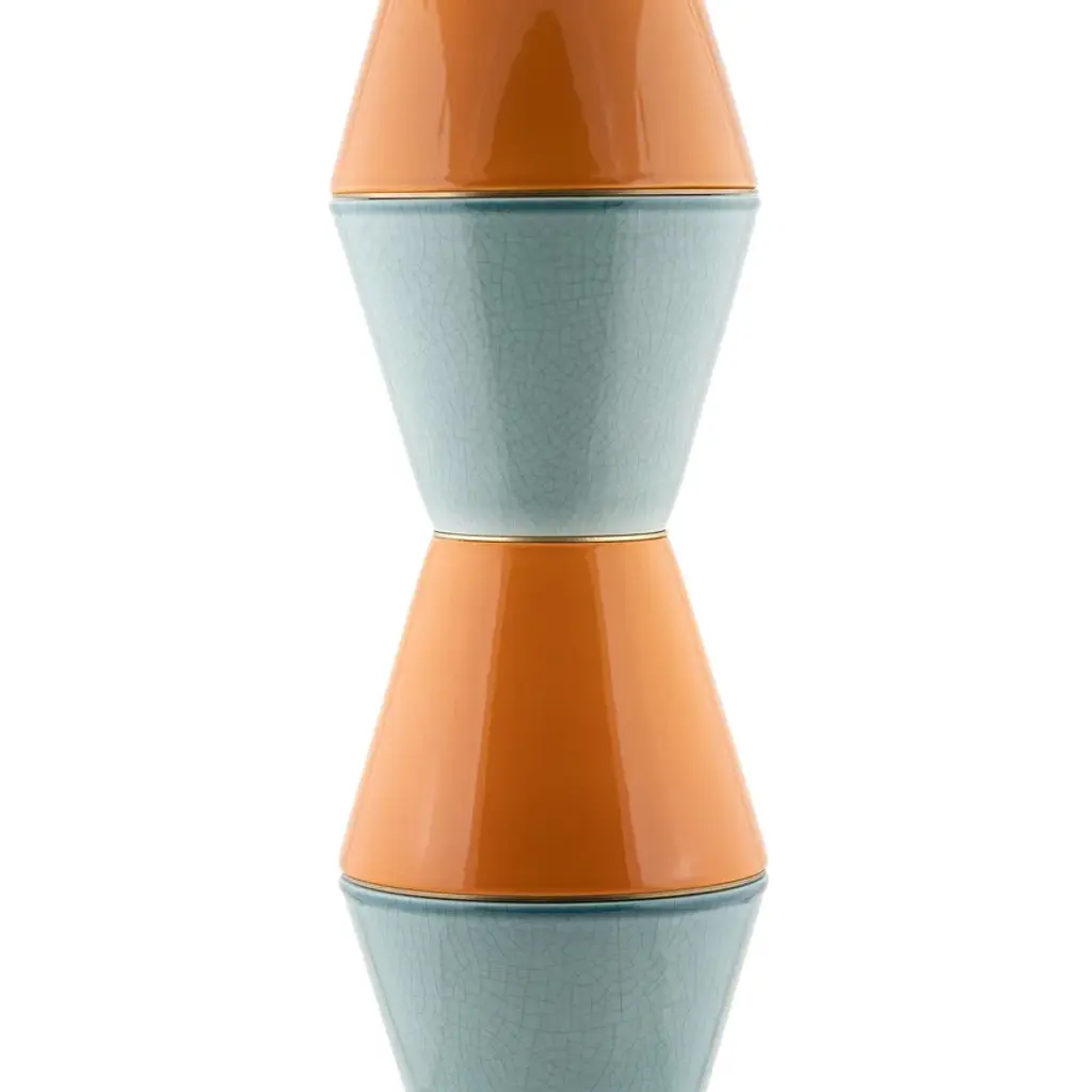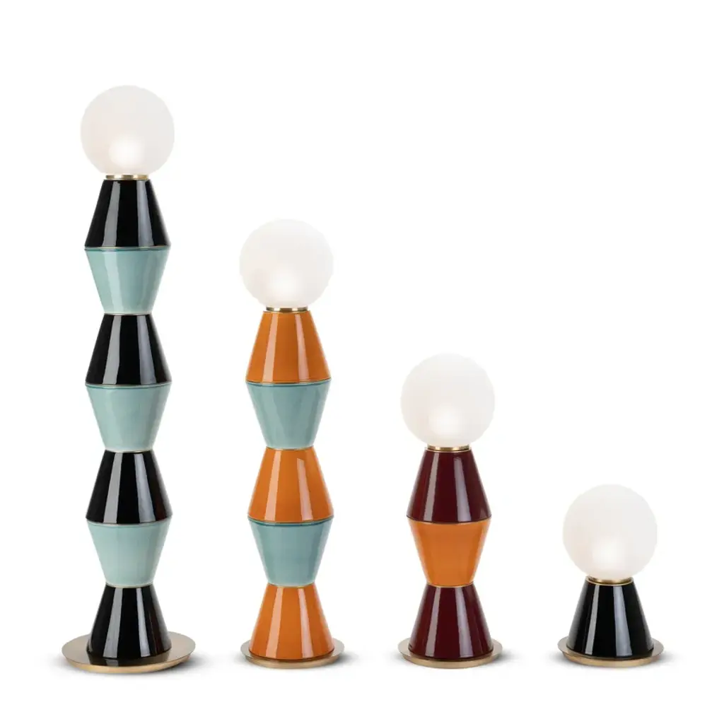 The Palm large table lamp is distinctive for its impressive geometric juxtaposition of ceramic flared elements, whose contrasting colors, delicate aquamarine and orange, create an eye-catching piece. The base, a brushed brass disk, supports the ceramic structure, which ends holding the light diffuser, a satin spherical glass. Ceramic available in different colors combinations.Electr.Fitting1 x G9 Led 10W