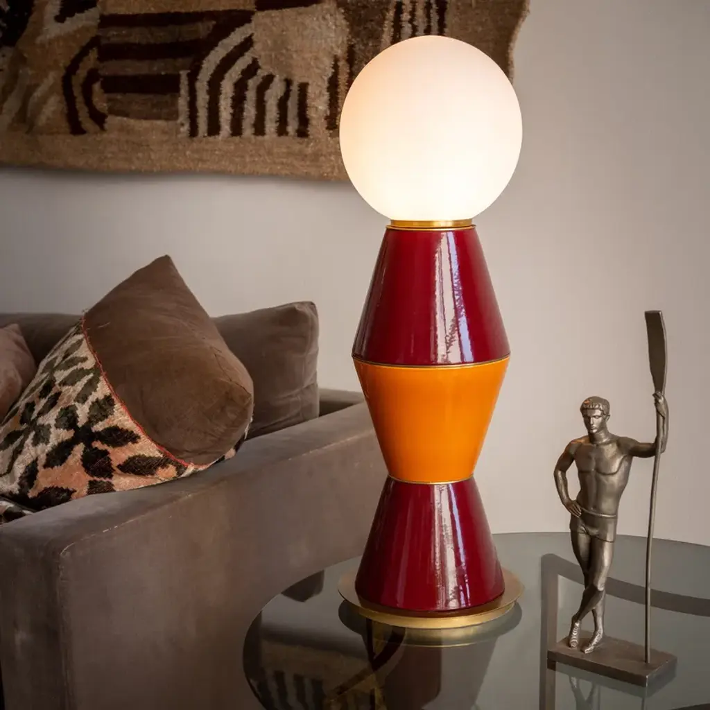 Starting from pure geometric shapes, this table lamp is a must- have for the iconic pieces enthusiasts. The simplicity of the flared ceramic elements with alternated colors, deep red and orange, contrast with the chic spherical satin glass light diffuser. Ceramics available in different colors combinations.Electr.Fitting1 x G9 Led 10W