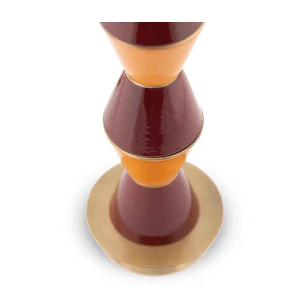 Adding a timeless touch to a modern-styled interior, this table lamp flaunts a striking sculptural silhouette of strong geometric value. Resting on a burnished brass base, the main body is composed of five truncated cone ceramic elements glazed in orange and burgundy hues, elegantly completed with a round shade in satin glass. This sculptural lamp can be color customized upon request, please contact the Concierge for details.