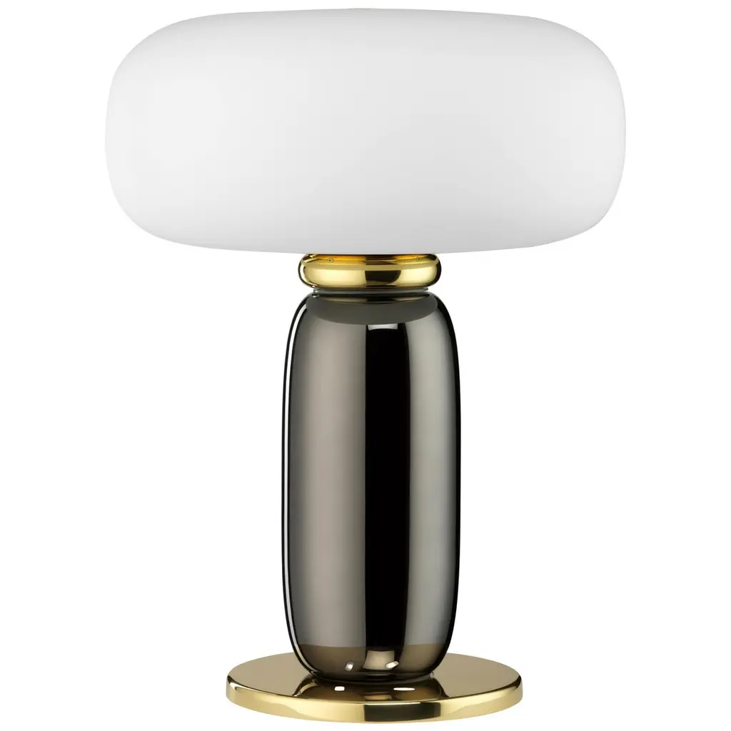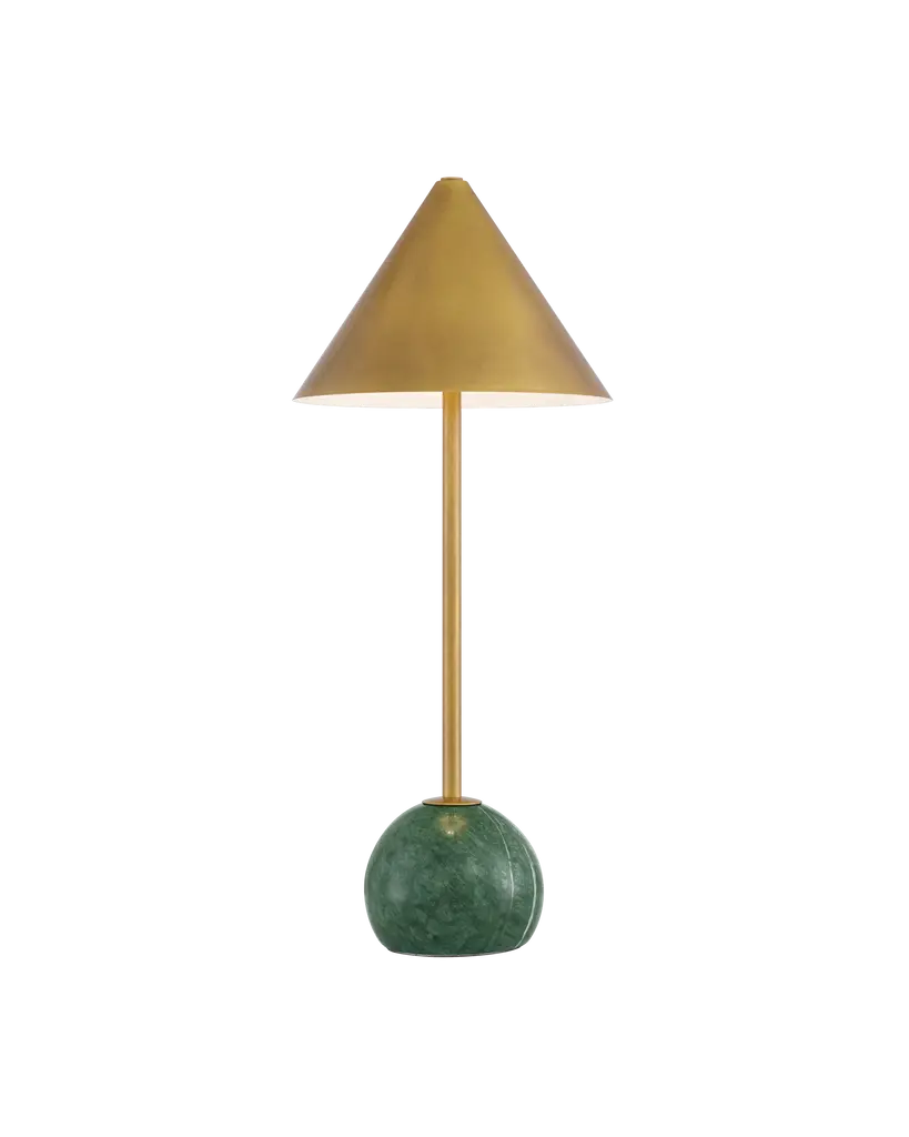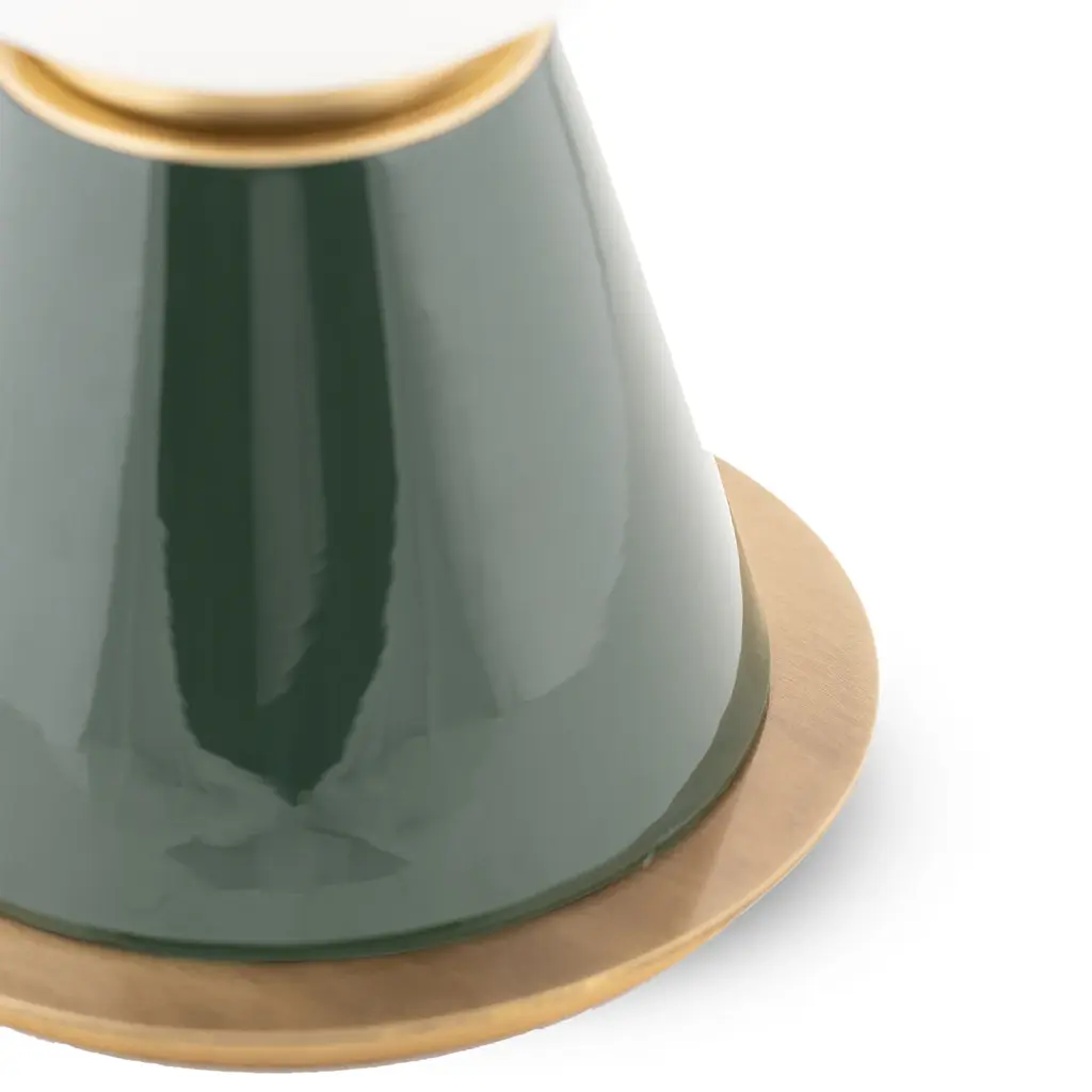 This remarkable table lamp channels unmistakable retro flair, standing out for its impeccable distribution of pure geometric volumes. The brushed-finished structure, visible in the plinth disk serving as a base, is embraced by a ceramic cone finished in glossy green that is surmounted by a spherical opaline glass diffuser hosting the light source. Perfect on a sideboard or accent table. Explore other color combinations by contacting the Concierge.