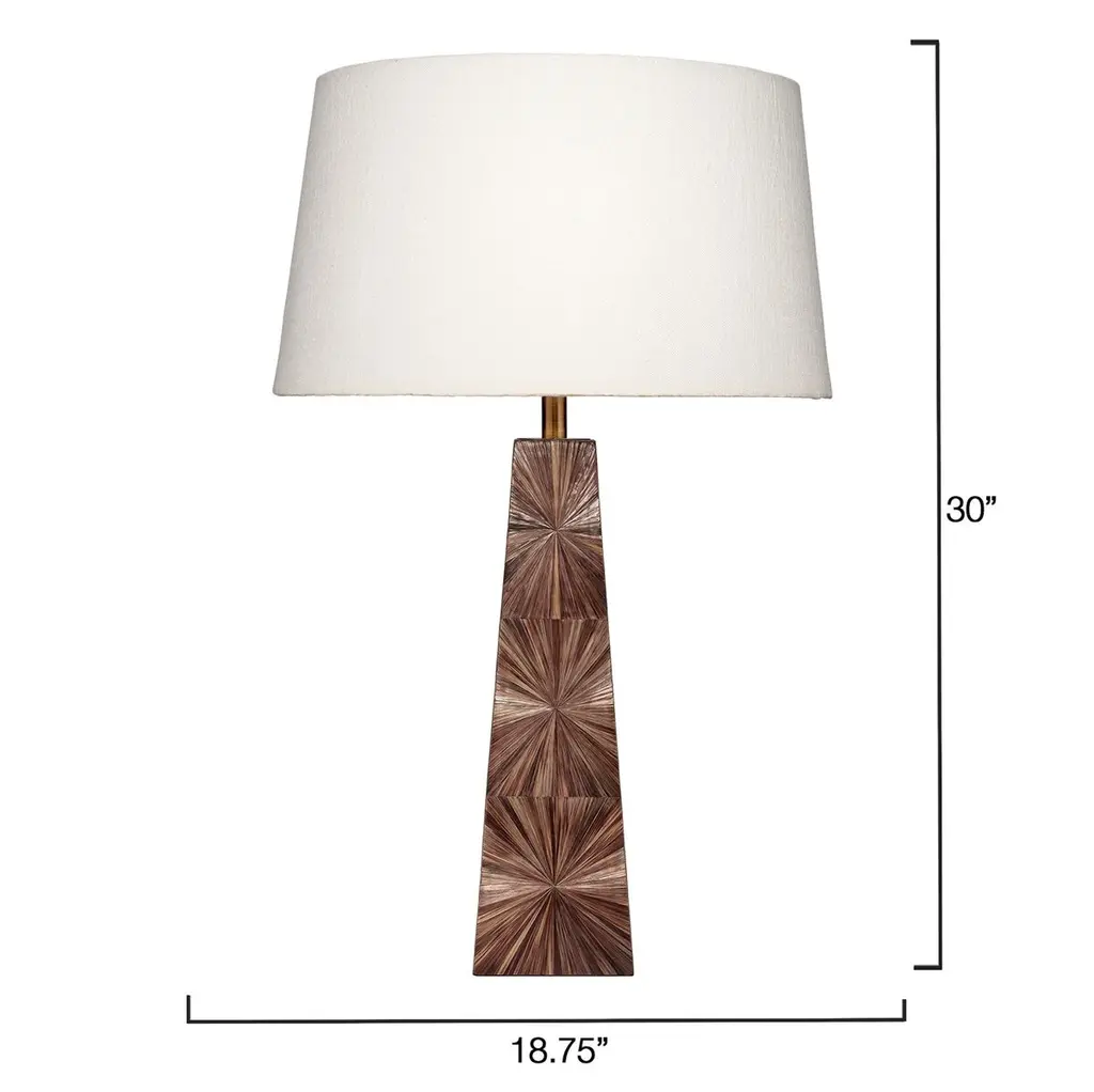 Dyed straw is expertly arranged into radiant starburst patterns to create the bright, bold base of this table lamp. Brass hardware beautifully complements the richness of the marquetry straw base. This lamp will warm up any room of the home and is ideal for a reading nook or entryway!