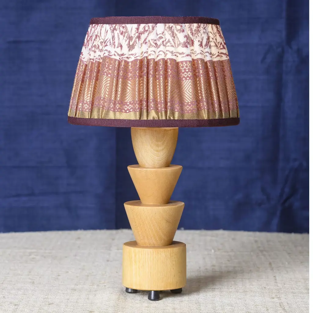 The palmetta table lamp features a sculptural design with a stacked geometric base in maple wood and a distinctive bordeaux silk lampshade printed with a unique cotton pattern. The medium-sized lamp presents an organic silhouette that blends modern form with natural warmth, making it a refined addition to interior lighting. Each shade is crafted from one-of-a-kind cotton printed silk, offering individual character and subtle elegance. Bulb not included.