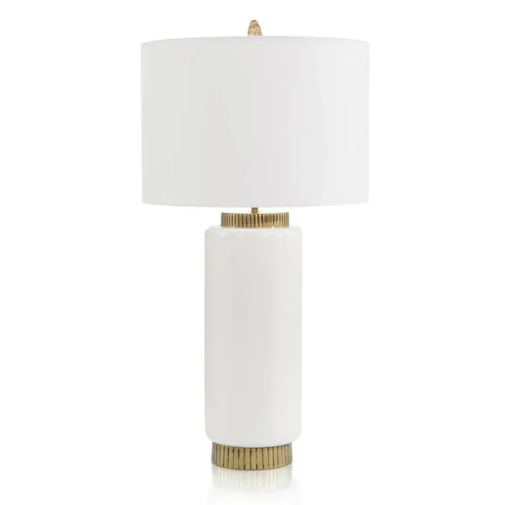 The Paloma Table Lamp is a gorgeous piece that blends soft edges and rounded shapes with opulent accents. The cylindrical body is crafted from enameled metal in a white powder-coated finish, imbuing the piece with a regal personality that demands attention within a space. The round base in an antique brass finish features vertical striations throughout, resulting in alluring textural interplay when paired with the smooth body. Further brass accents can be seen at the neck and finial, completing the look of this three-way turnkey lamp.