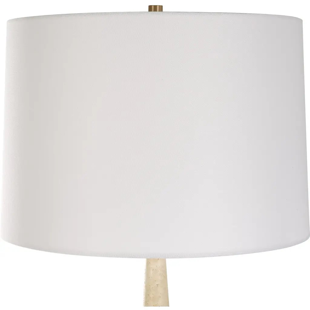 This Table Lamp Combines Modern Silhouette With Organic Textures And Materials Featuring Two Cone Shaped Pieces Of Light Beige Travertine Separated By Iron Details Finished In Plated Brushed Brass. The Slightly Tapered Round Hardback Shade Is Covered In White Linen Fabric.
