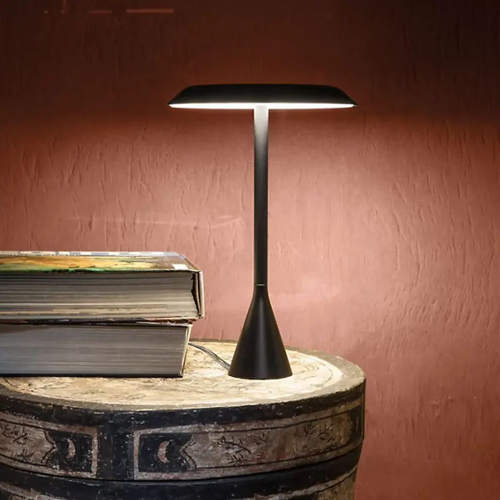 The Panama Mini LED Portable Lamp from Nemo provides soft, diffused light for any space, making it ideal for both home and work environments. Crafted from sleek aluminum and fitted with a polycarbonate reflector with an anti-glare finish, it provides comfortable, eye-friendly illumination. Designed for convenience, this lamp is cordless and powered by a rechargeable battery that lasts up to 10 hours on a single charge, with a full recharge taking about six hours.