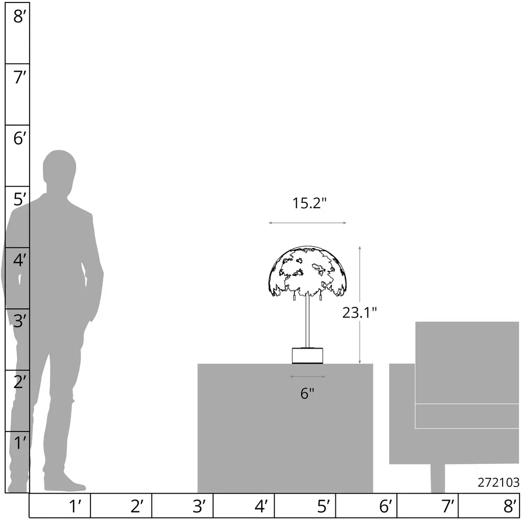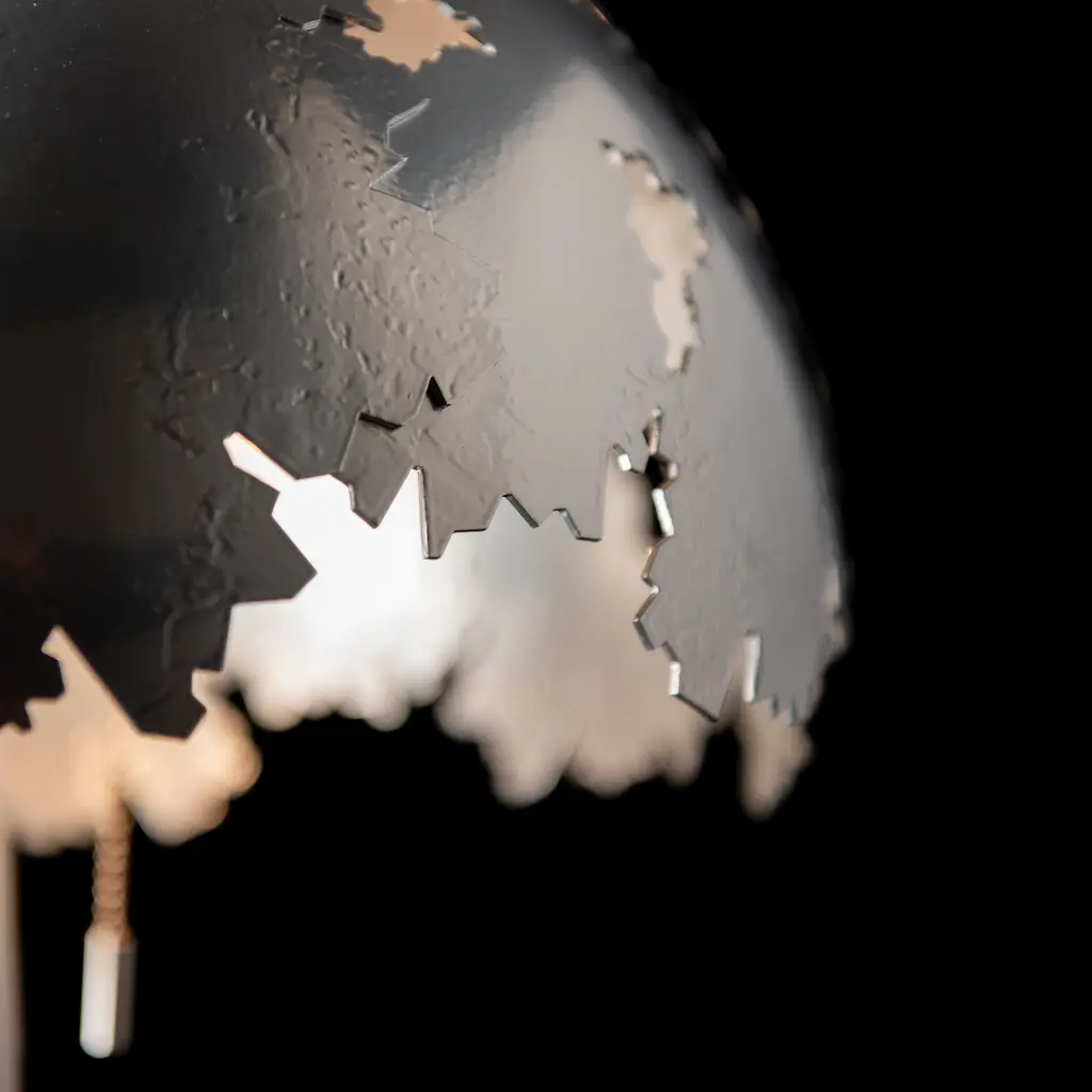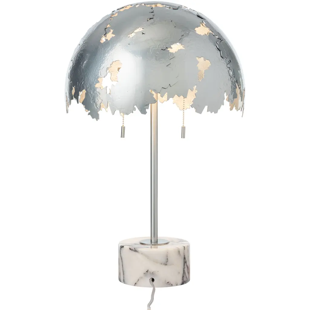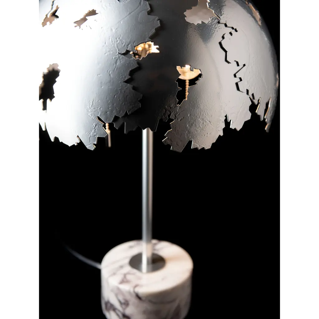 According to designer David Martin, the Pangea Dome Table Lamp features a hand-forged shade referencing the historic breakup of the supercontinent millions of years ago, grounded by its exquisite black or lilac marble base for a small footprint. Chain-pulls for its two medium-base bulbs add function with style.