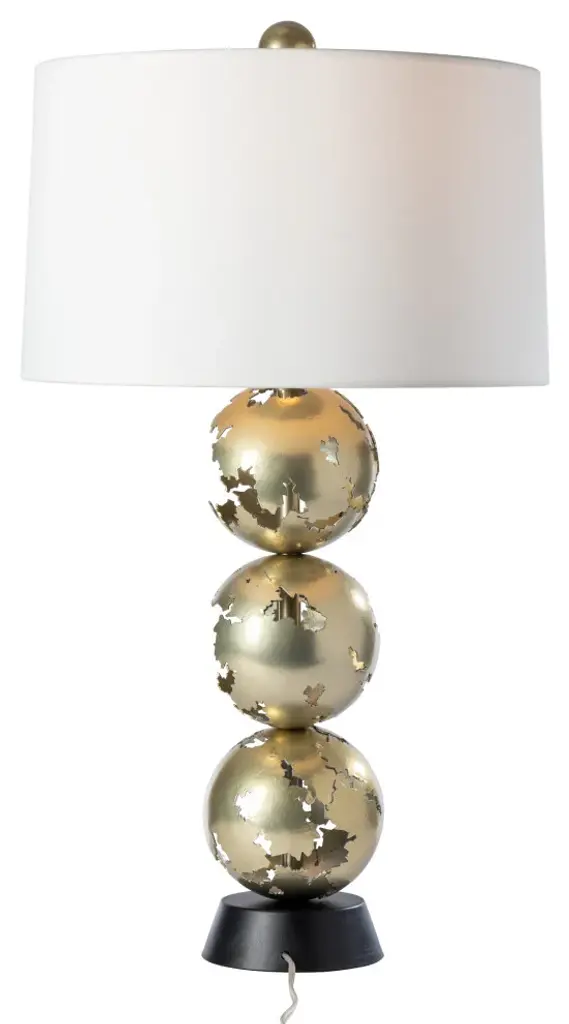 With a trio of stacked, earth-like brutalist spheres made of hand-forged plates that collide and merge, the Pangea Tall Table Lamp is a conversation piece in any space. Its height makes for a perfect side or console lamp. An attention-getter, the ancient history of the drifting continents comes to life in the Pangea. Two-tone look available, with the base in the same or a contrasting accent finish.Features:Handcrafted in Vermont, USALifetime Limited Warranty when installed in residential settingSculptural table lamp with fabric shade and dimmer switch on the socket.Requires 1 x 60 watt Replaceable LED bulb (not included).