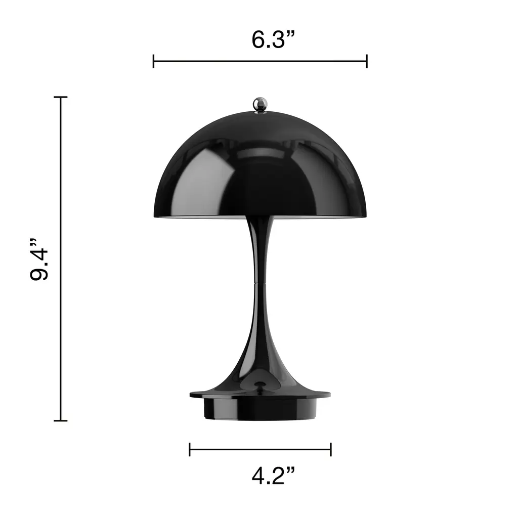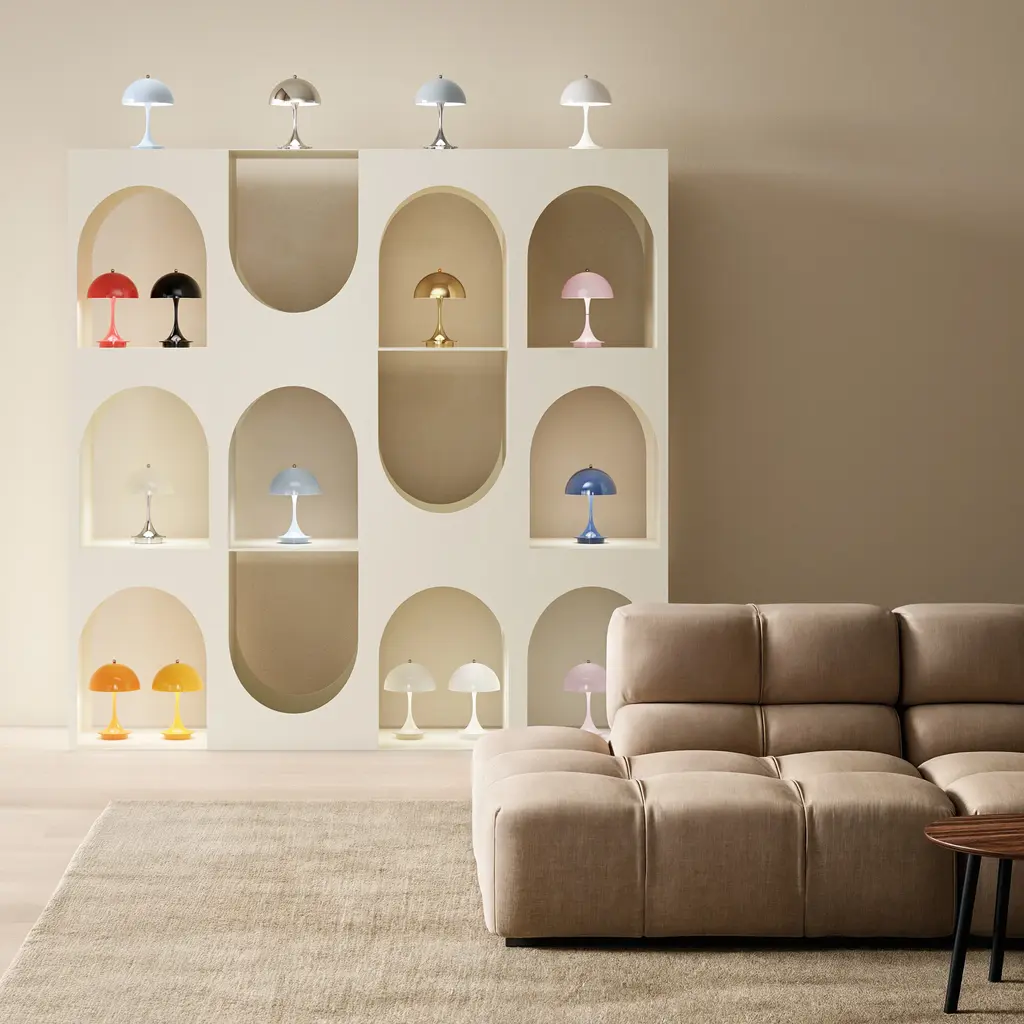 Produced to commemorate the 50th anniversary of Verner Panton’s original 1971 Panthella floor lamp design, this Panthella 160 Portable Table Lamp has a white finish. A wireless design that’s charged via USB-C, the Panthella Mini Portable directs light downwards. The light is then reflected around the room by the lamp’s trumpet-shaped foot. This results in soft, comfortable illumination. The lamp’s 9” height allows the sculptural shape to fit smaller spaces, such as bookshelves, window sills, desks, bedside tables and other smaller surfaces. Both Verner Panton and the lamp’s manufacturer, Louis Poulsen, are represented in MoMA’s collection. Features of the Panthella 160 Portable Table Lamp include: Provides adjustable, high-quality light with built-in LED technology. Integrated LED light with 35,000 hour lifespan. Recharges via USB-C cord, included. (Wall adapter not included.) Includes rechargeable batteries 3 x AA NiHM batteries. Batteries are also replaceable. White light indicator on base when charging. Can also be induction charged via Qi wireless charger (not included). Provides 5 hours of light per charge. (Charges from 0% in 4-5 hours.) Dimmer on base offers 4 settings: 0%, 10%, 33% and 100%. The Panthella Mini Portable can be set to turn on at desired brightness level. A timer feature can be set to turn off the lamp after 4 or 8 hours. Light source: fitted LED 2700K. Shade is made from injection-molded opal acrylic with a die-cast aluminum base. To clean, wipe dust off with a dry, soft cloth. Greasy spots etc. can be cleaned with a soft cloth dampened with lukewarm water. Measures 9h x 6.3”w. Weighs 1lb. 5-year warranty.